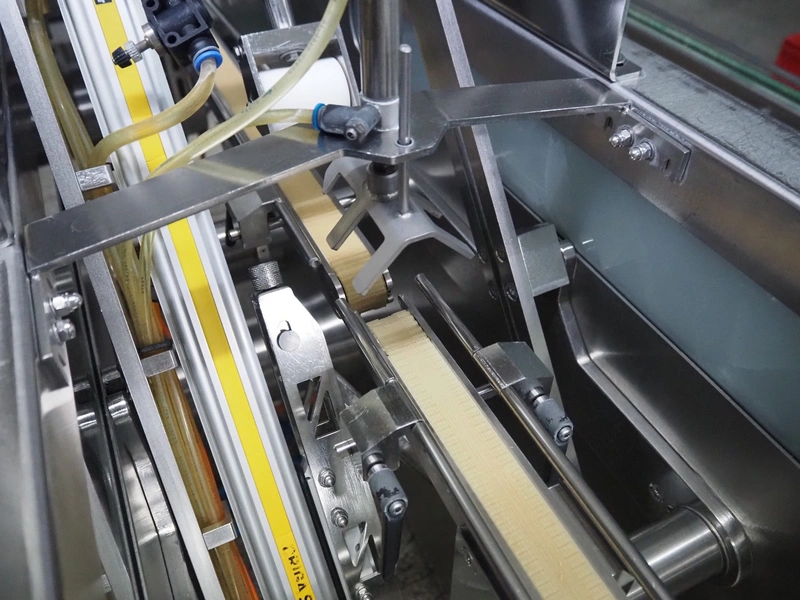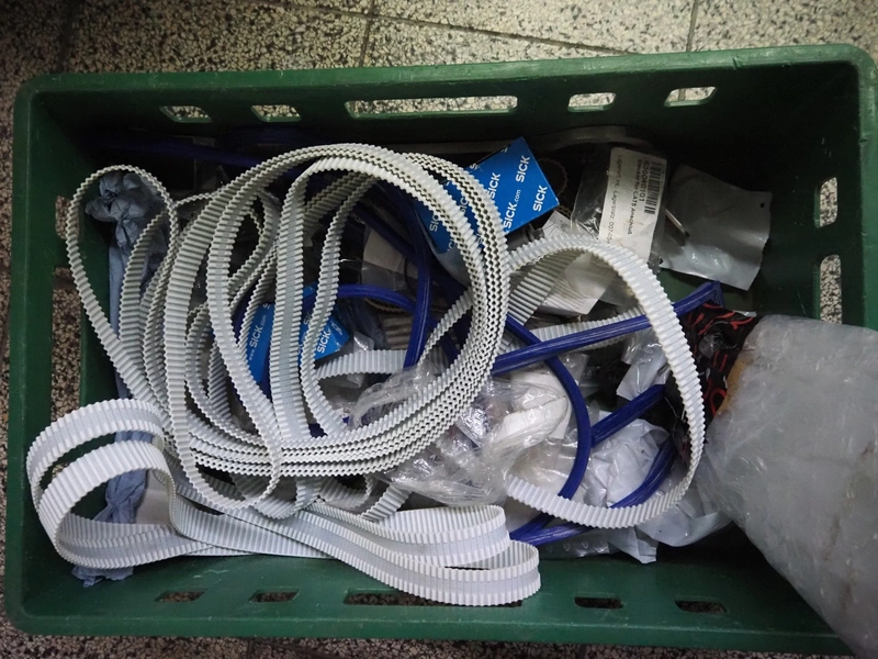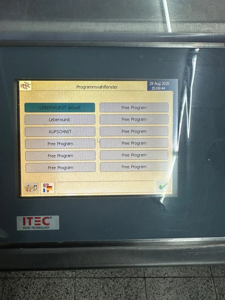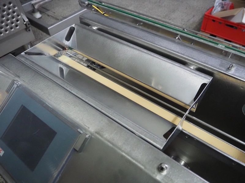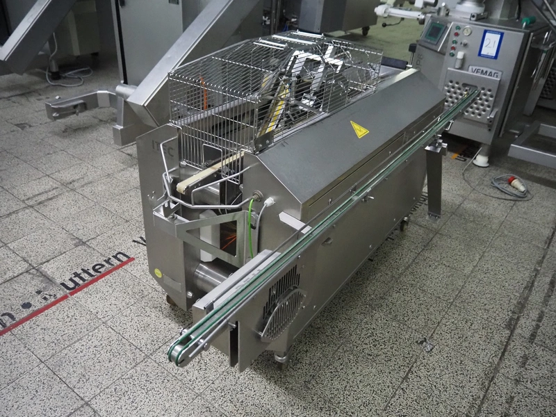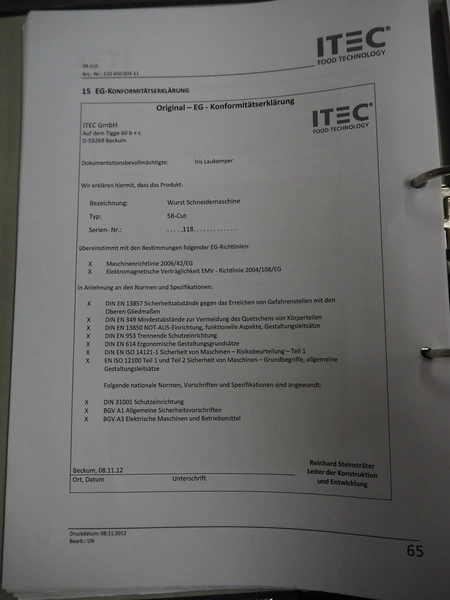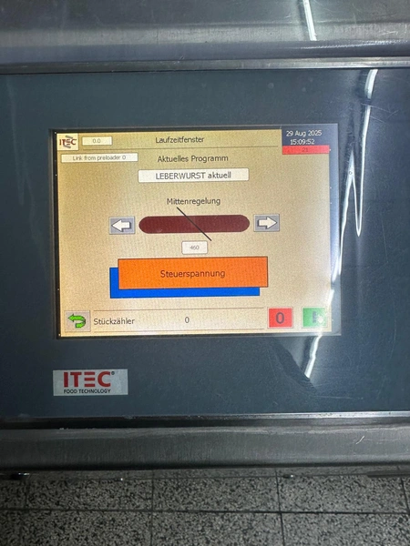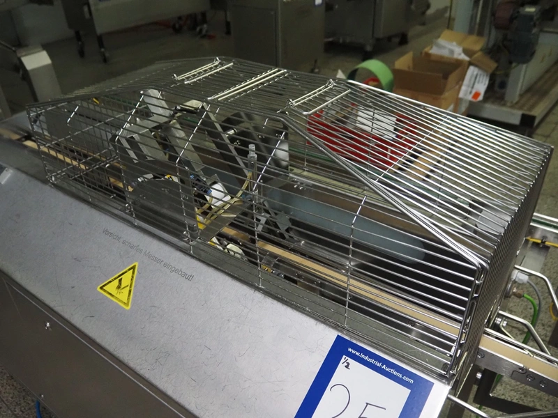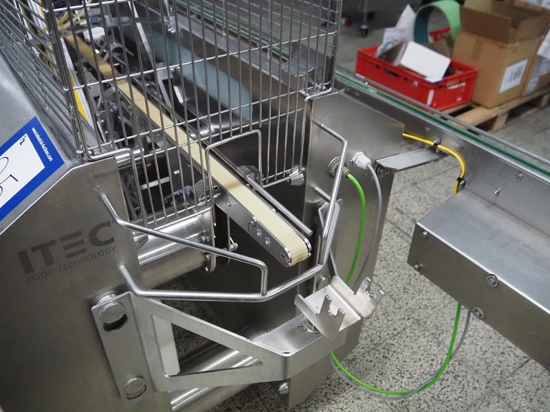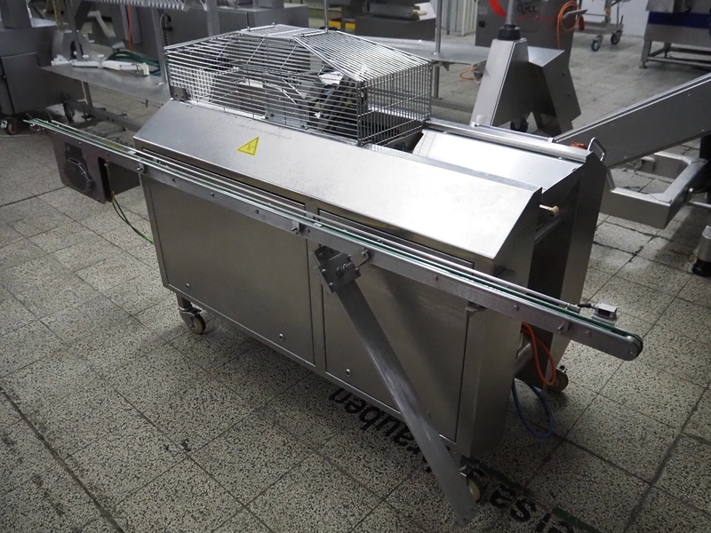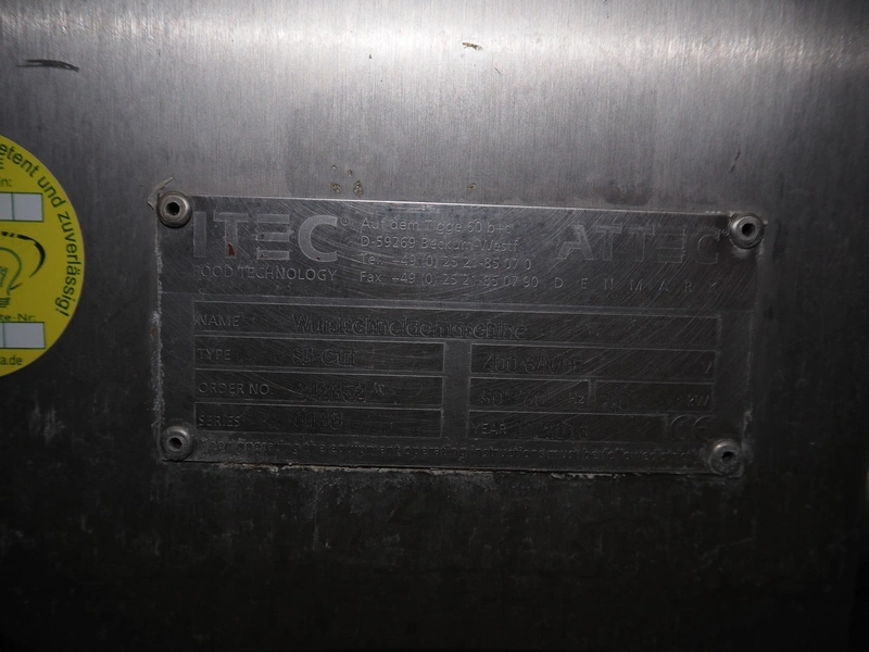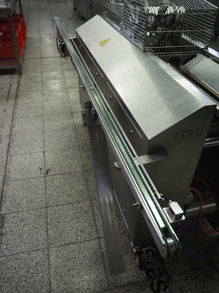 Itec mobile sausage cutter, type: SB-Cut, series: 0130, year of construction: 11/2013, 400 V, 3 Ph, 50/60 Hz, 1 kW, 285 kg, cutting width: 35-65 mm, cutting hieght: 35-65 mm, min/max lenght product: 180 - 400 mm, clearance: 80 mm x 75 mm, plastic belt, belt width: 25 mm, plastic string belt, belt width: 25 mm, total dimensions: 2000 mm x 1200 mm x 1500 mm. Including crate with parts.