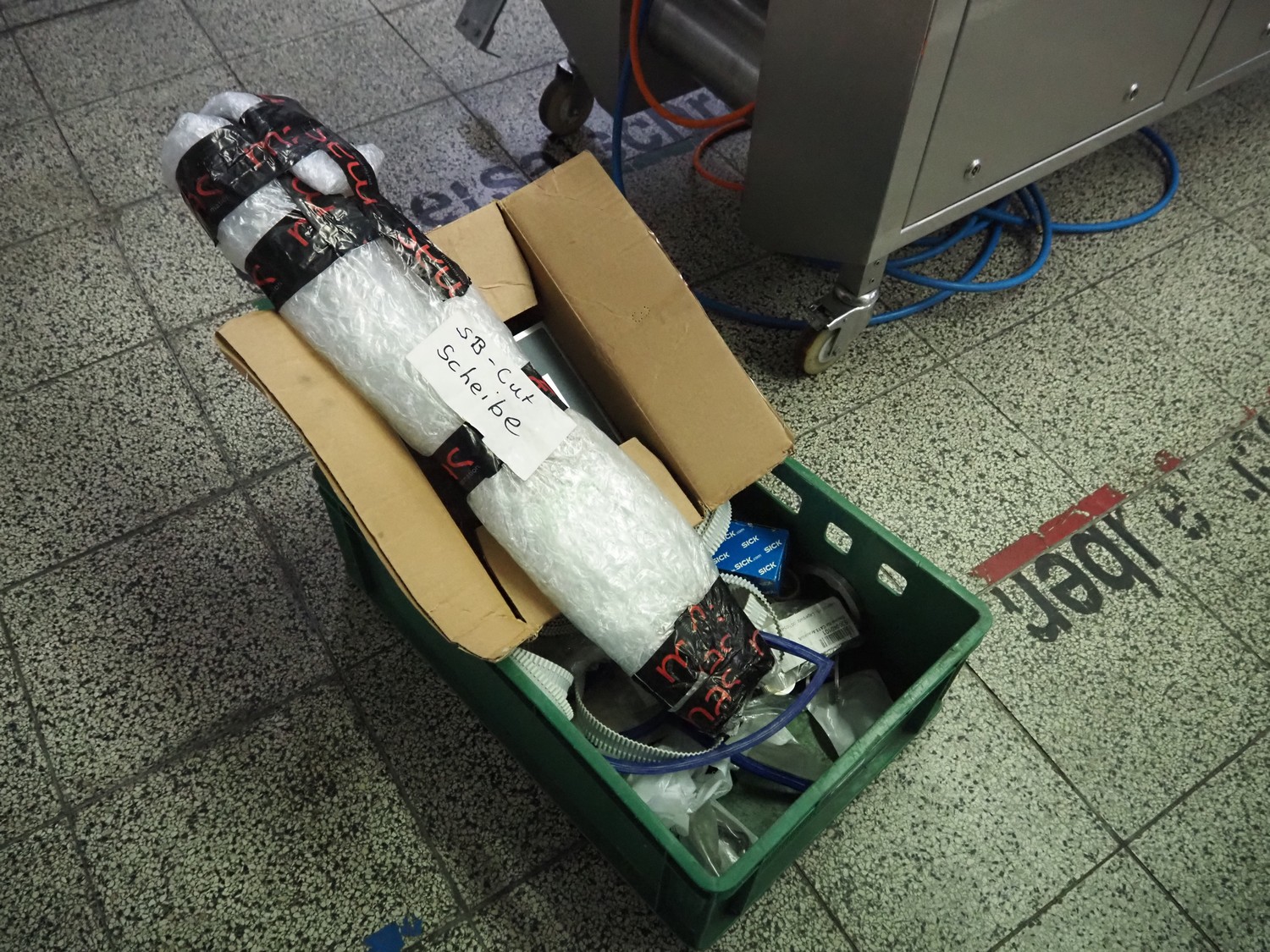 Itec mobile sausage cutter, type: SB-Cut, series: 0130, year of construction: 11/2013, 400 V, 3 Ph, 50/60 Hz, 1 kW, 285 kg, cutting width: 35-65 mm, cutting hieght: 35-65 mm, min/max lenght product: 180 - 400 mm, clearance: 80 mm x 75 mm, plastic belt, belt width: 25 mm, plastic string belt, belt width: 25 mm, total dimensions: 2000 mm x 1200 mm x 1500 mm. Including crate with parts.