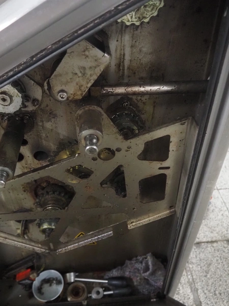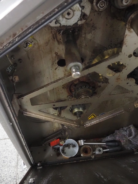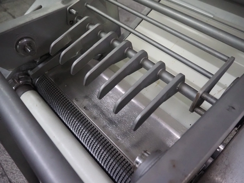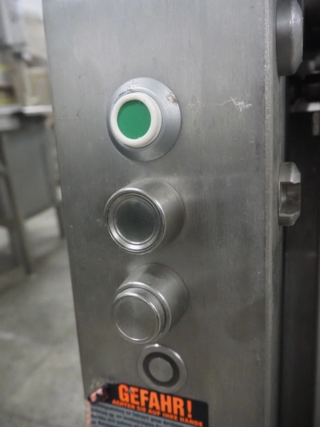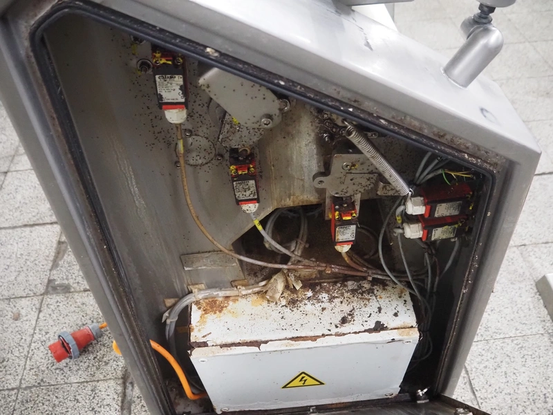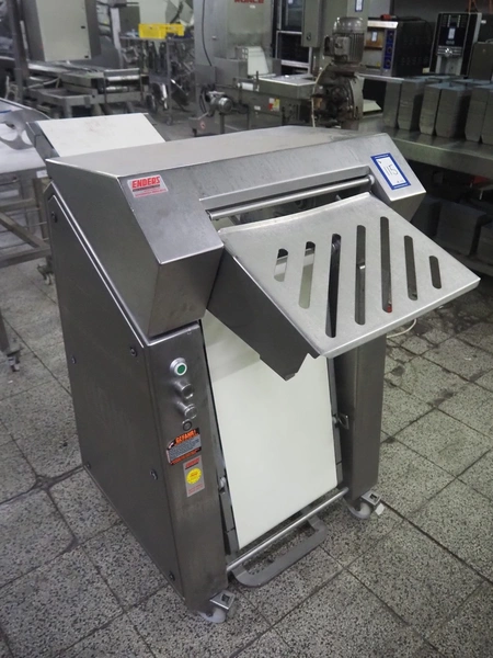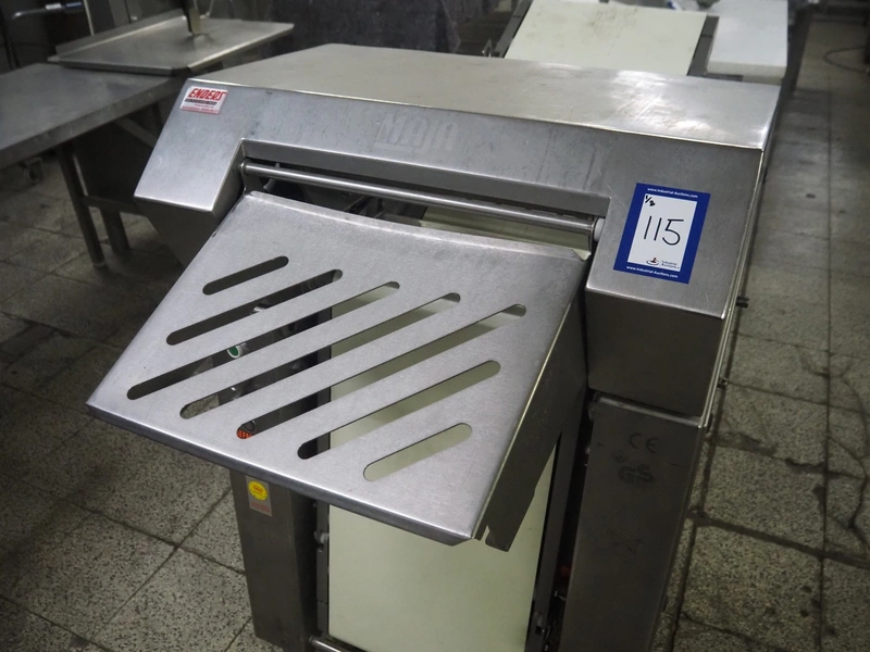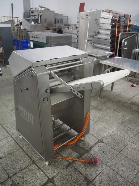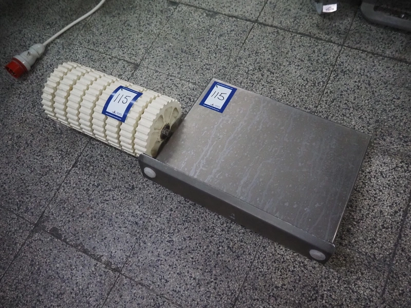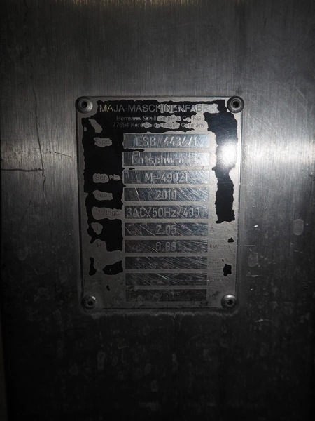 Maja-Maschinenfabrik GmbH mobile skinning and deriding machine, type: ESB 4434/1, serial number: M-49021, year of construction: 2010, 400 V, 3 Ph, 50 Hz, 2.05 A, 0.88 kW, weight 250 kg, plastic belt, belt width: 430 mm, working width: 360 mm, total dimensions: 1700 mm x 850 mm x 1250 mm. Including extra parts.