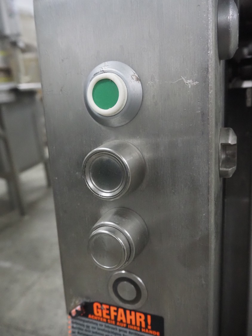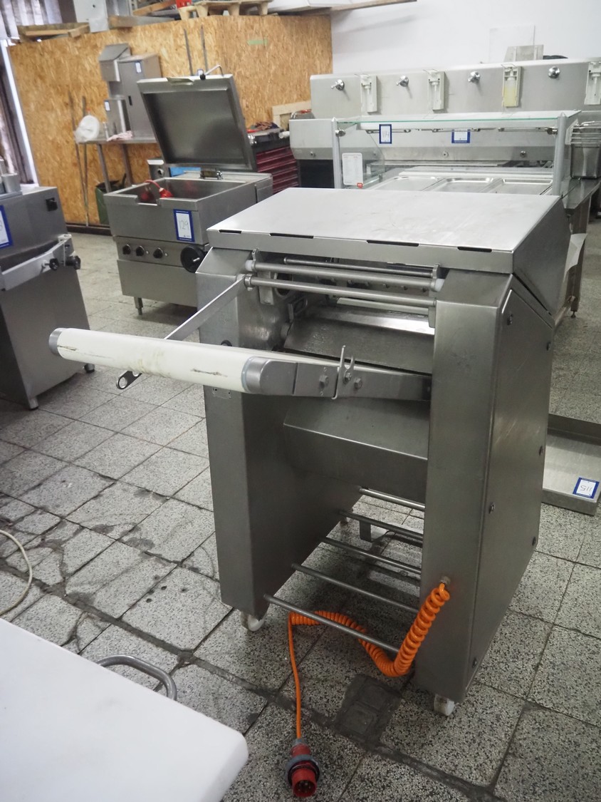 Maja-Maschinenfabrik GmbH mobile skinning and deriding machine, type: ESB 4434/1, serial number: M-49021, year of construction: 2010, 400 V, 3 Ph, 50 Hz, 2.05 A, 0.88 kW, weight 250 kg, plastic belt, belt width: 430 mm, working width: 360 mm, total dimensions: 1700 mm x 850 mm x 1250 mm. Including extra parts.