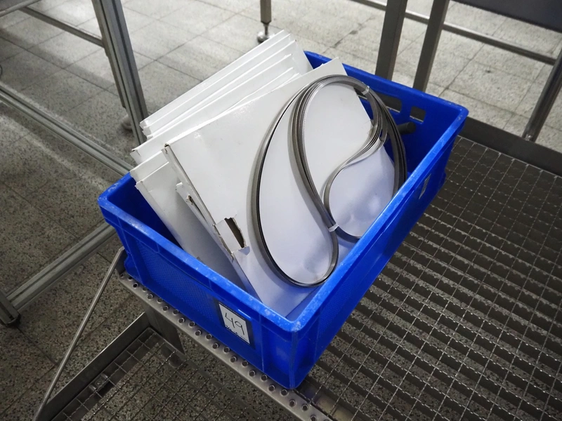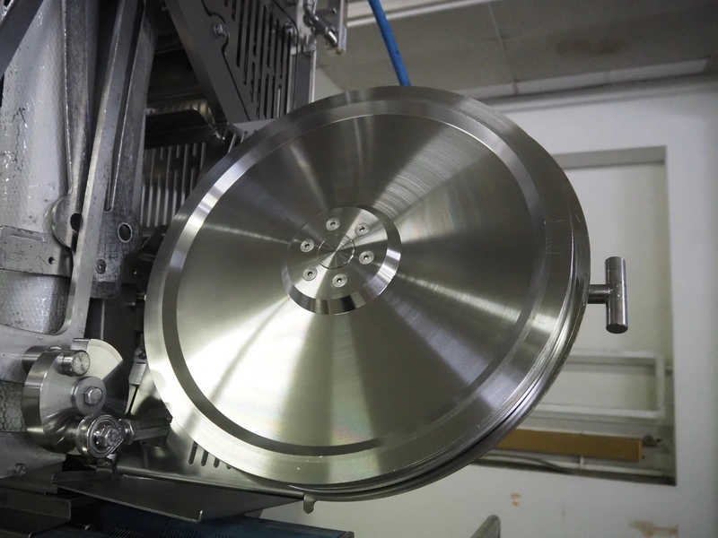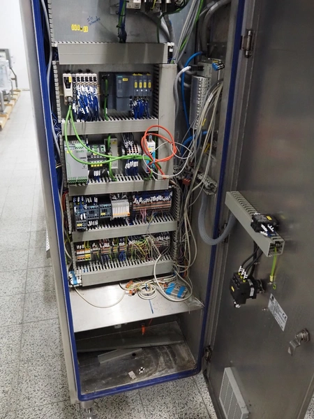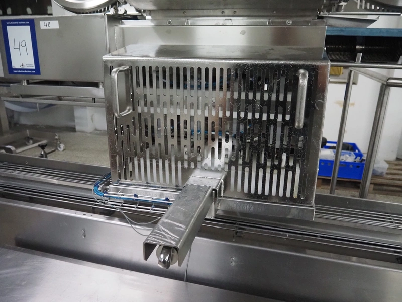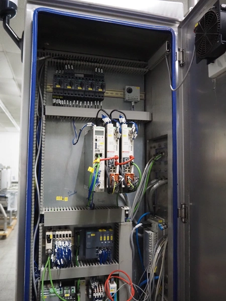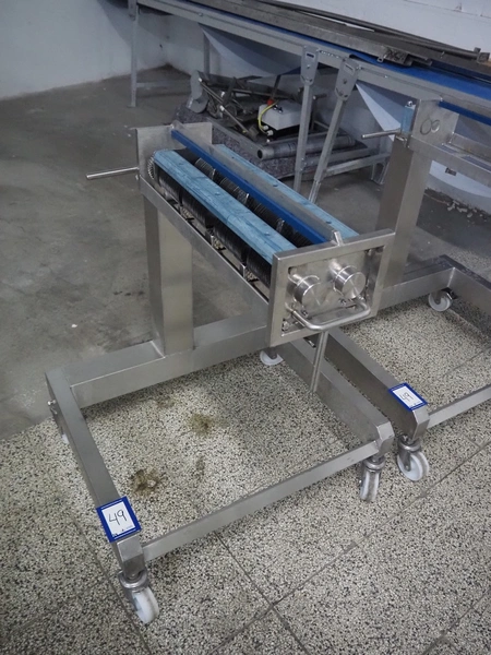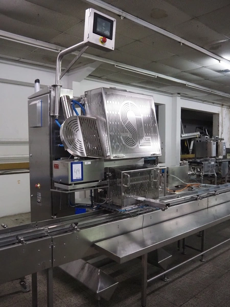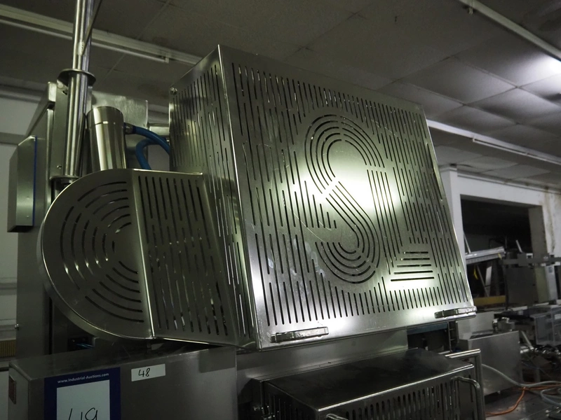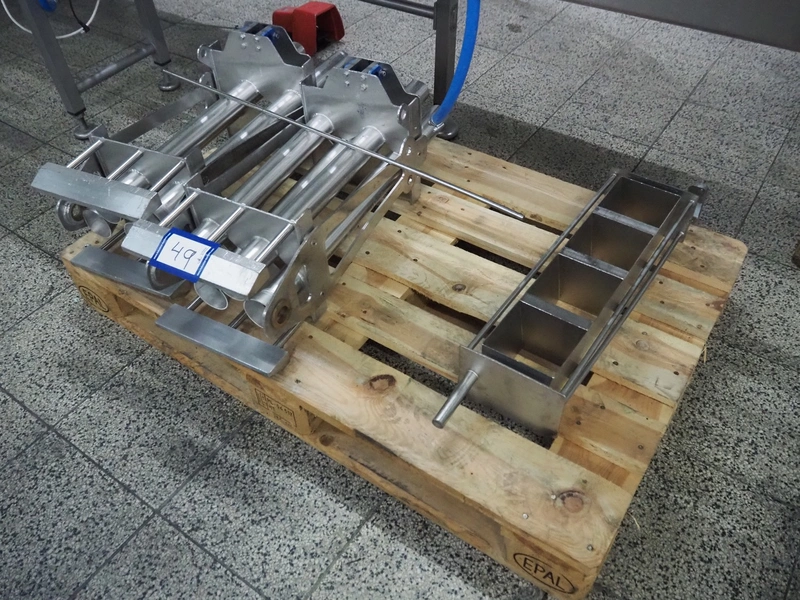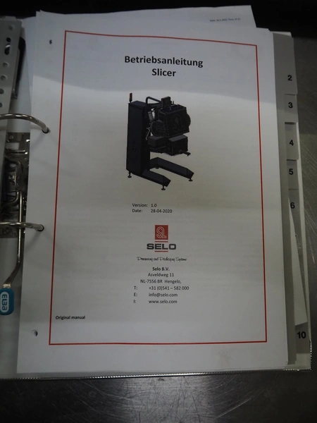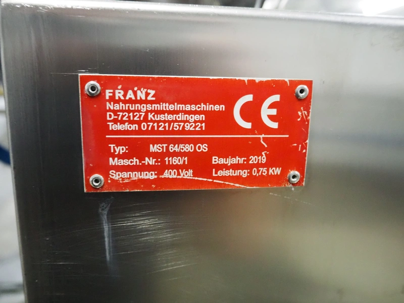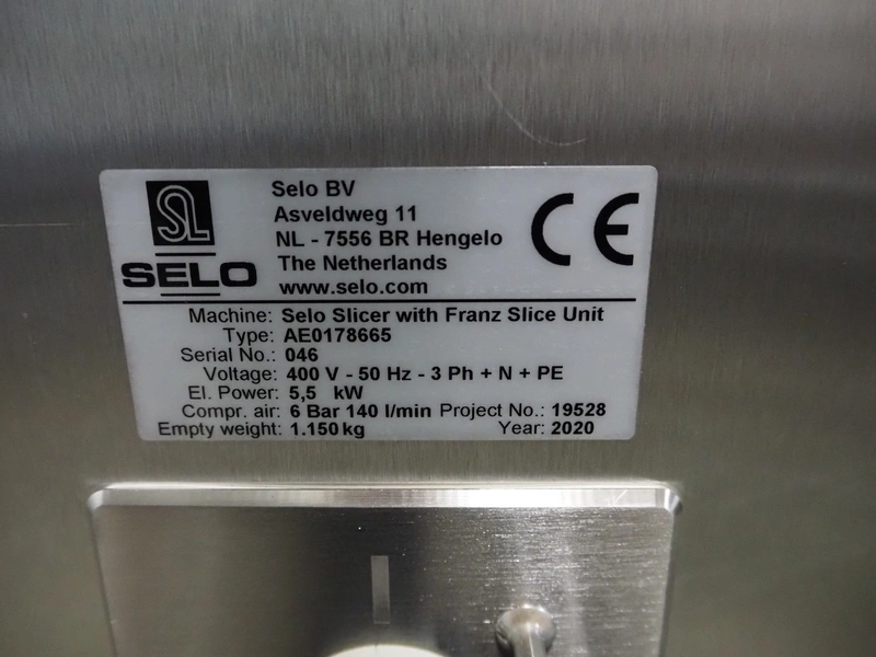 Selo slicer with Franz slicing unit, type: AE0178665, serial number: 046, year of construction: 2020, 400 V, 3 Ph, 50 Hz, 5.5 kW, 6 bar, 140 l/min, empty weight: 1150 kg, clearance infeed: (2x) Ø 105 mm, clearance output: (4x) 120 mm x 80 mm, Franz slicing unit type: MST 64/580 OS, machine number: 1160/1, year of construction: 2019, 400 V, 0.75 kW, 4 knife sets, 28 knifes per set, distance between knifes: 0,5 mm, total dimensions: 2400 mm x 1800 mm x 3000 mm. Including 2 trolleys for knifes, dimensions trolley: (2x) 800 mm x 700 mm x 1000 mm.