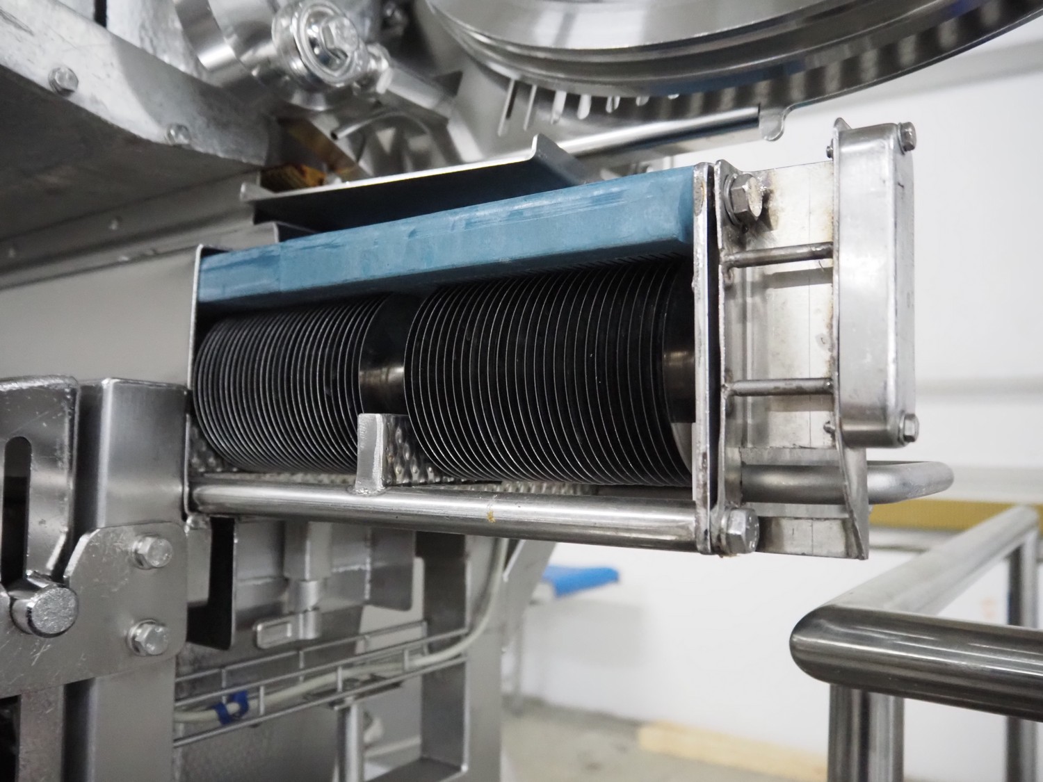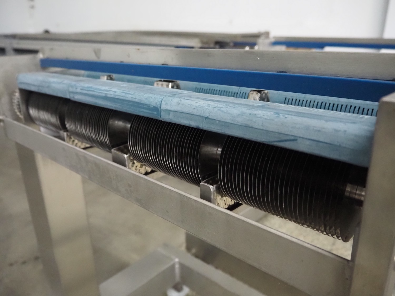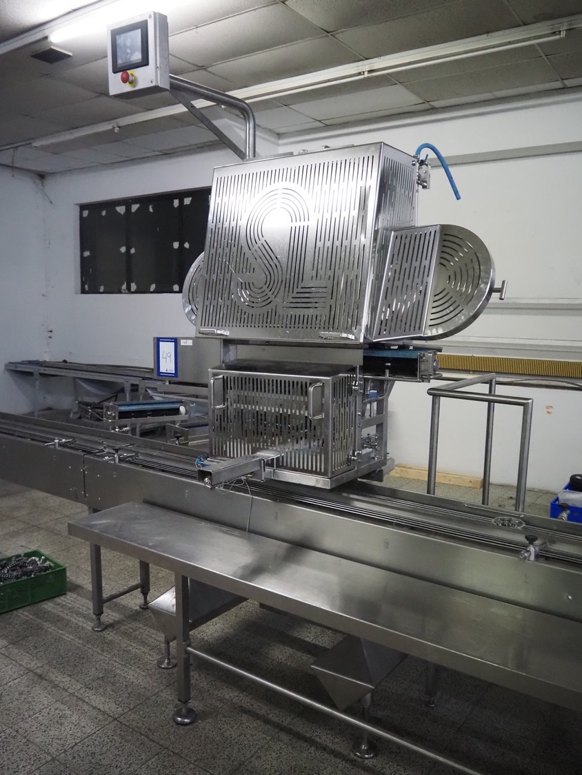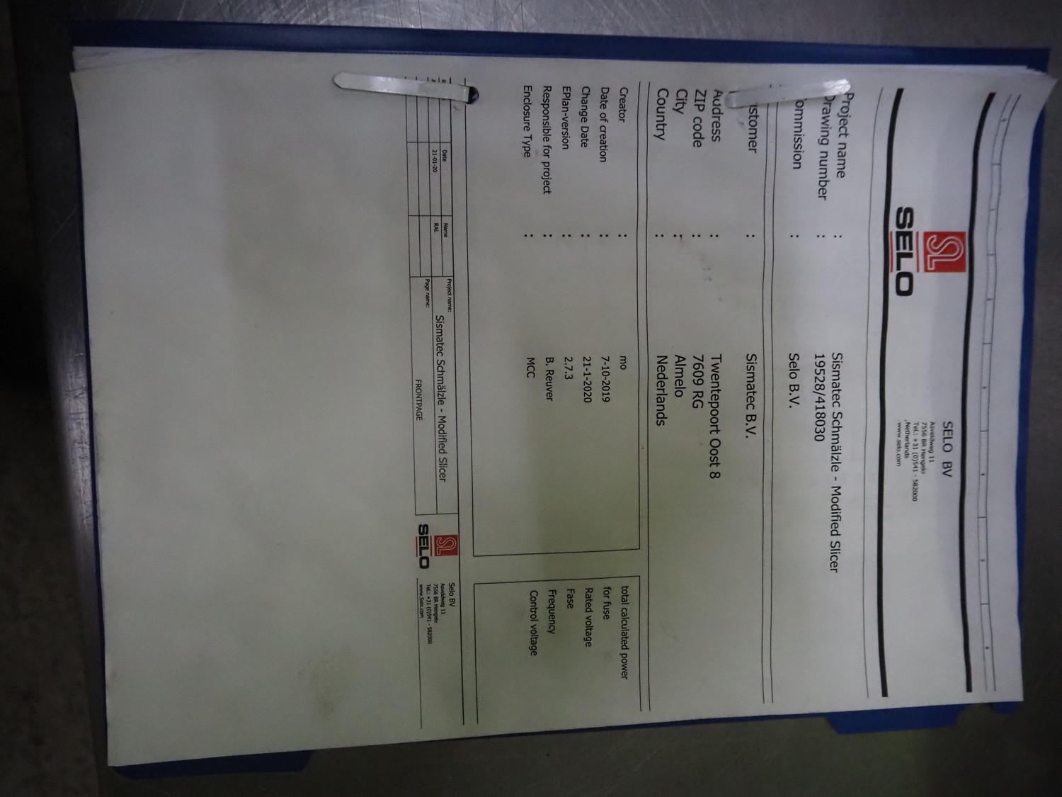 Selo slicer with Franz slicing unit, type: AE0178665, serial number: 046, year of construction: 2020, 400 V, 3 Ph, 50 Hz, 5.5 kW, 6 bar, 140 l/min, empty weight: 1150 kg, clearance infeed: (2x) Ø 105 mm, clearance output: (4x) 120 mm x 80 mm, Franz slicing unit type: MST 64/580 OS, machine number: 1160/1, year of construction: 2019, 400 V, 0.75 kW, 4 knife sets, 28 knifes per set, distance between knifes: 0,5 mm, total dimensions: 2400 mm x 1800 mm x 3000 mm. Including 2 trolleys for knifes, dimensions trolley: (2x) 800 mm x 700 mm x 1000 mm.