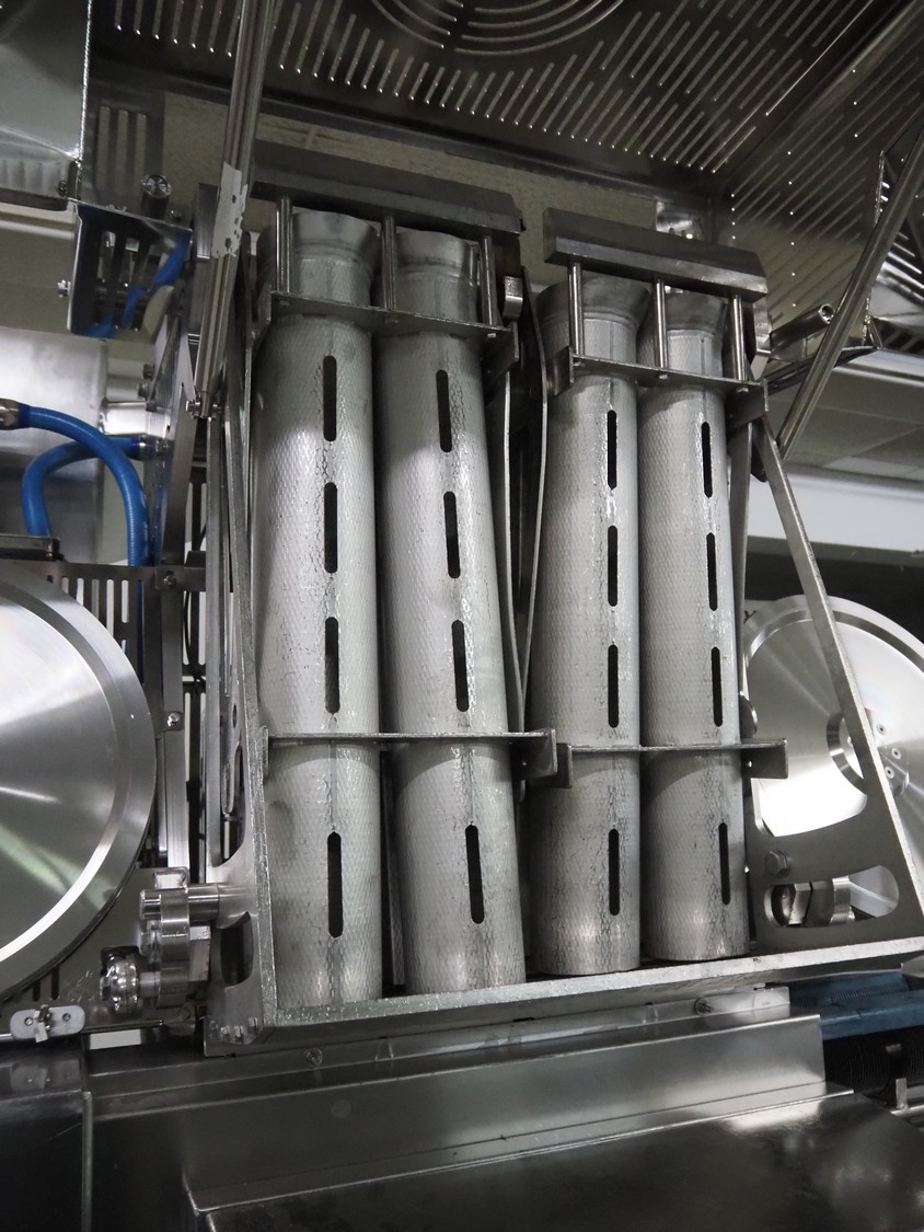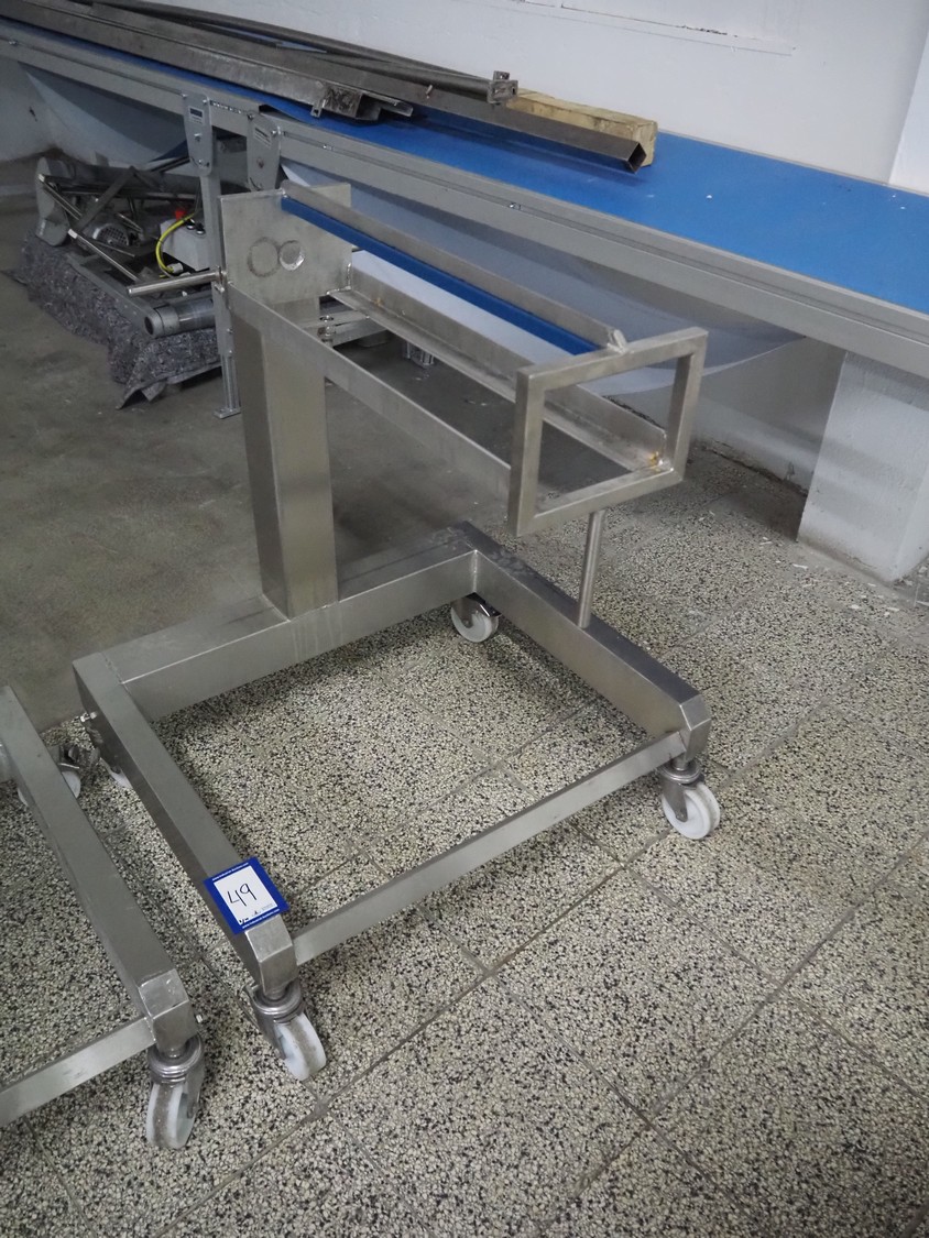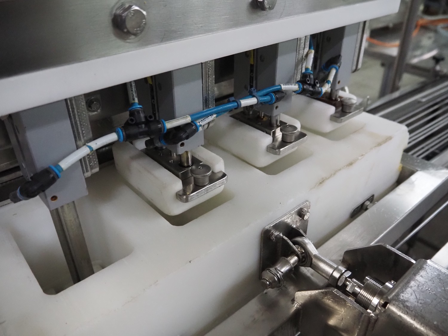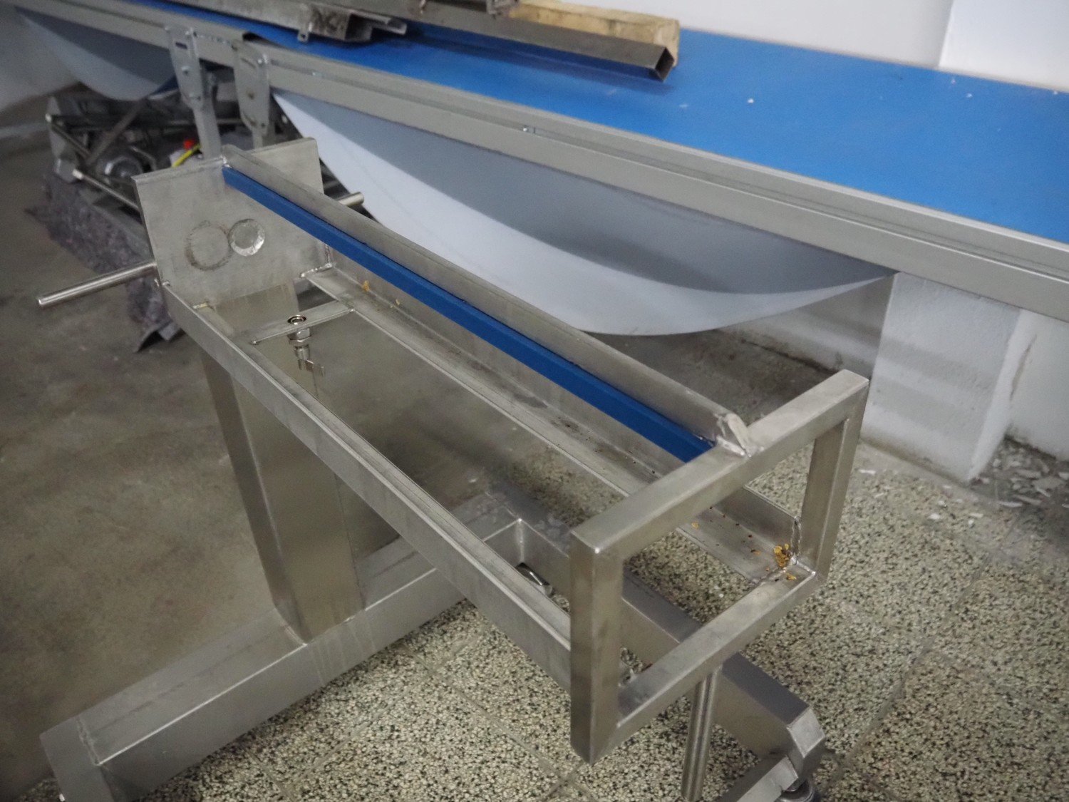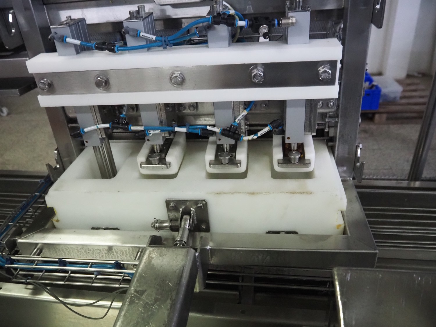 Selo slicer with Franz slicing unit, type: AE0178665, serial number: 046, year of construction: 2020, 400 V, 3 Ph, 50 Hz, 5.5 kW, 6 bar, 140 l/min, empty weight: 1150 kg, clearance infeed: (2x) Ø 105 mm, clearance output: (4x) 120 mm x 80 mm, Franz slicing unit type: MST 64/580 OS, machine number: 1160/1, year of construction: 2019, 400 V, 0.75 kW, 4 knife sets, 28 knifes per set, distance between knifes: 0,5 mm, total dimensions: 2400 mm x 1800 mm x 3000 mm. Including 2 trolleys for knifes, dimensions trolley: (2x) 800 mm x 700 mm x 1000 mm.