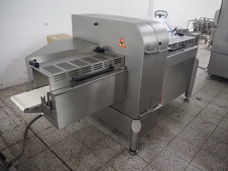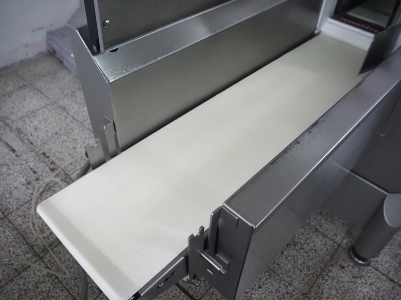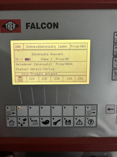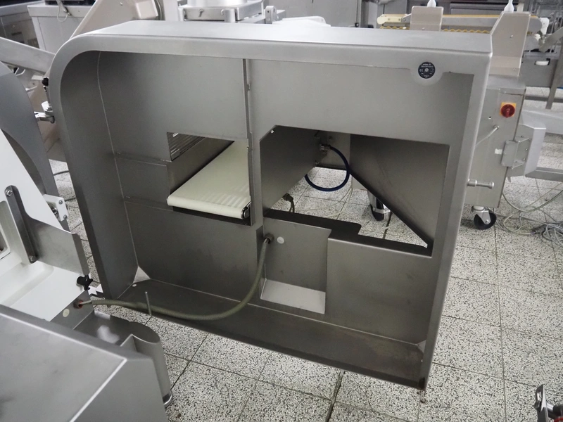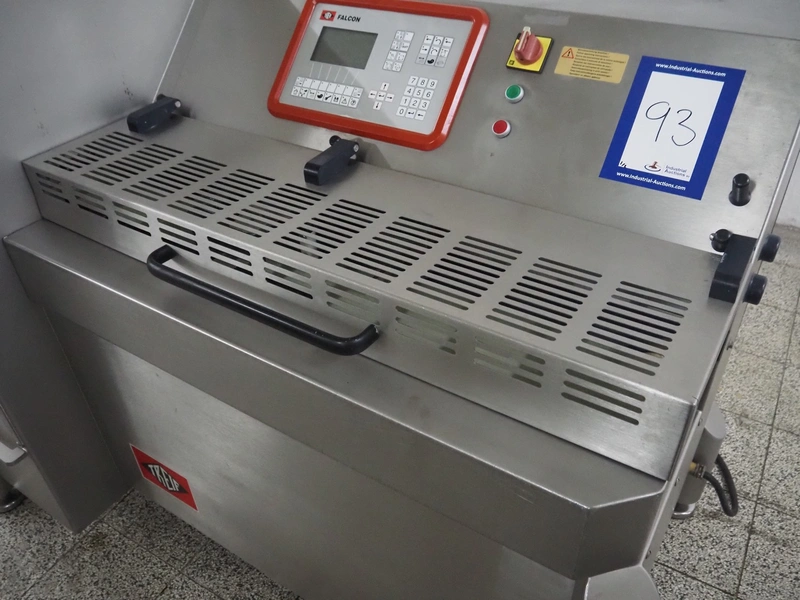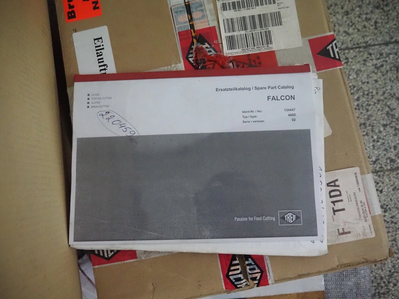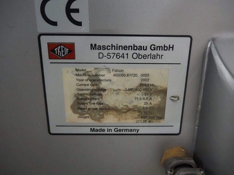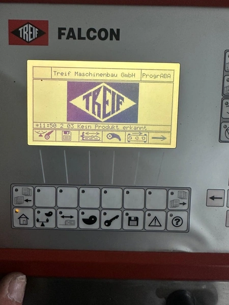 Treif Maschinenbau GmbH slicer, model: Falcon, serial number: 460000.61720, year of construction: 2002, 400/480 V, 3 Ph, 50/60 Hz, 9.6/11.5 A, 8 kW, weight: 600 kg, plastic belt, belt width: 255 mm, clearance: 1950 mm x 150 mm, total dimensions: 1200 mm x 800 mm x 1000 mm. Including pallet with parts.