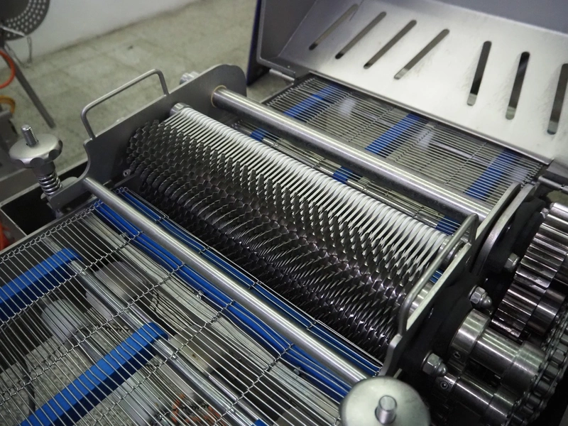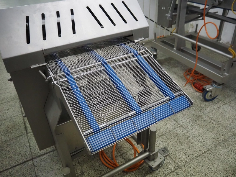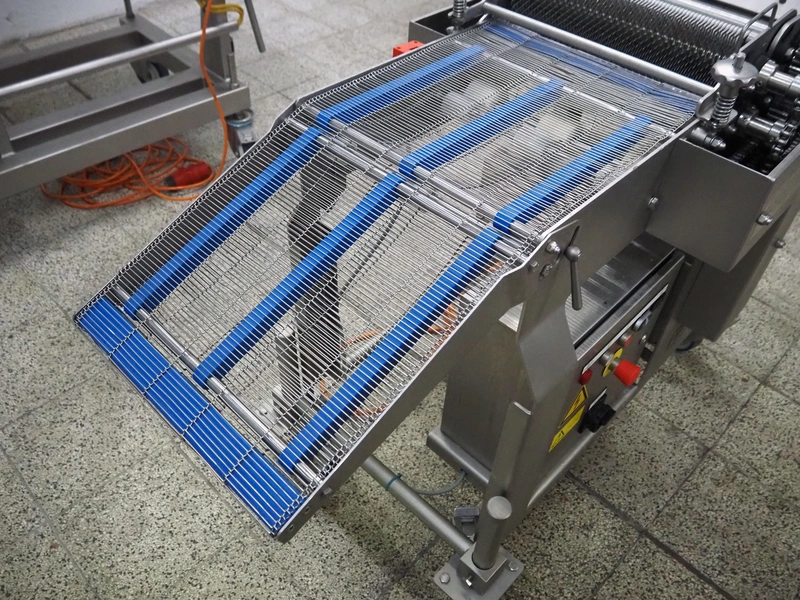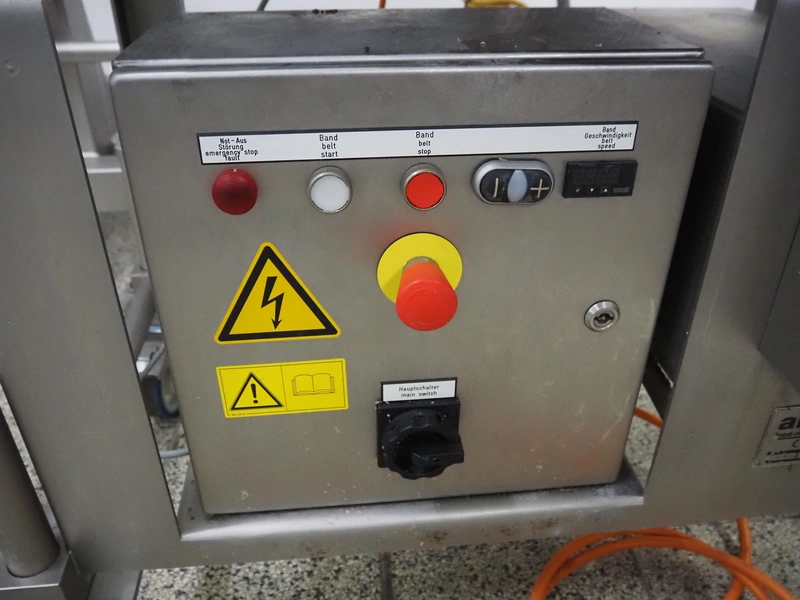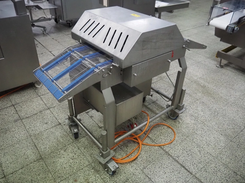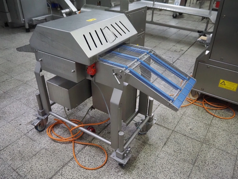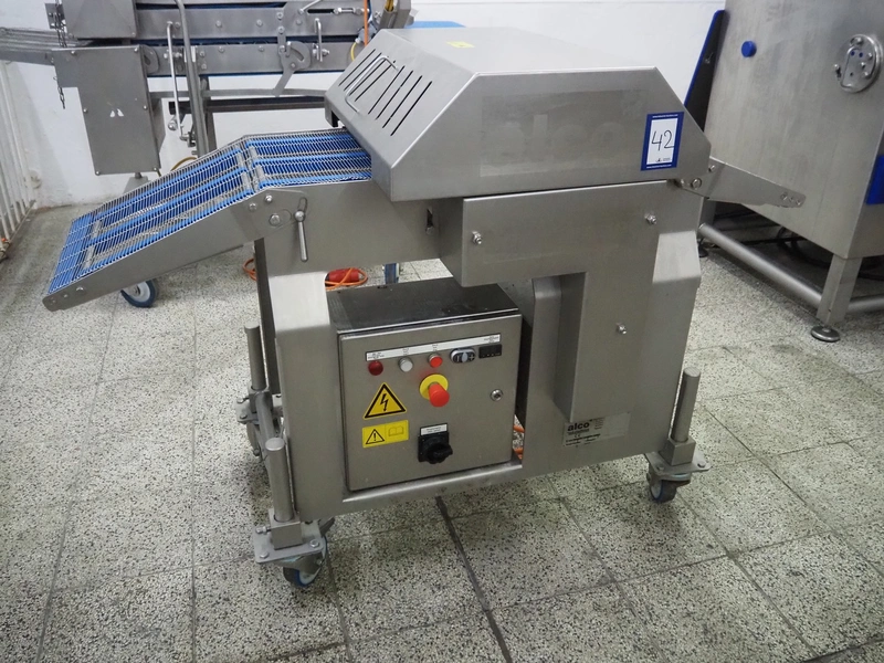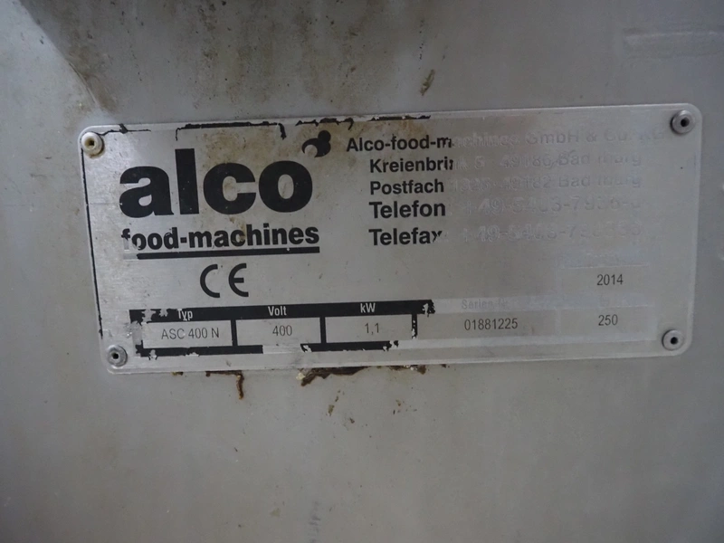 Alco food machines GmbH mobile tenderiser, type: ASC 400 N, serial number: 01881225, year of construction: 2014, 400 V, 1.1 kW, weight: 250 kg, s/s mesh belt, belt width: 250 mm, total dimensions: 1900 mm x 750 mm x 1900 mm.
