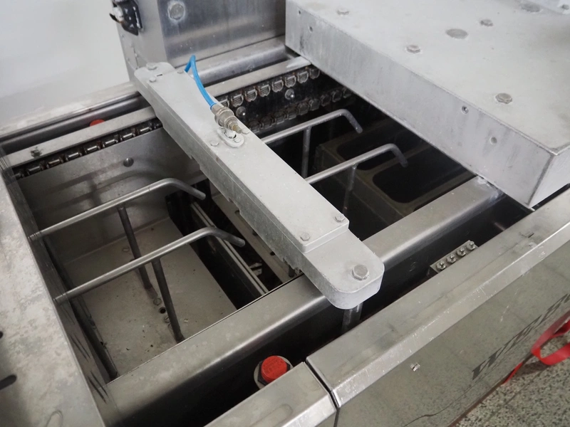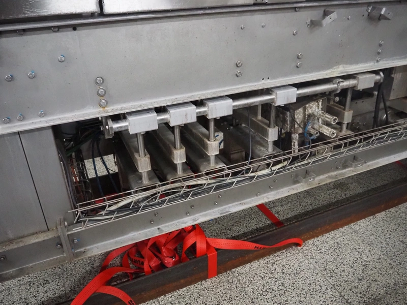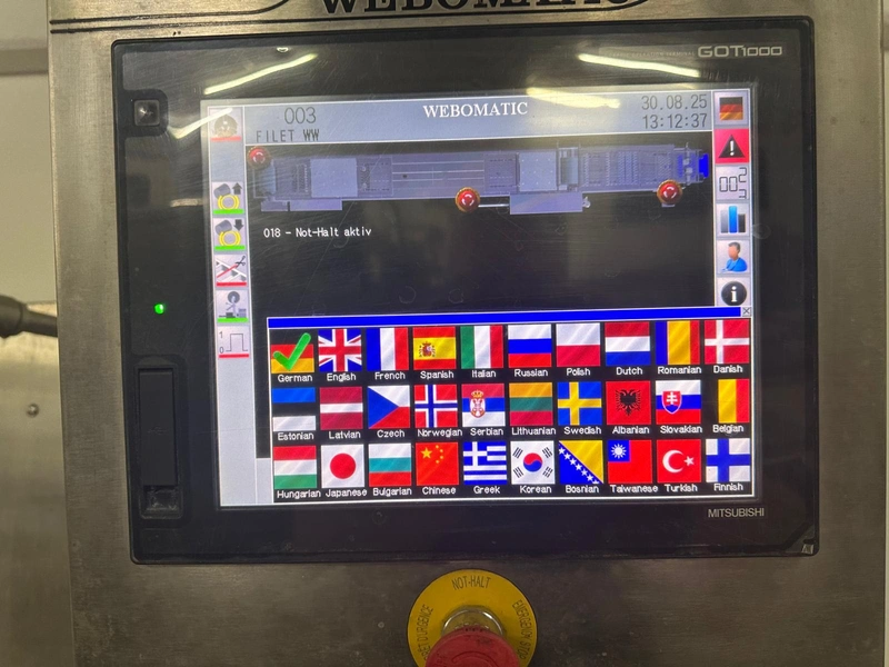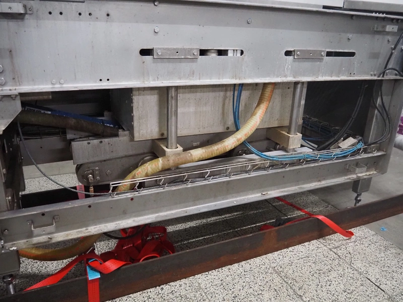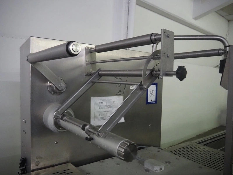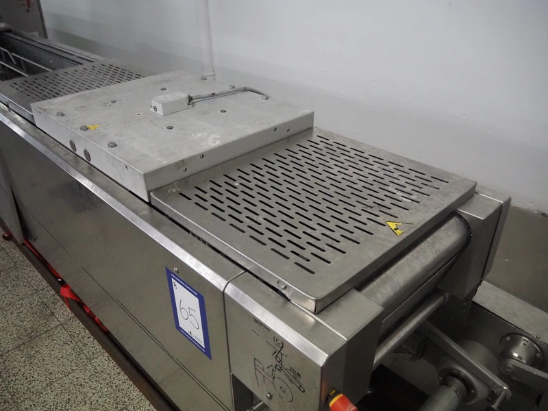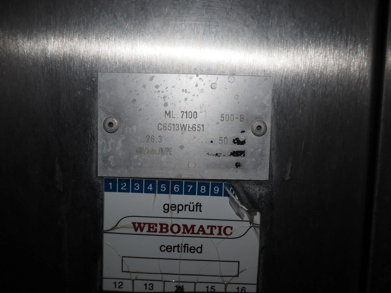 Webomatic thermoformer, type: ML 7100, serial number: C6513WL651, 400 V, 3 Ph, 50 Hz, film width: 430 mm, dye: (3x) 674 mm x 103 mm, total dimensions: 7550 mm x 1050 mm x 2100 mm. Including extra parts and suction device for rest film, dimensions: Ø 500 mm x 1100 mm. Without vacuum pump.