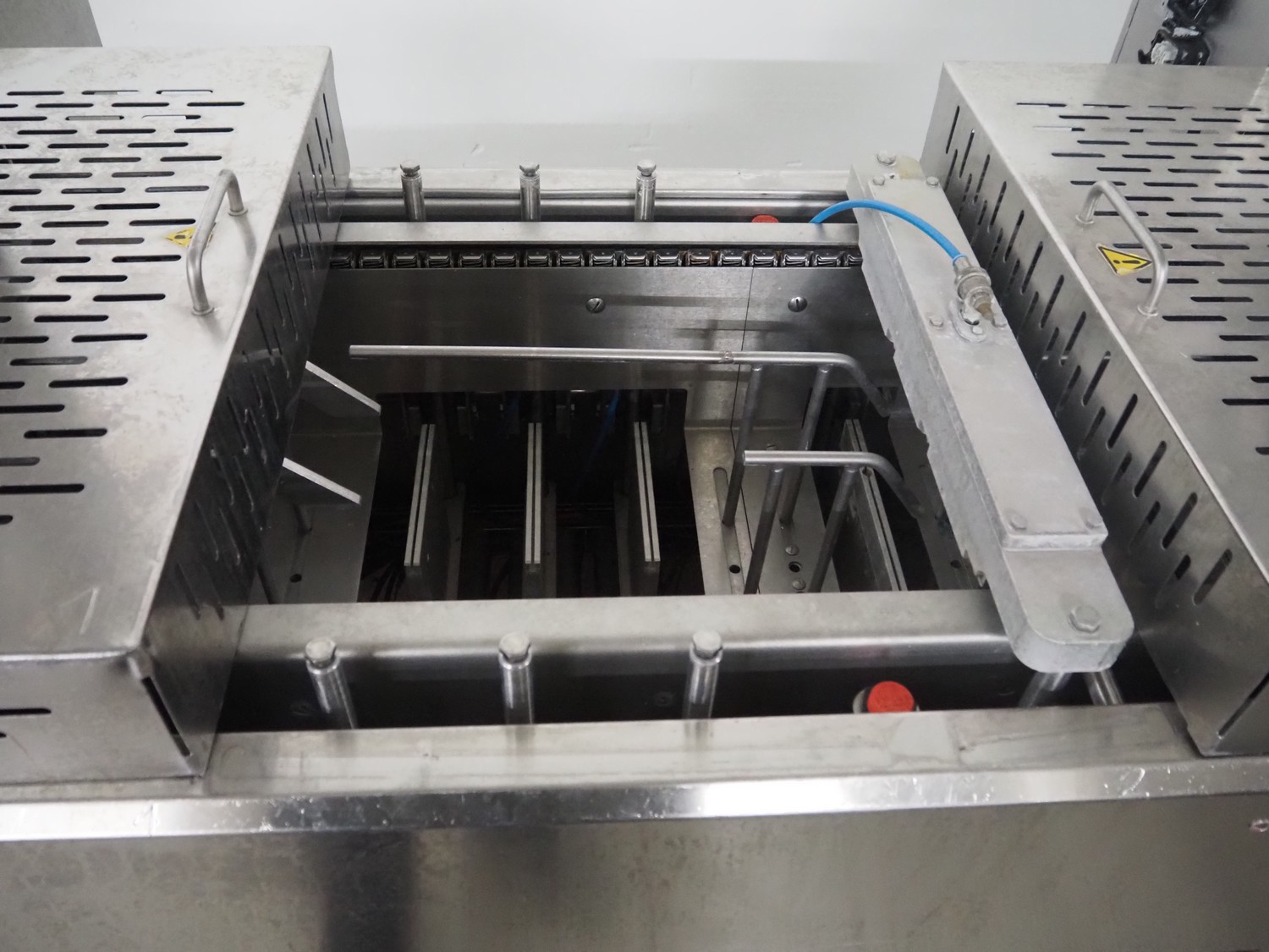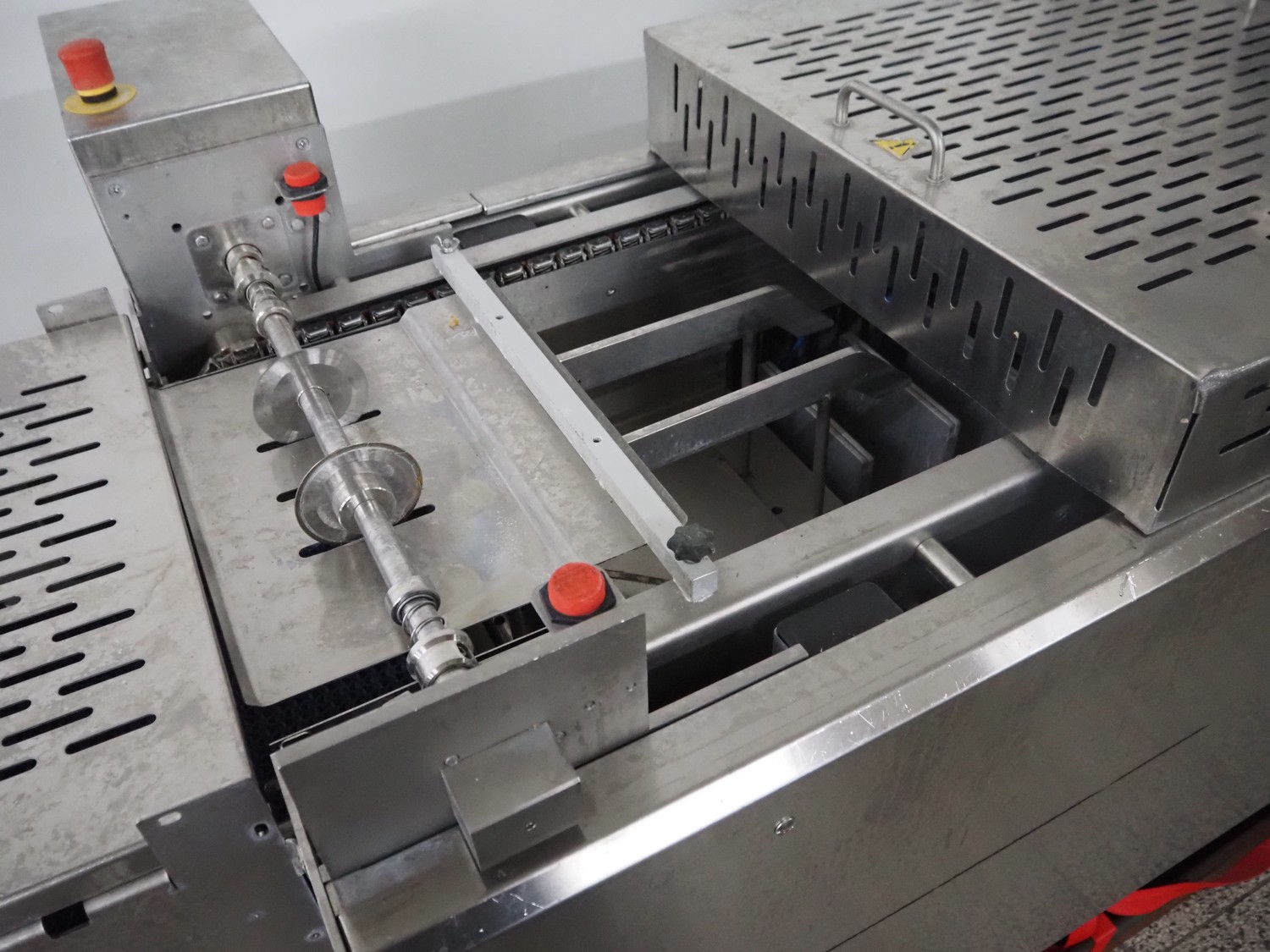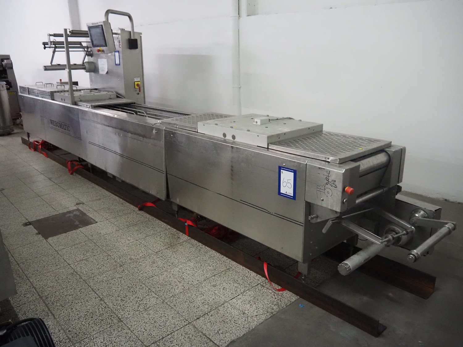 Webomatic thermoformer, type: ML 7100, serial number: C6513WL651, 400 V, 3 Ph, 50 Hz, film width: 430 mm, dye: (3x) 674 mm x 103 mm, total dimensions: 7550 mm x 1050 mm x 2100 mm. Including extra parts and suction device for rest film, dimensions: Ø 500 mm x 1100 mm. Without vacuum pump.