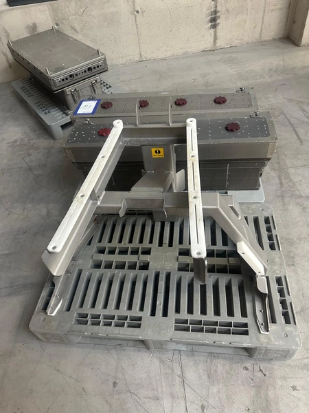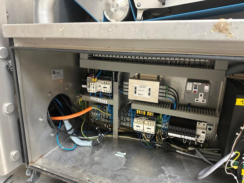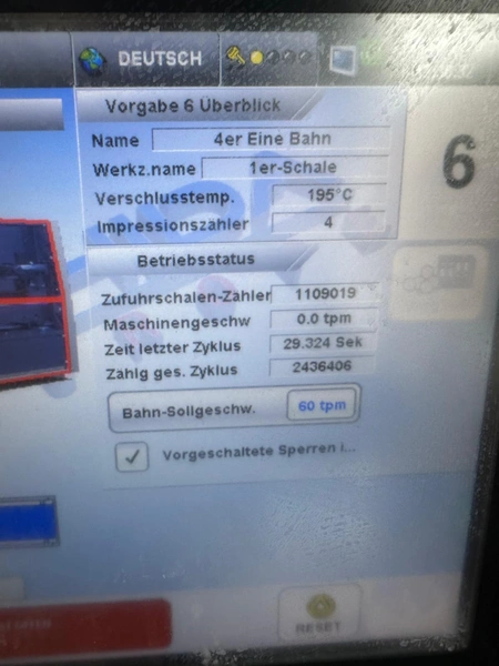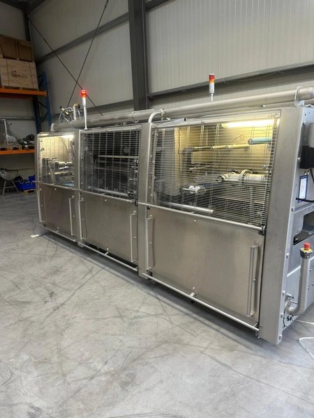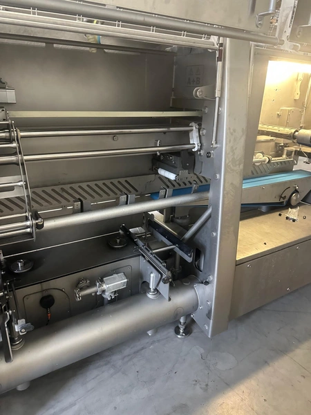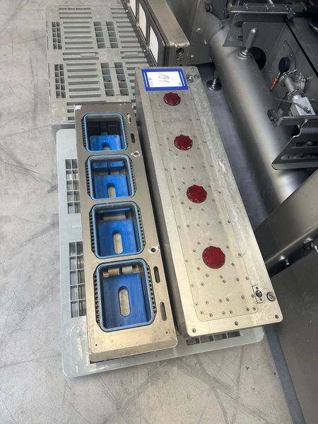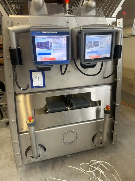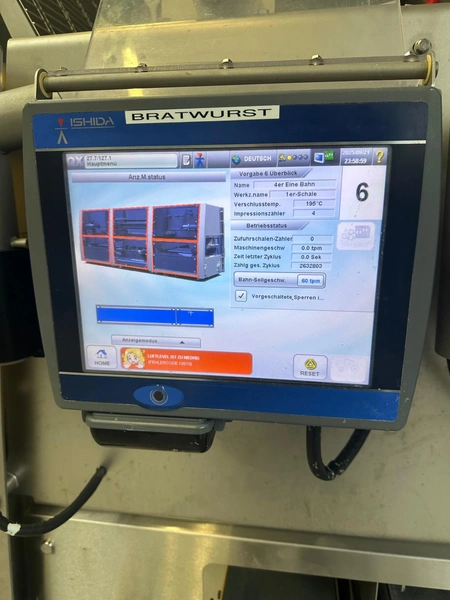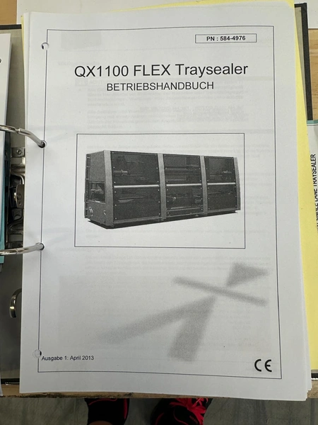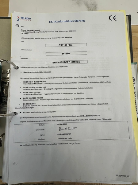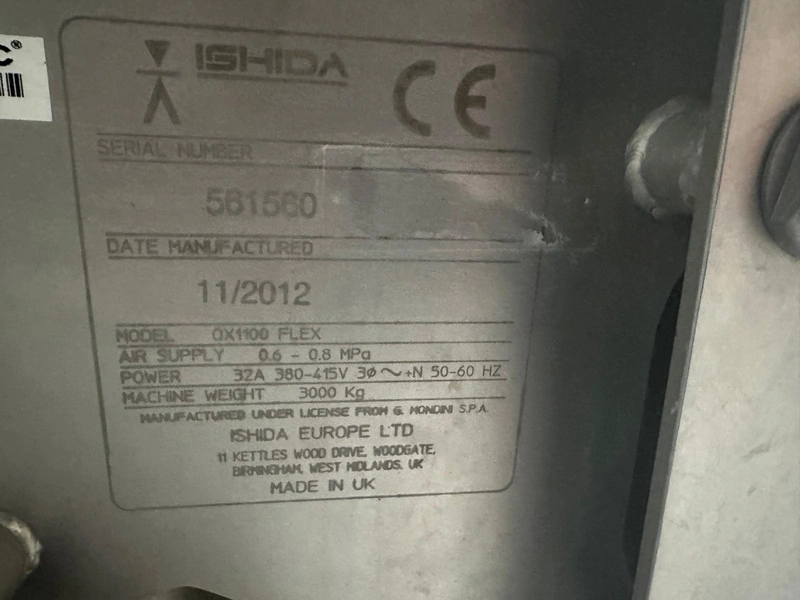 Ishida traysealer, model: QX1100 FLEX, serial number: 561560, year of construction: 11/2012, 380-415 v, 3 Ph, 50-60 Hz, weight: 3000 kg, dimensions: 4500 mm x 1100 mm x 2100 mm. Including 3 pallets with dye sets.