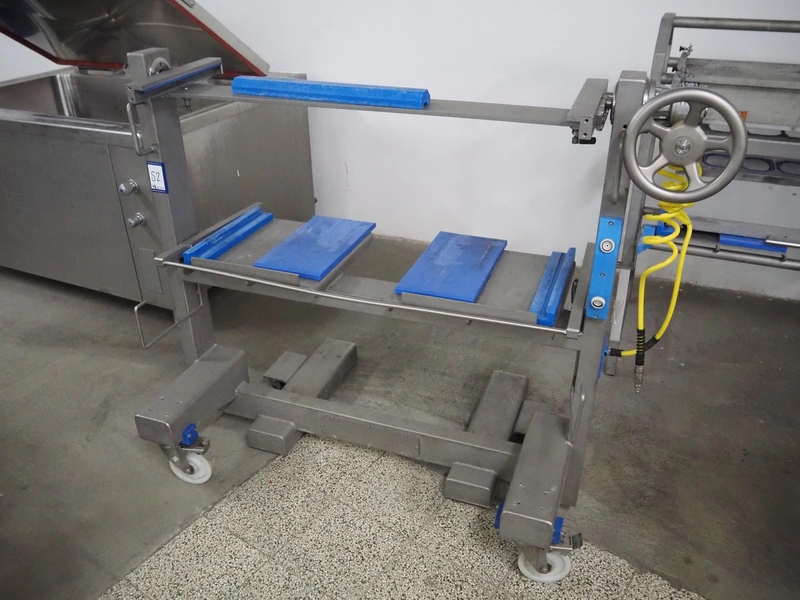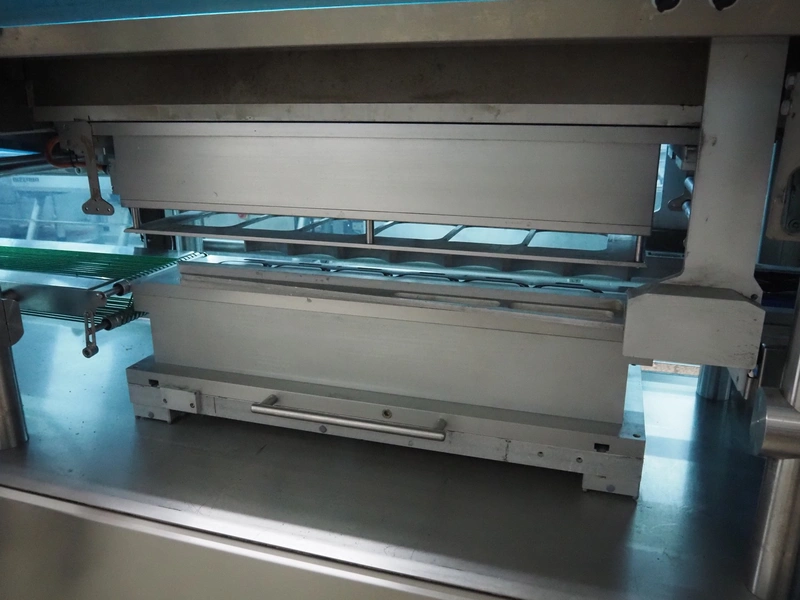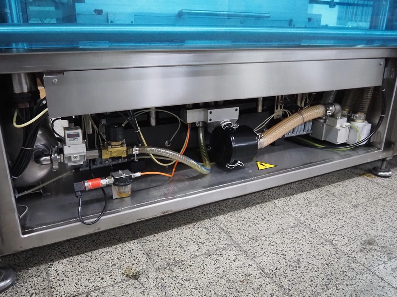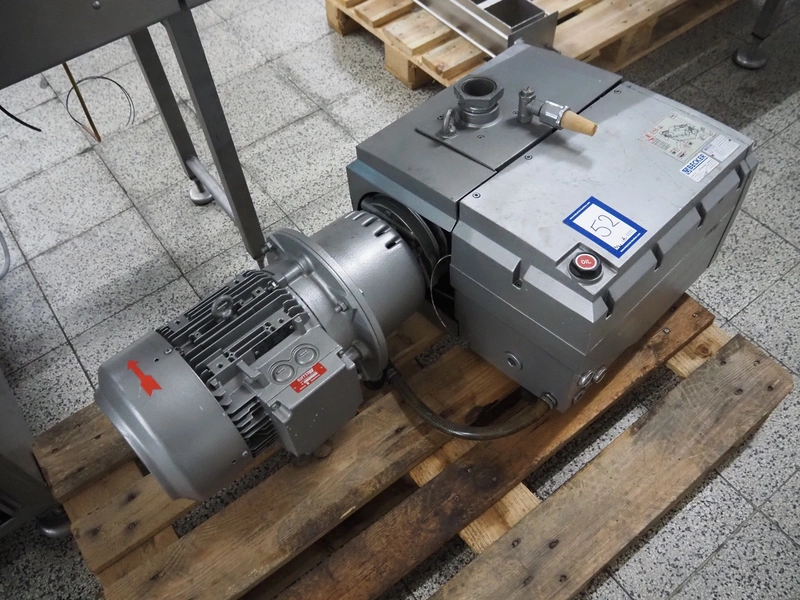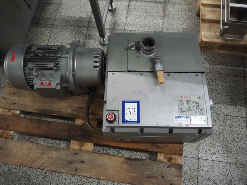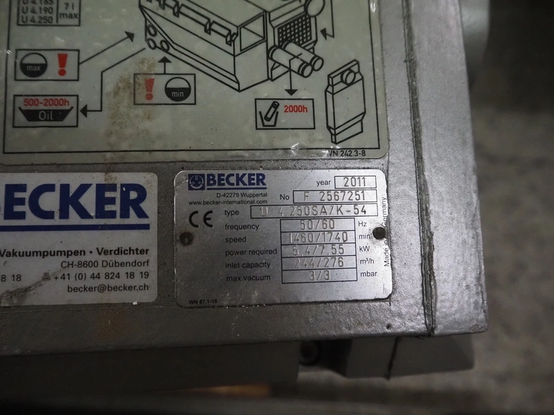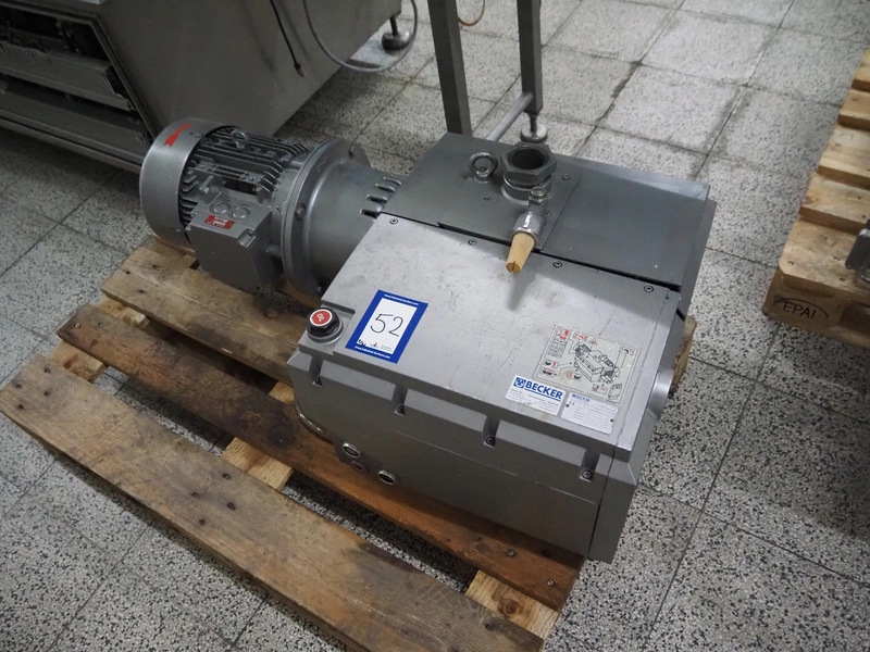 Ulma traysealer, type: Scorpoius-1000, serial number: 7700004, year of construction: 2009, 400 V, 50 Hz, 27 A, 14 kW, dye: (6x) 190 mm x 140 mm, plastic belt, belt width: (2x) 115 mm and (1x) 300 mm, plastic string belt, belt width: 200 mm, total dimensions: 4335 mm x 1140 mm x 2166 mm. Including Becker pump vacuum pump, model: U 4.250SA7K-54, number: F 2567251, year of construction: 2011, 244/276 m³/h, dimensions: 1100 mm x 550 mm x 450 mm, trolley with parts, dimensions trolley: 1650 mm x 950 mm x 1350 mm and rack for dyes, dye: (7x) 160 mm x 100 mm, dimensions rack: 2750 mm x 750 mm x 1400 mm.