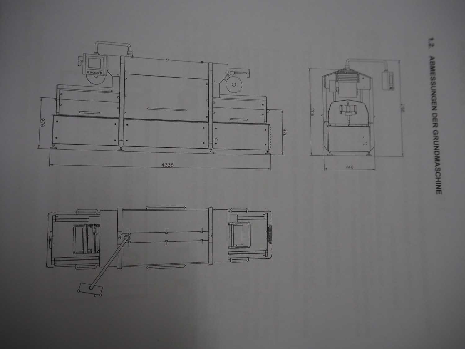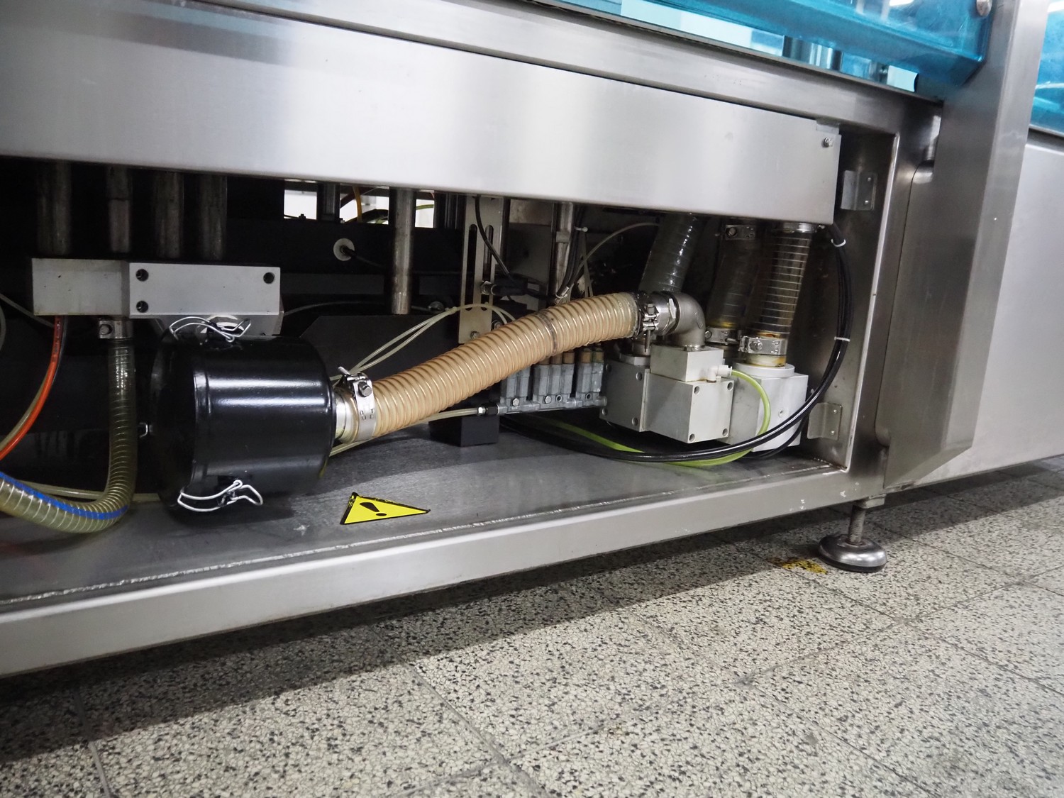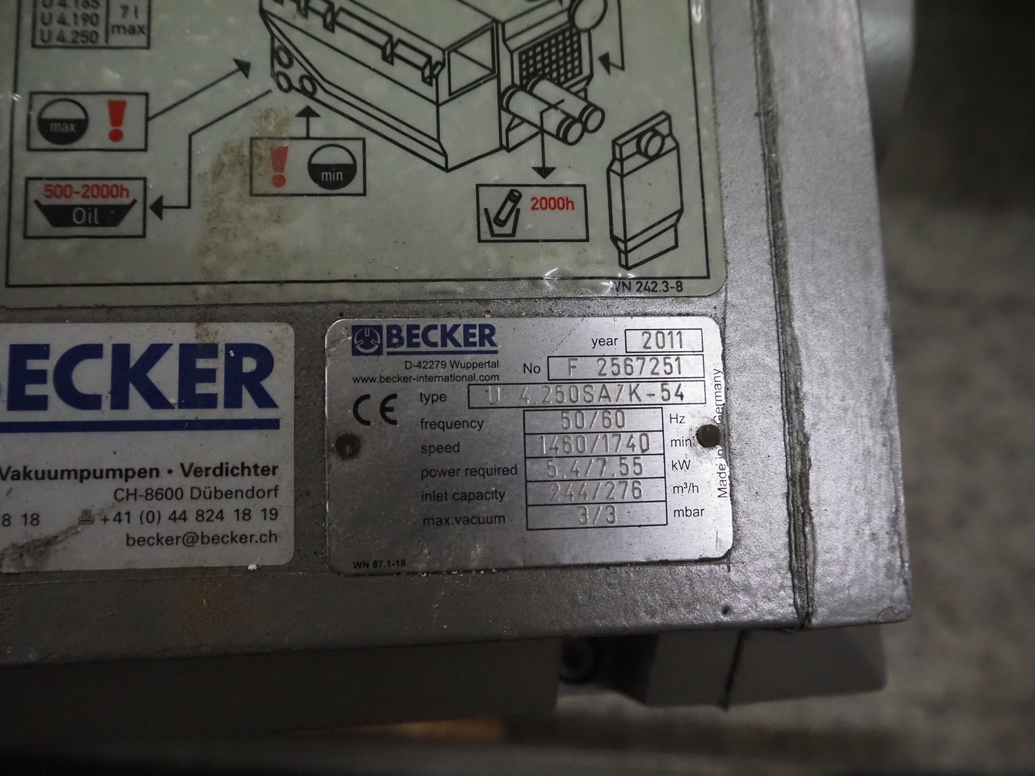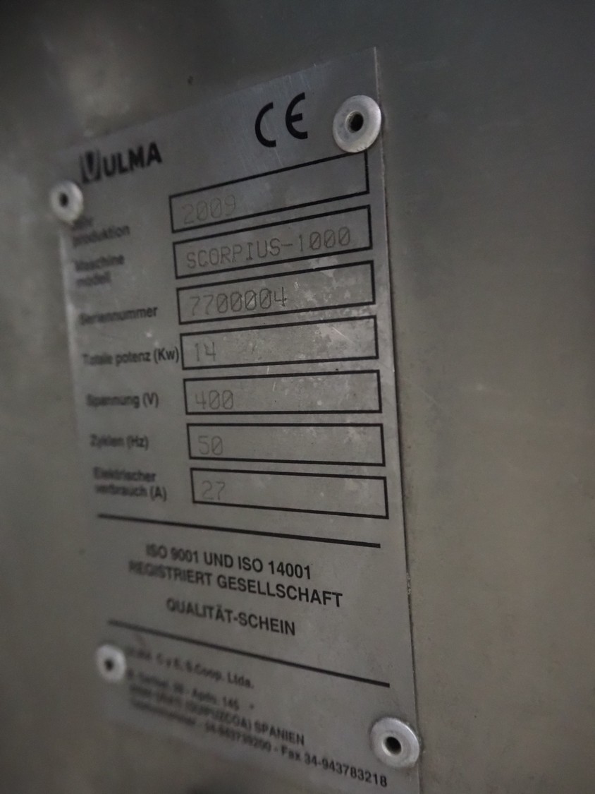 Ulma traysealer, type: Scorpoius-1000, serial number: 7700004, year of construction: 2009, 400 V, 50 Hz, 27 A, 14 kW, dye: (6x) 190 mm x 140 mm, plastic belt, belt width: (2x) 115 mm and (1x) 300 mm, plastic string belt, belt width: 200 mm, total dimensions: 4335 mm x 1140 mm x 2166 mm. Including Becker pump vacuum pump, model: U 4.250SA7K-54, number: F 2567251, year of construction: 2011, 244/276 m³/h, dimensions: 1100 mm x 550 mm x 450 mm, trolley with parts, dimensions trolley: 1650 mm x 950 mm x 1350 mm and rack for dyes, dye: (7x) 160 mm x 100 mm, dimensions rack: 2750 mm x 750 mm x 1400 mm.