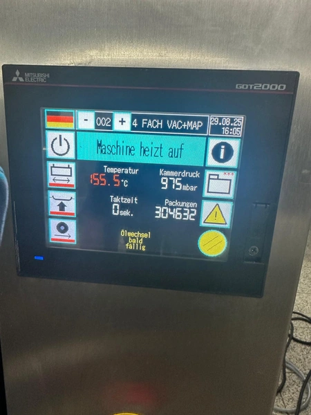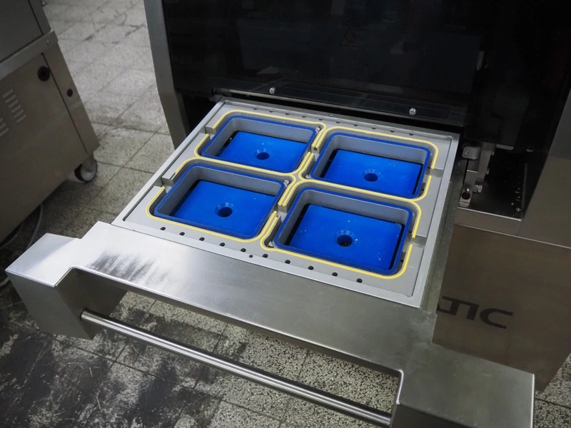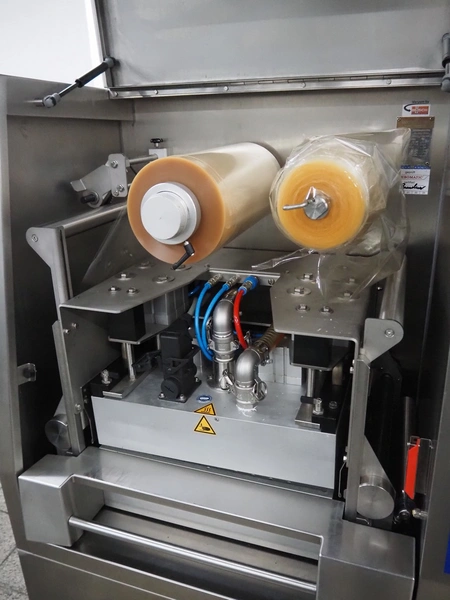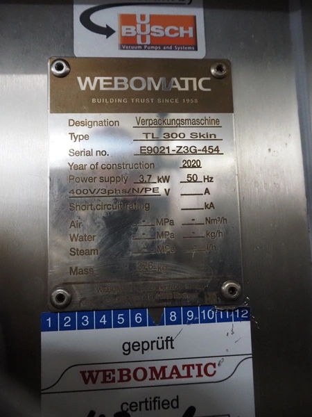 Webomatic traysealer with gas flush, type: TL 300 Skin, serial number: E9021-Z3G-454, year of construction: 2020, 400 V, 3 Ph, 50 Hz, 3.7 kW, weight: 400 kg, dye: (4x) 175 mm x 130 mm, Busch vacuum pump, type: RA 0100 F 503, serial number: DEM120091433, year of construction: 2020, capacity: 100 m³/h, total dimensions: 1000 mm x 800 mm x 1630 mm.