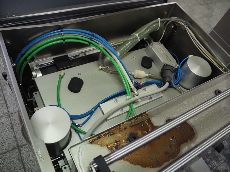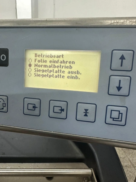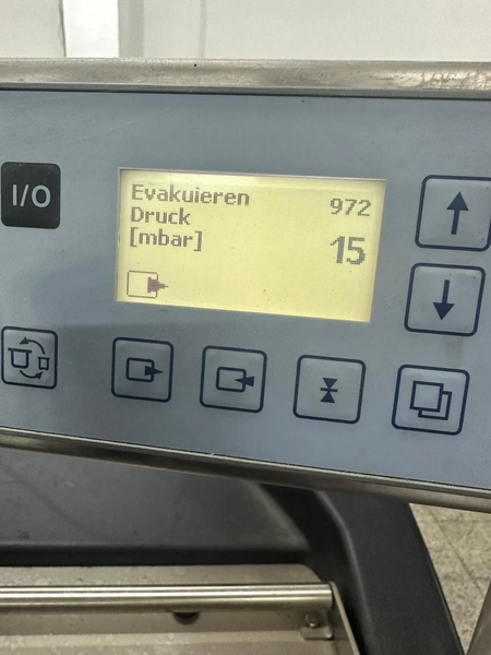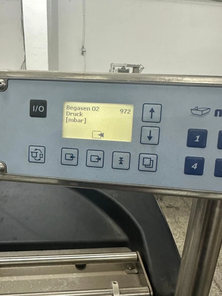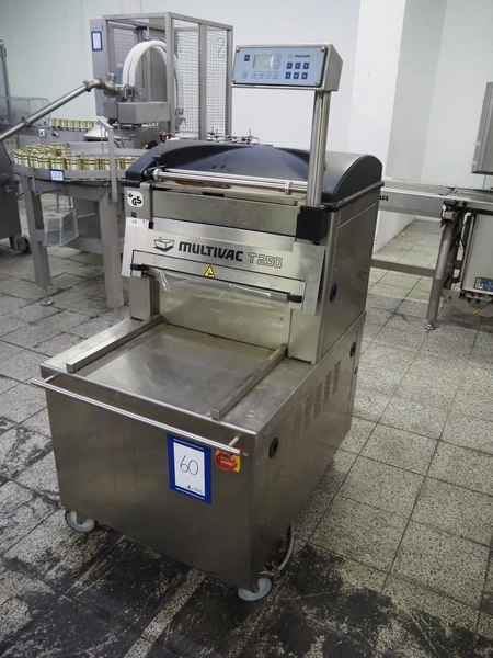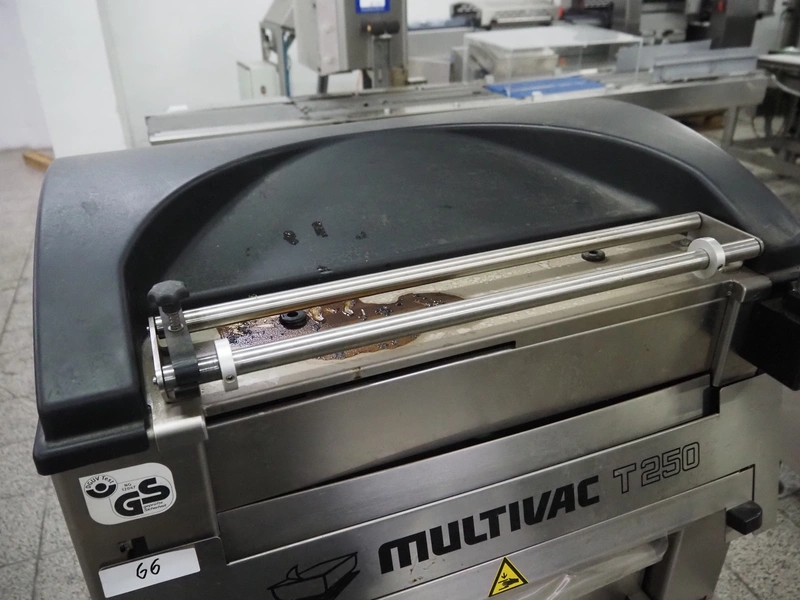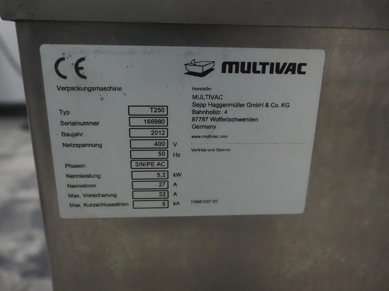 Multivac mobile traysealer, type: T250, serial number: 166980, year of construction: 2012, 400 V, 3 Ph, 50 Hz, 27/32 A, 5.2 kW, Busch vacuum pump, type: RA 100 F 503, year of construction: 2012, 100 m³/h, dimensions: 1300 mm x 800 mm x 1650 mm.