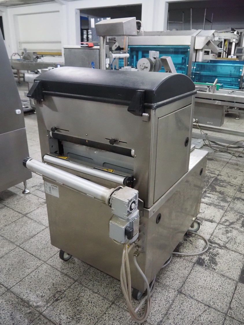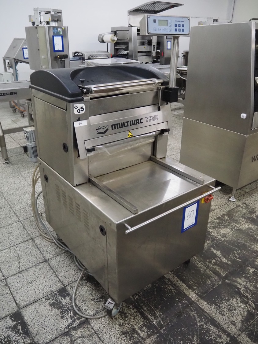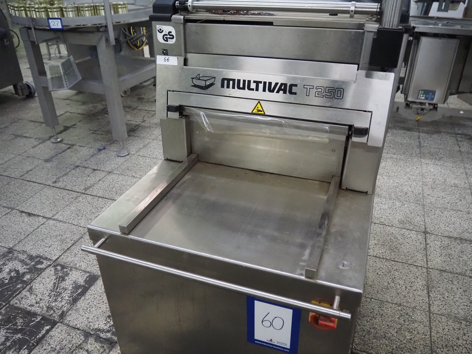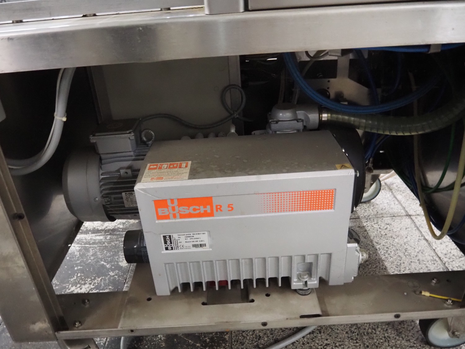 Multivac mobile traysealer, type: T250, serial number: 166980, year of construction: 2012, 400 V, 3 Ph, 50 Hz, 27/32 A, 5.2 kW, Busch vacuum pump, type: RA 100 F 503, year of construction: 2012, 100 m³/h, dimensions: 1300 mm x 800 mm x 1650 mm.