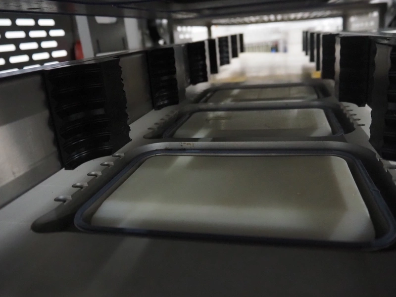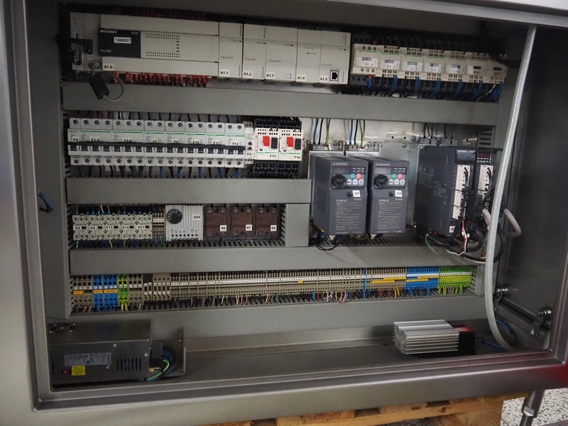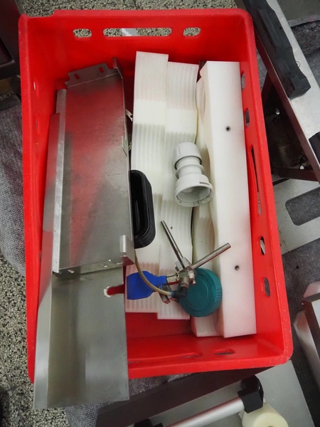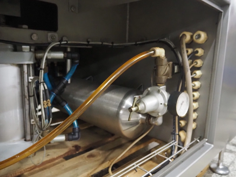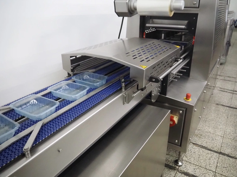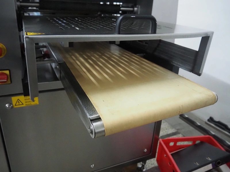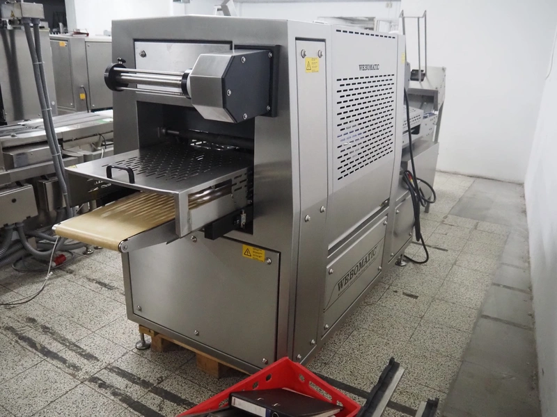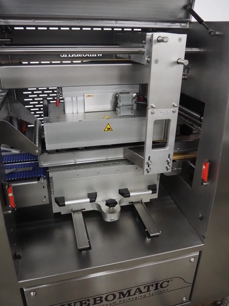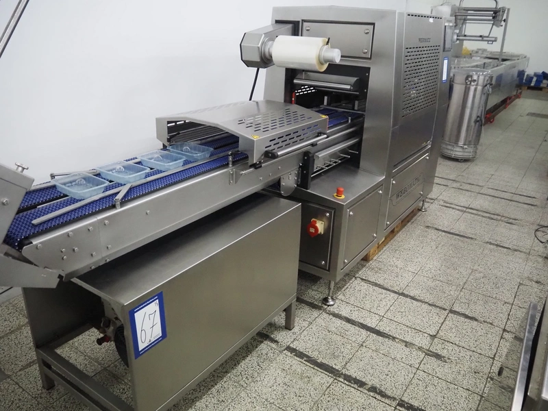 Webomatic traysealer, type: TL 500, serial number: F 9015VL160, year of construction: 2015, 400 V, 3 Ph, 50 Hz, 6.0 kW, plastic mesh belt, belt width: (2x) 150 mm, dye: (3x) 170 mm x 120 mm, film width: 280 mm, plastic outfeed belt, belt width: 310 mm, with Busch vacuum pump, type: RA 0100 F 503, capacity: 100 m³/h, total dimensions: 4000 mm x 1000 mm x 1600 mm. Including pallet with parts and extra dye: (4x) Ø 95 mm.