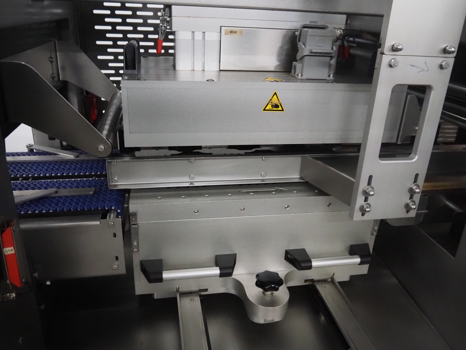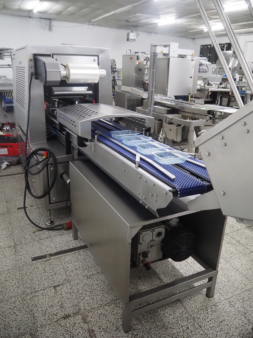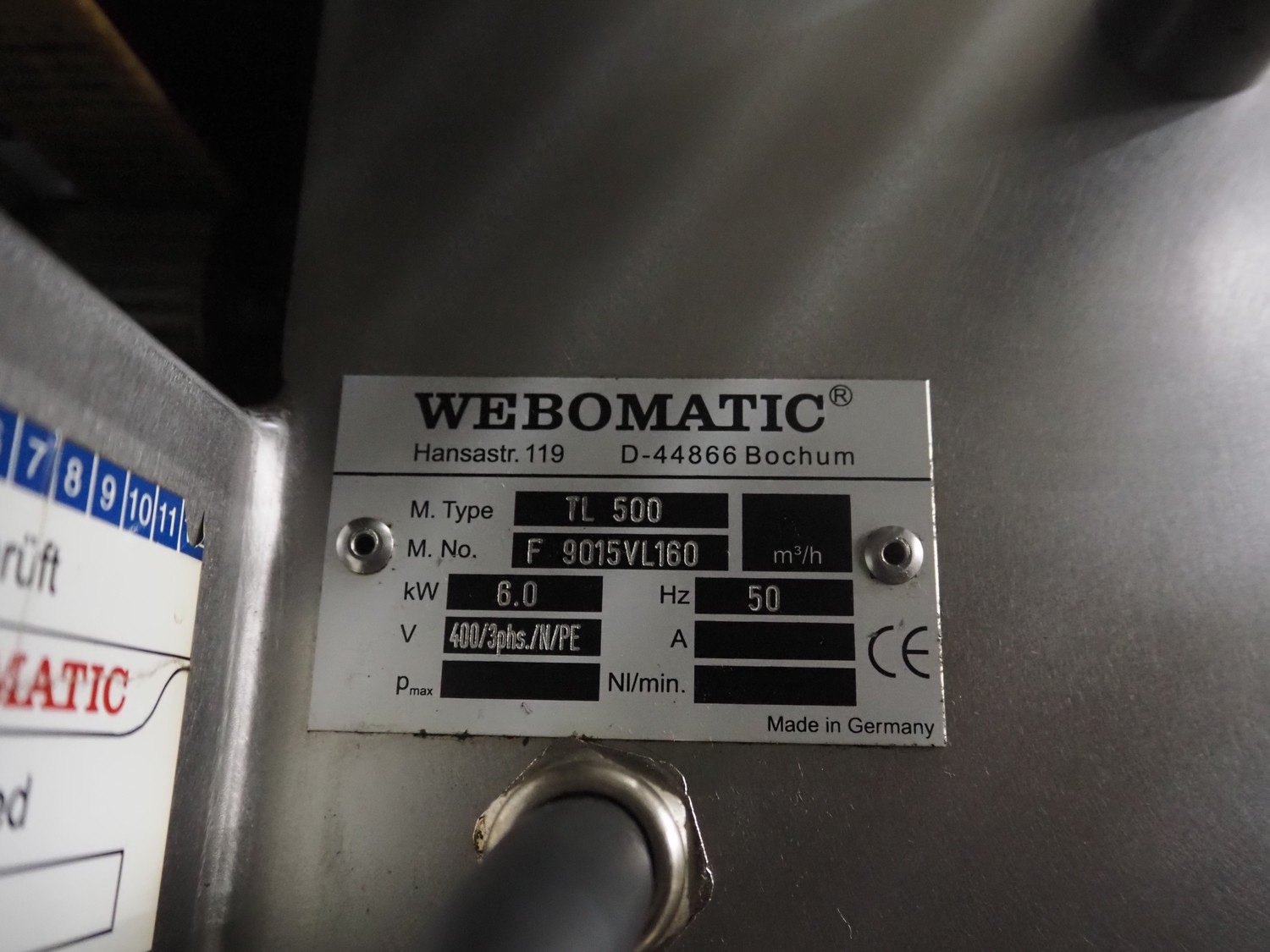 Webomatic traysealer, type: TL 500, serial number: F 9015VL160, year of construction: 2015, 400 V, 3 Ph, 50 Hz, 6.0 kW, plastic mesh belt, belt width: (2x) 150 mm, dye: (3x) 170 mm x 120 mm, film width: 280 mm, plastic outfeed belt, belt width: 310 mm, with Busch vacuum pump, type: RA 0100 F 503, capacity: 100 m³/h, total dimensions: 4000 mm x 1000 mm x 1600 mm. Including pallet with parts and extra dye: (4x) Ø 95 mm.