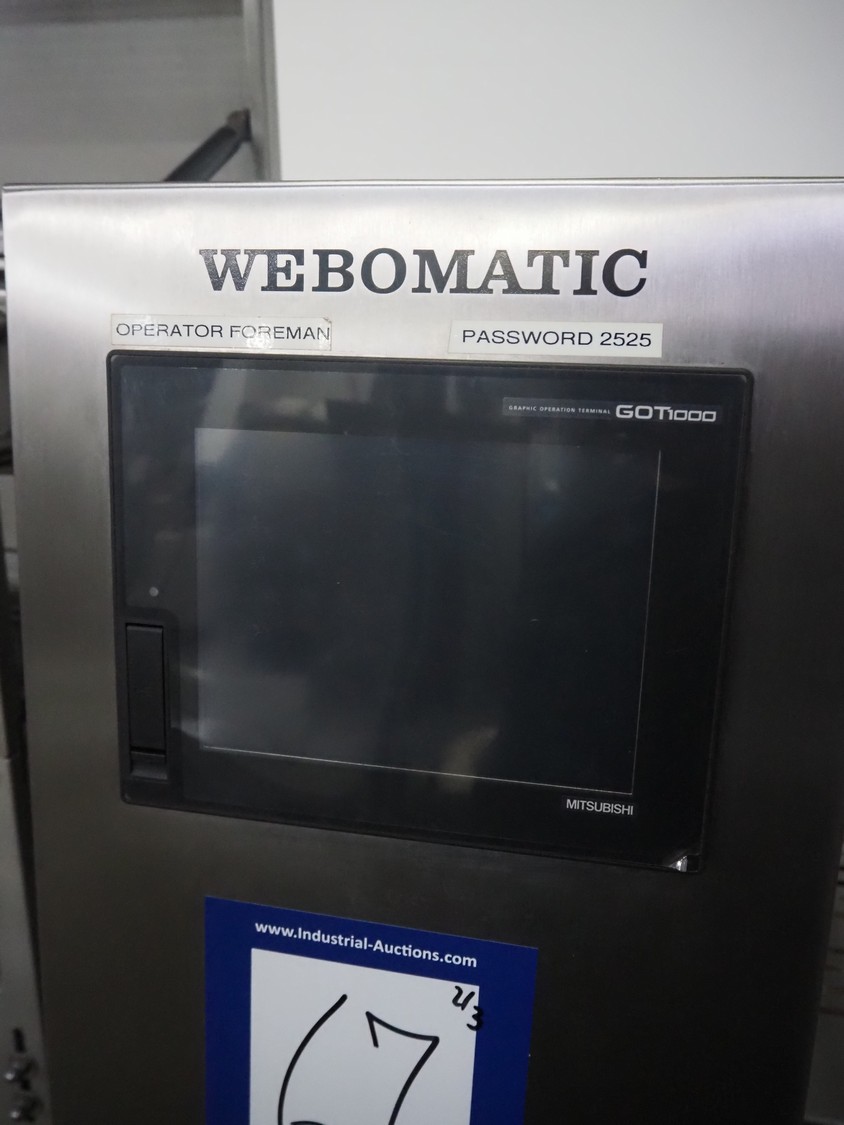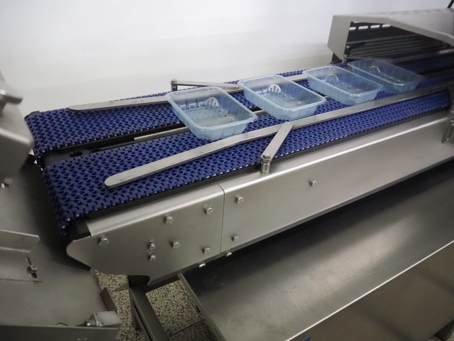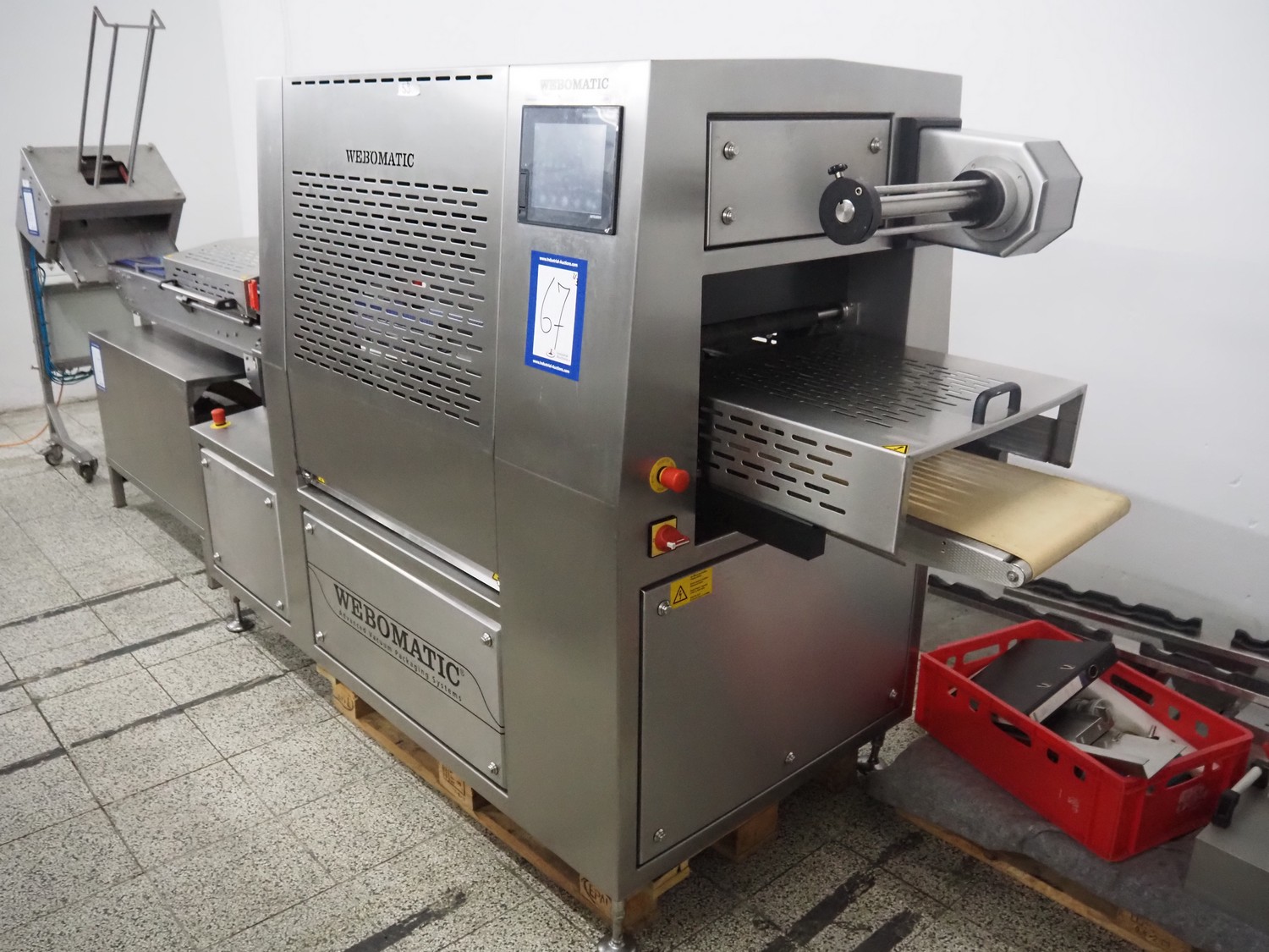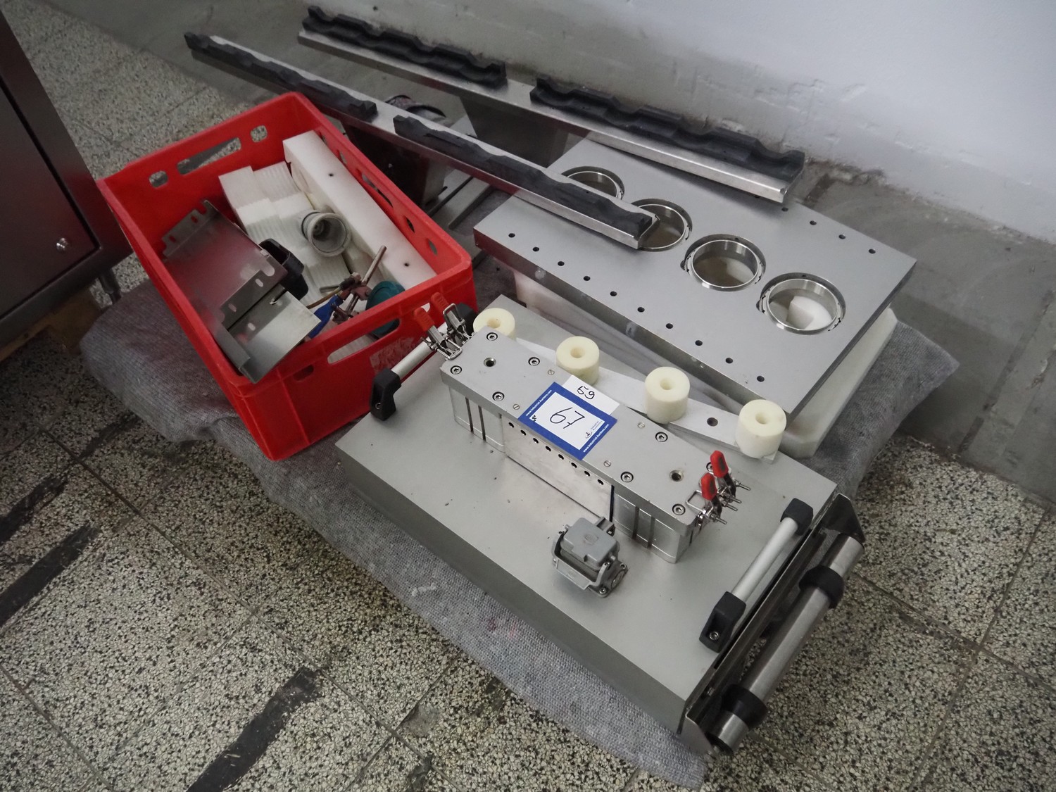 Webomatic traysealer, type: TL 500, serial number: F 9015VL160, year of construction: 2015, 400 V, 3 Ph, 50 Hz, 6.0 kW, plastic mesh belt, belt width: (2x) 150 mm, dye: (3x) 170 mm x 120 mm, film width: 280 mm, plastic outfeed belt, belt width: 310 mm, with Busch vacuum pump, type: RA 0100 F 503, capacity: 100 m³/h, total dimensions: 4000 mm x 1000 mm x 1600 mm. Including pallet with parts and extra dye: (4x) Ø 95 mm.