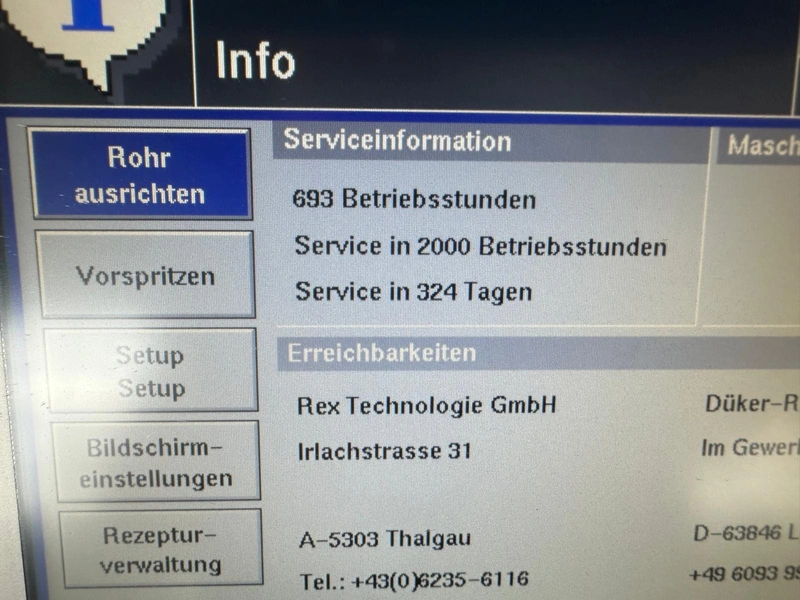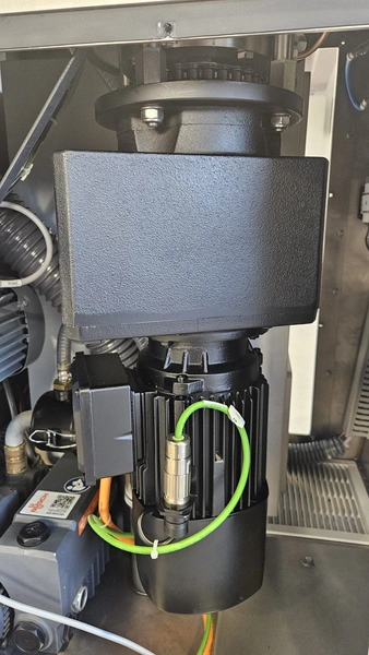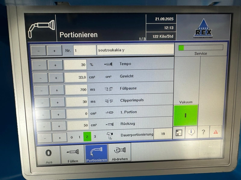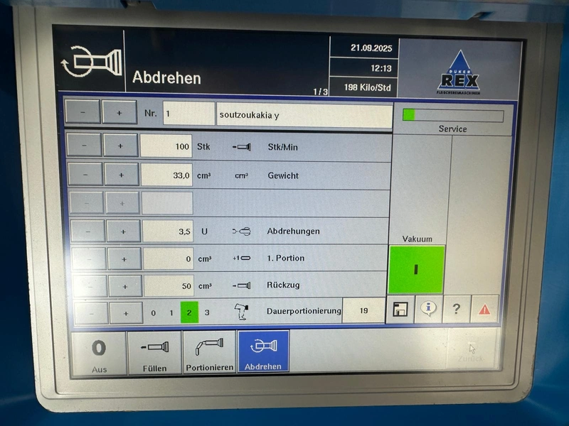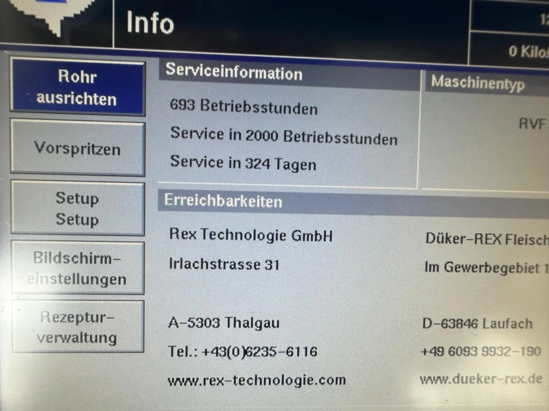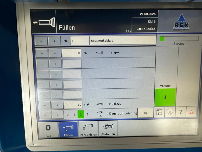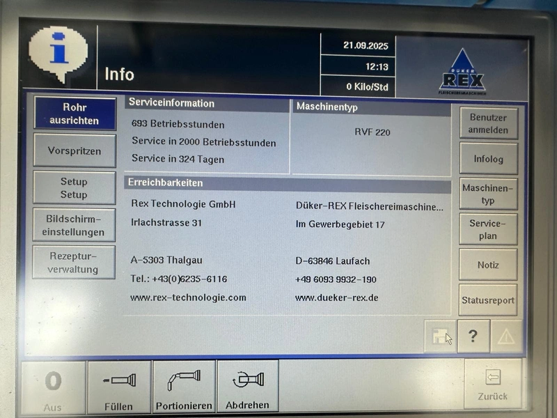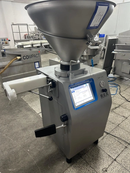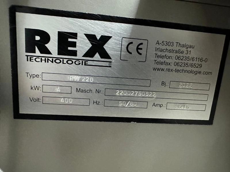 Rex vacuum filling machine with case holding device, type: RVF 220, machine number: 22002750522, year of construction: 2022, 400 V, 50/60 Hz, 4 kW, dimensions: 965 mm x 750 mm x 1720 mm.