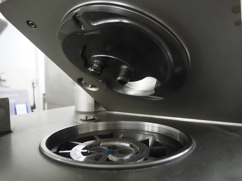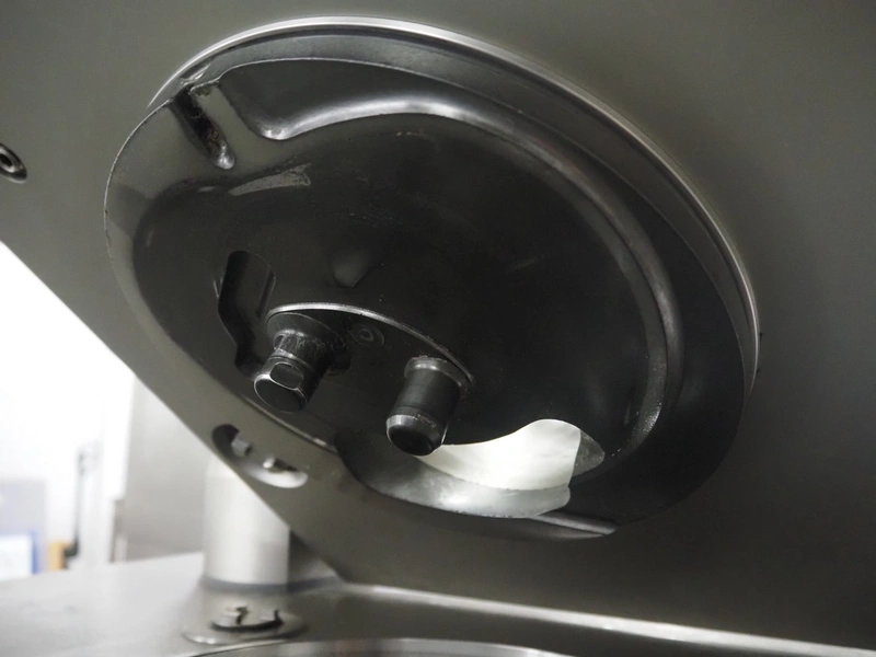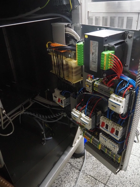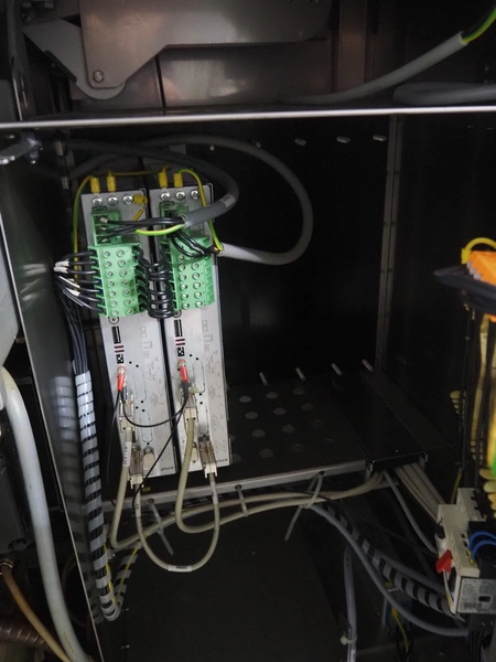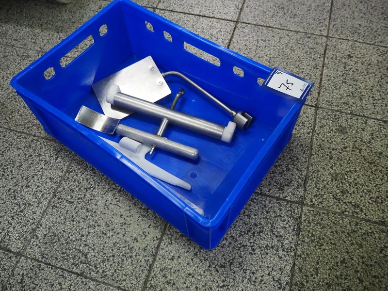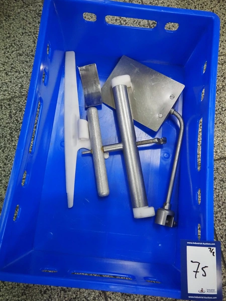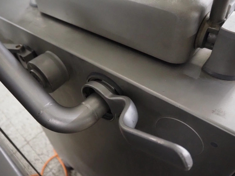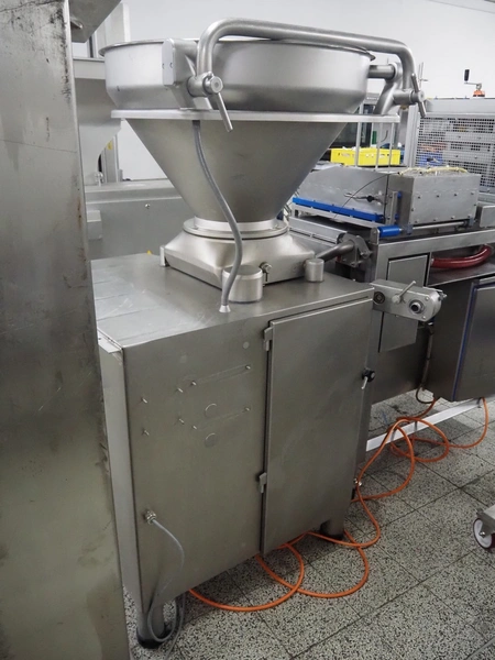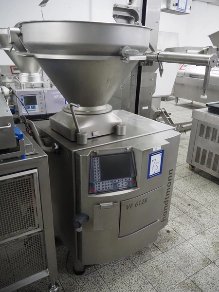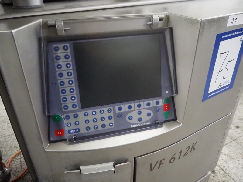 Handtmann vacuum filling machine, type: VF612K, serial number: 26223, year of construction: 2009, 400 V, 3 Ph, 50 Hz, 6.5 A, 4.5 kW, dimensions: 1300 mm x 950 mm x 1820 mm. Including linking gearbox and crate with parts.