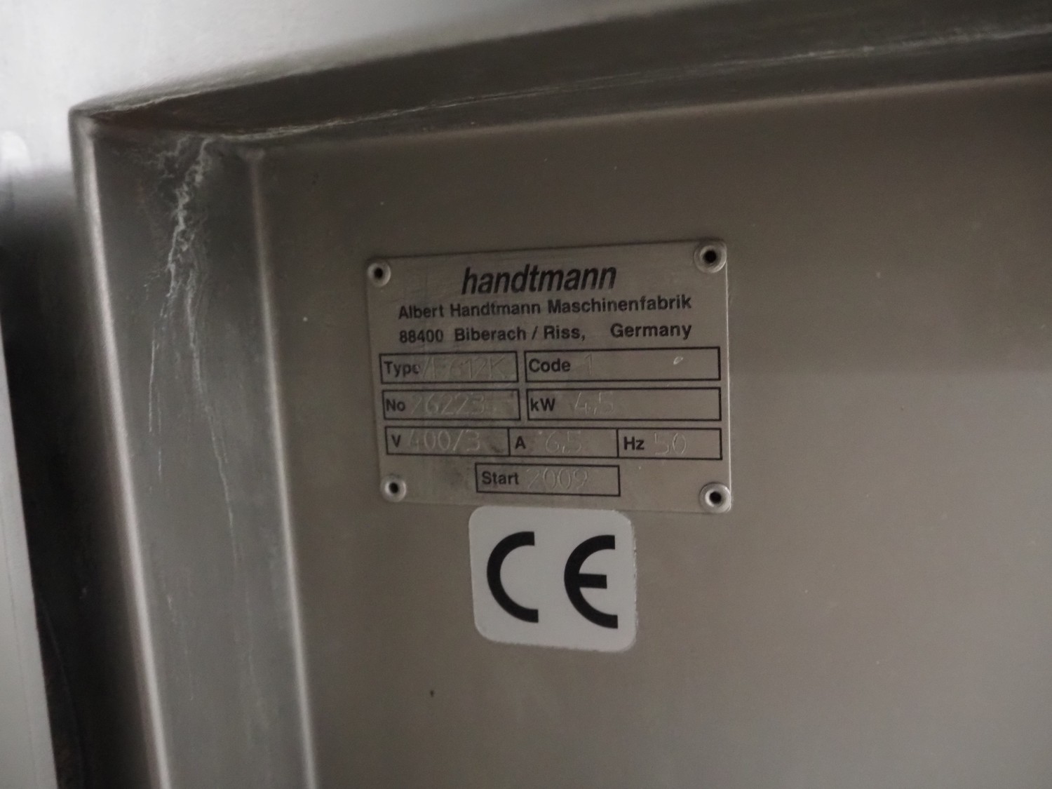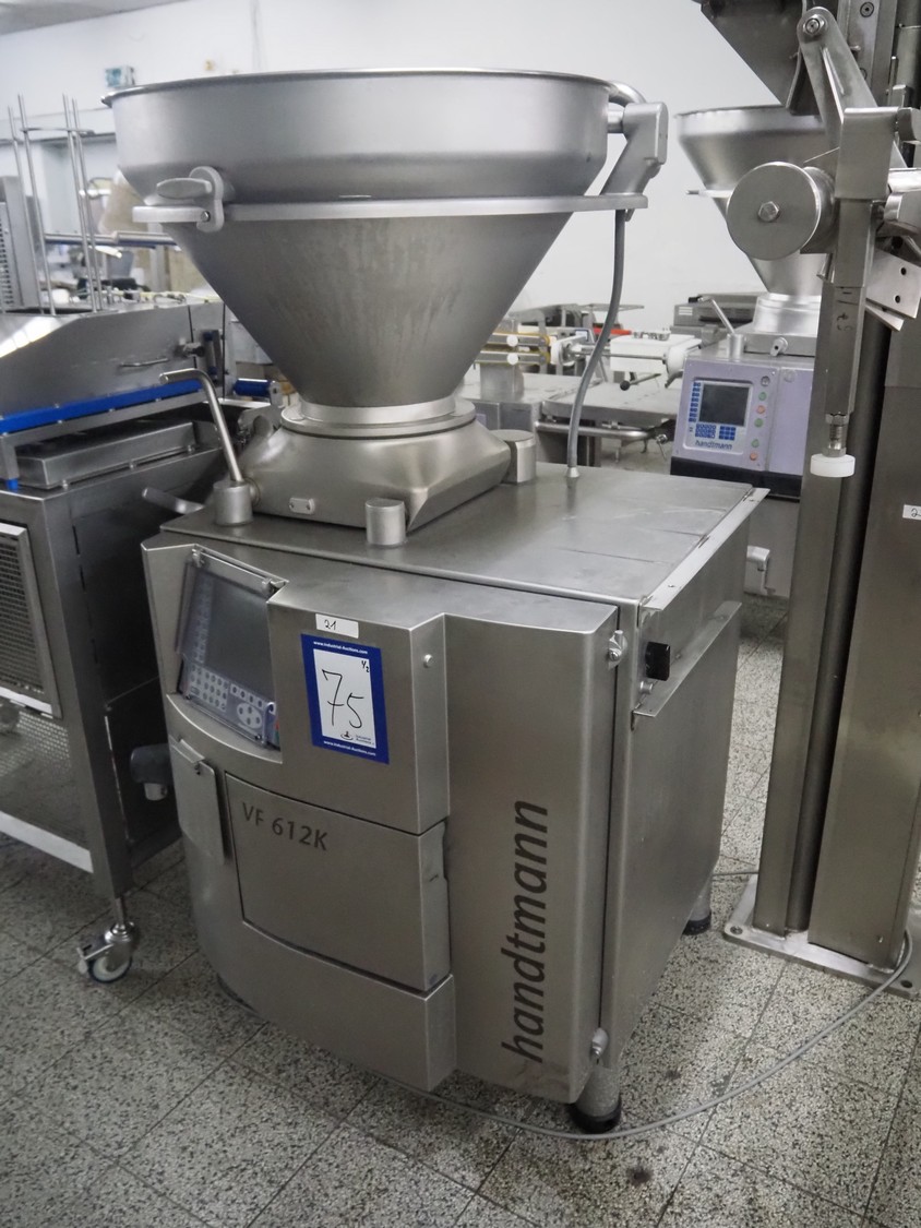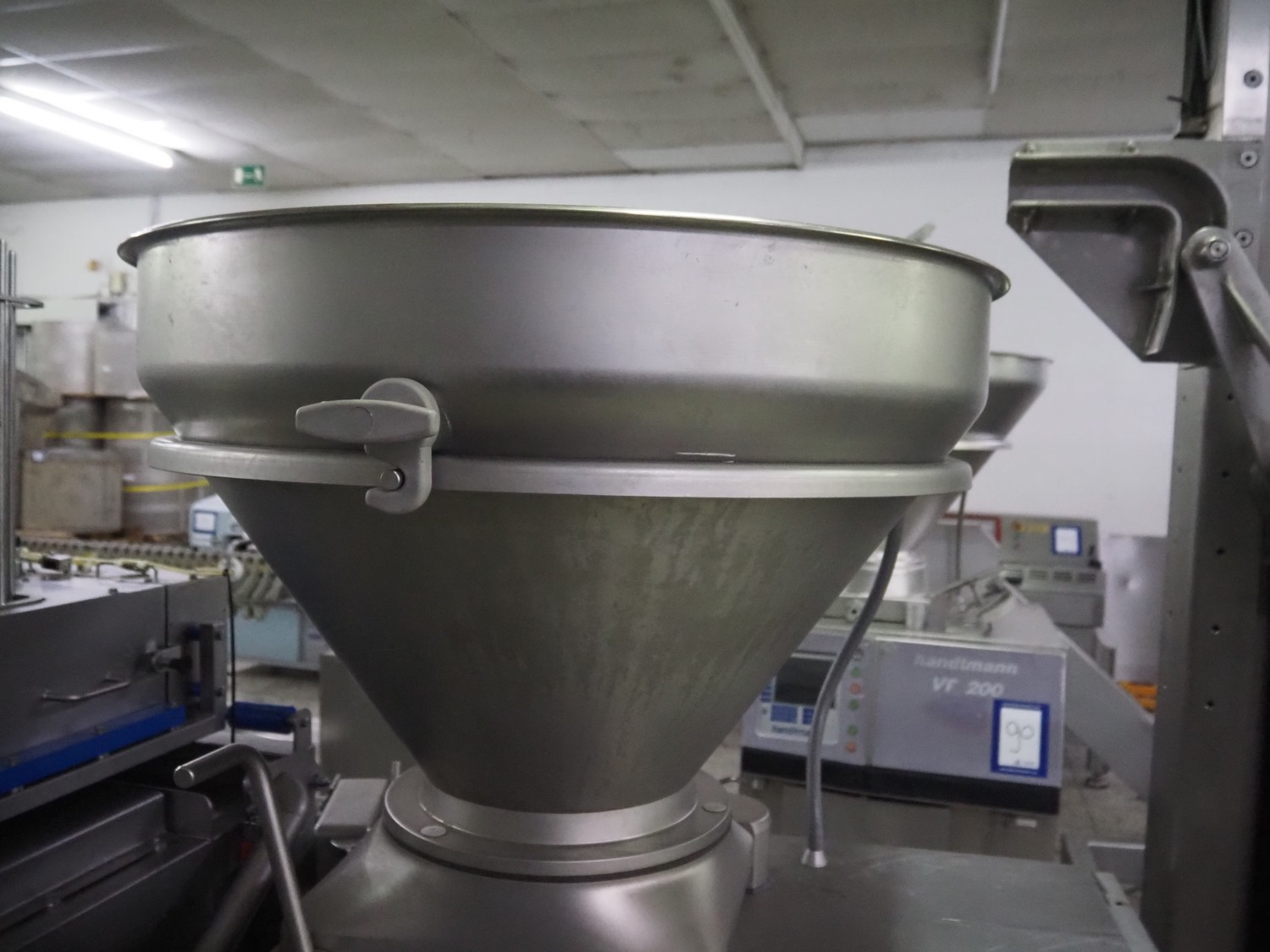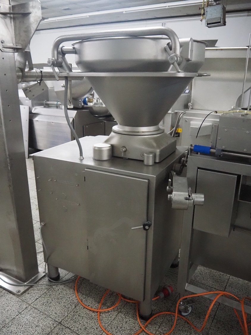Handtmann vacuum filling machine, type: VF612K, serial number: 26223, year of construction: 2009, 400 V, 3 Ph, 50 Hz, 6.5 A, 4.5 kW, dimensions: 1300 mm x 950 mm x 1820 mm. Including linking gearbox and crate with parts.