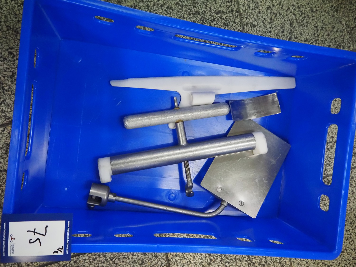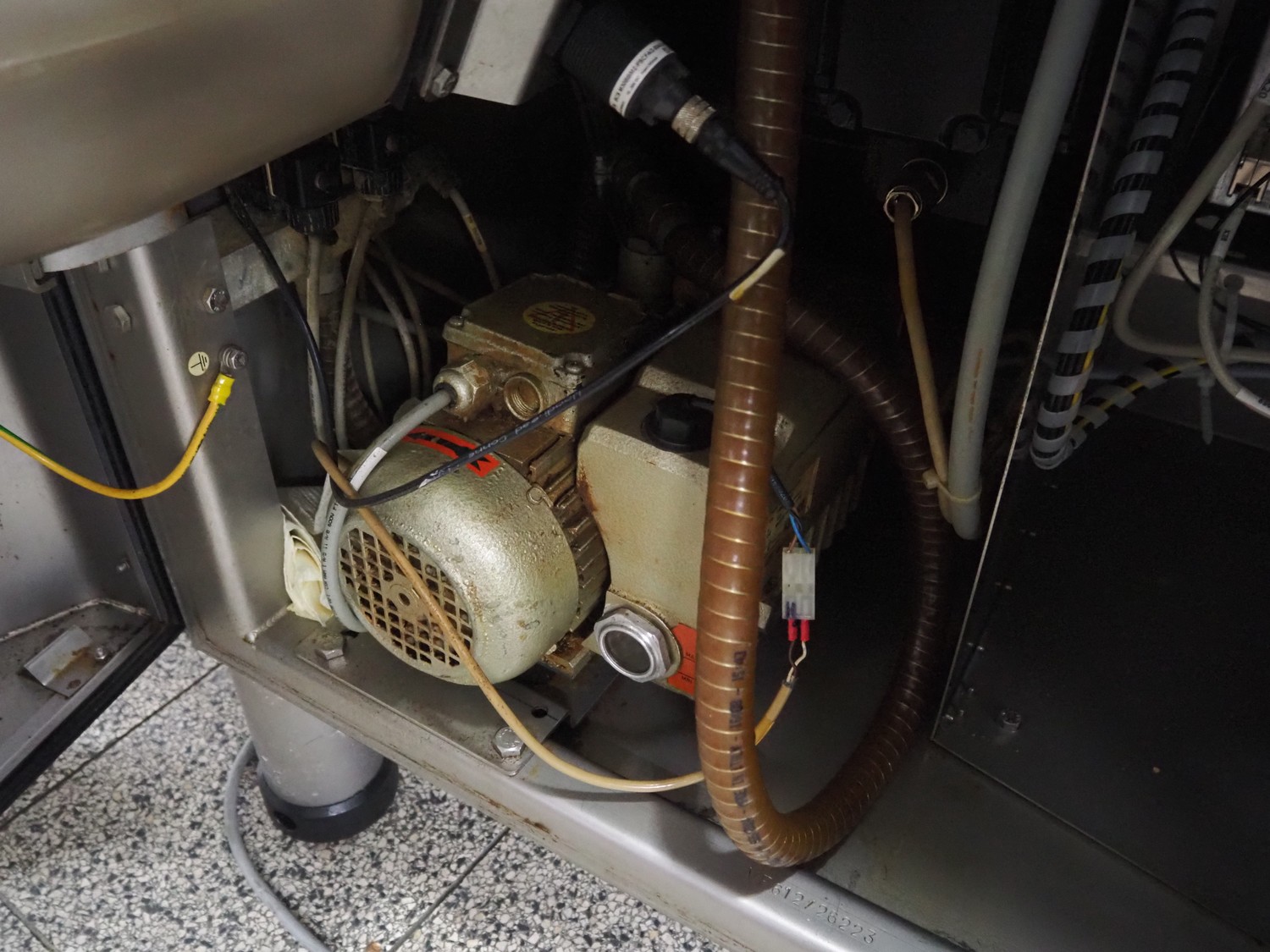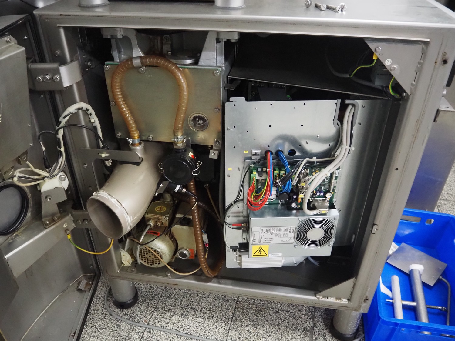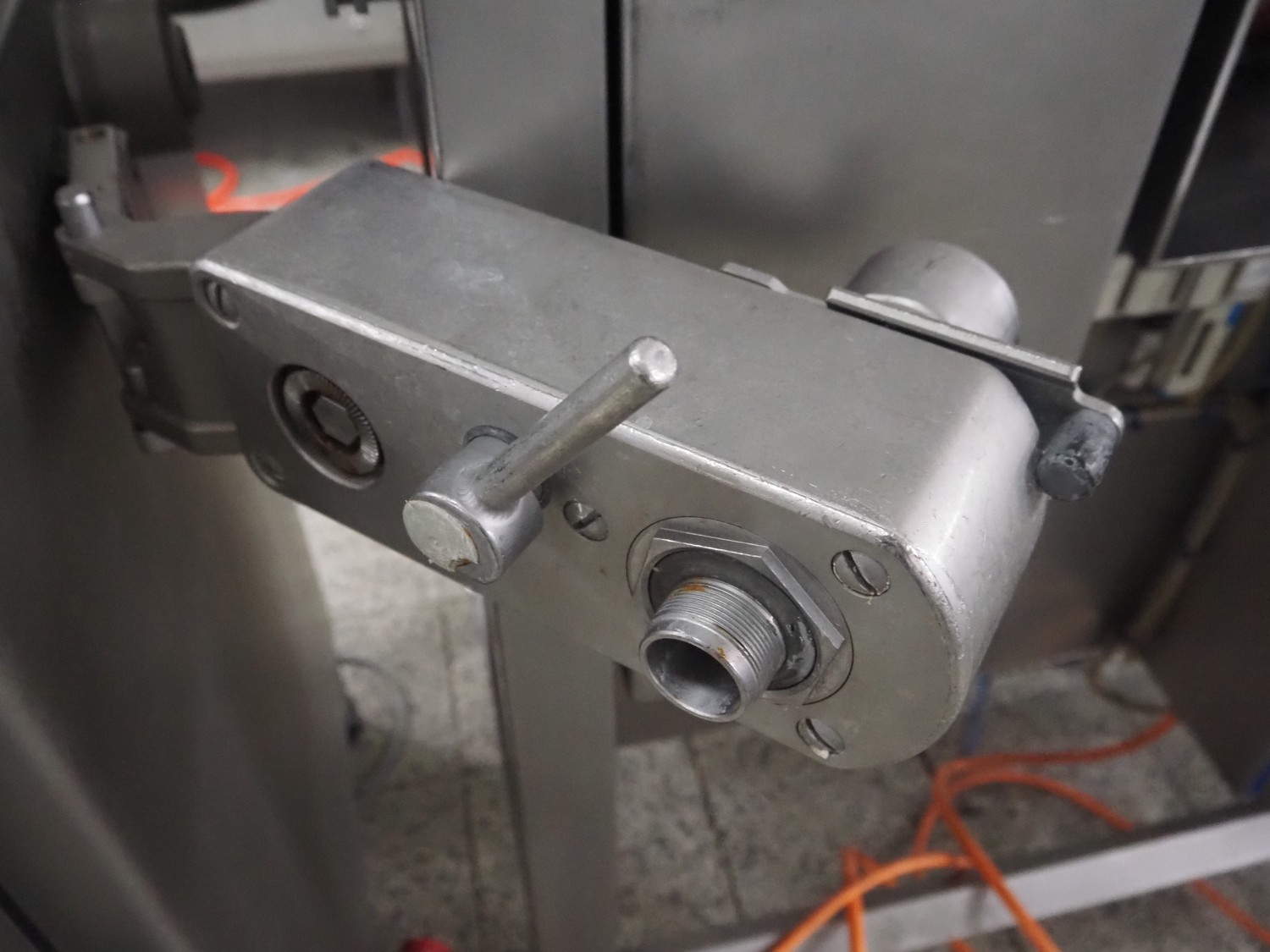 Handtmann vacuum filling machine, type: VF612K, serial number: 26223, year of construction: 2009, 400 V, 3 Ph, 50 Hz, 6.5 A, 4.5 kW, dimensions: 1300 mm x 950 mm x 1820 mm. Including linking gearbox and crate with parts.