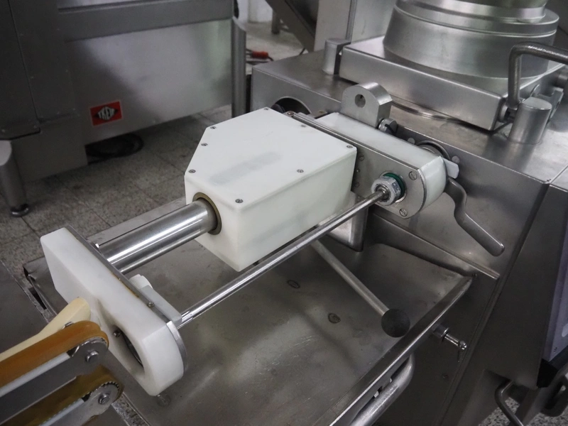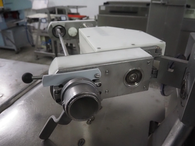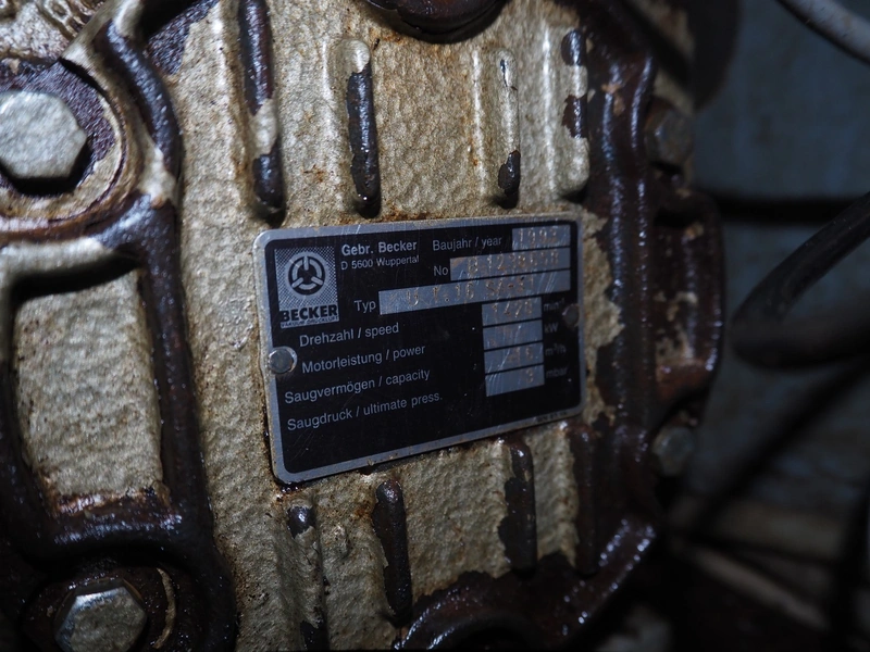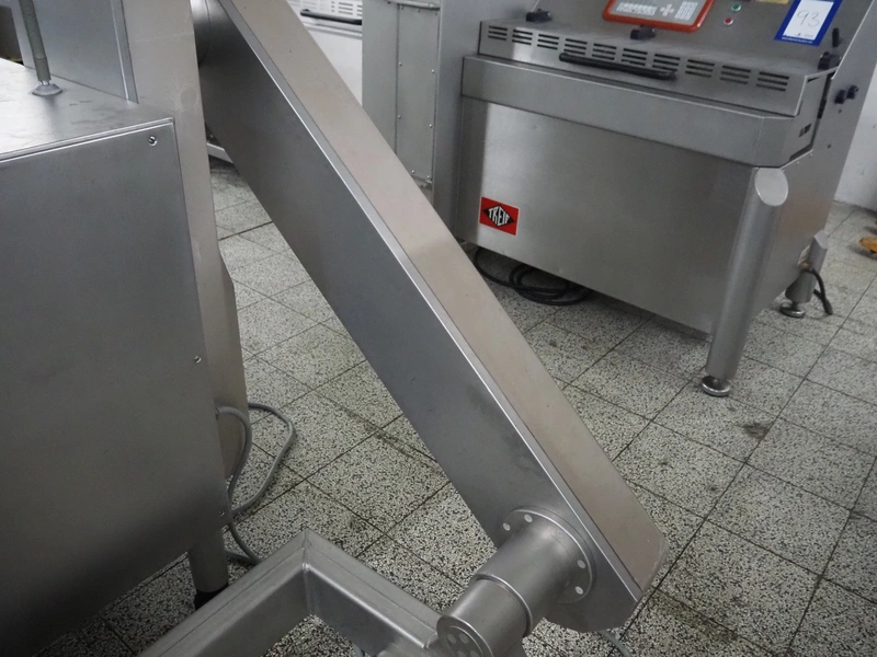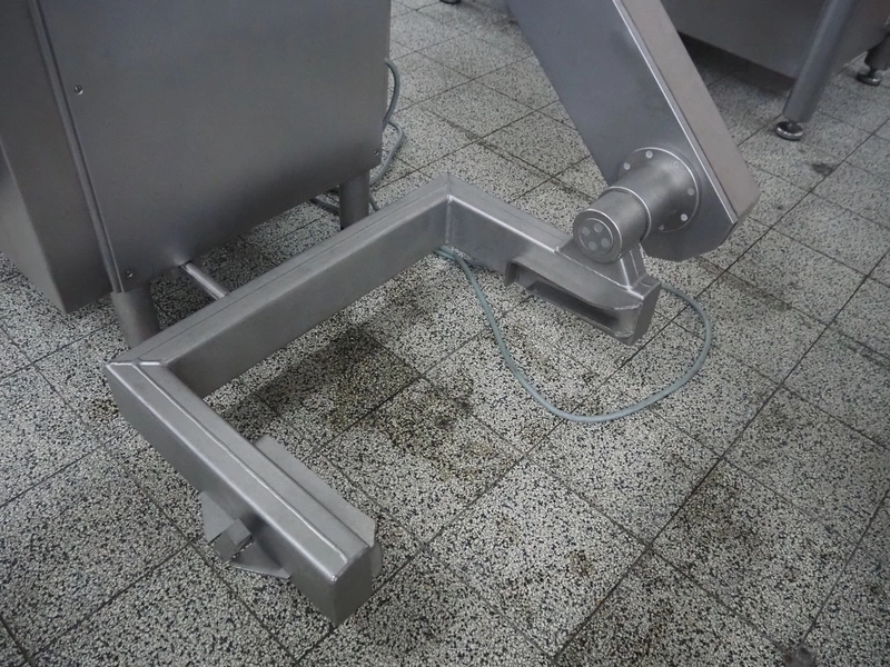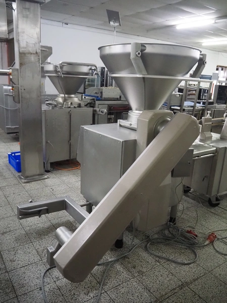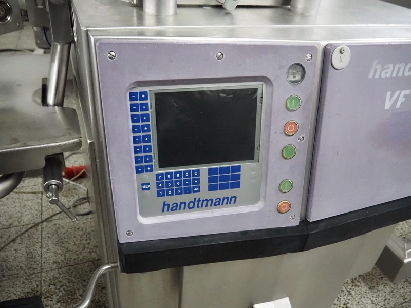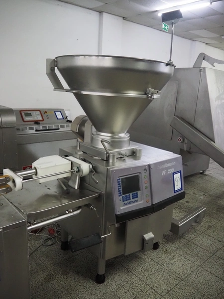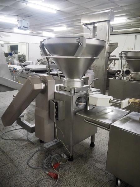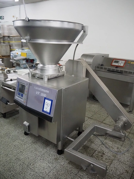 Handtmann vacuum filling machine with lifter for 200 liter meat bins, type: VF 200, 400 V, 50 Hz, 17 A, 6.5 A, with Becker pump, type: U1.16 SA-31, year of construction: 1993, dimensions: 2050 mm x 1400 mm x 2400 mm. Including linking gearbox and case holding device.