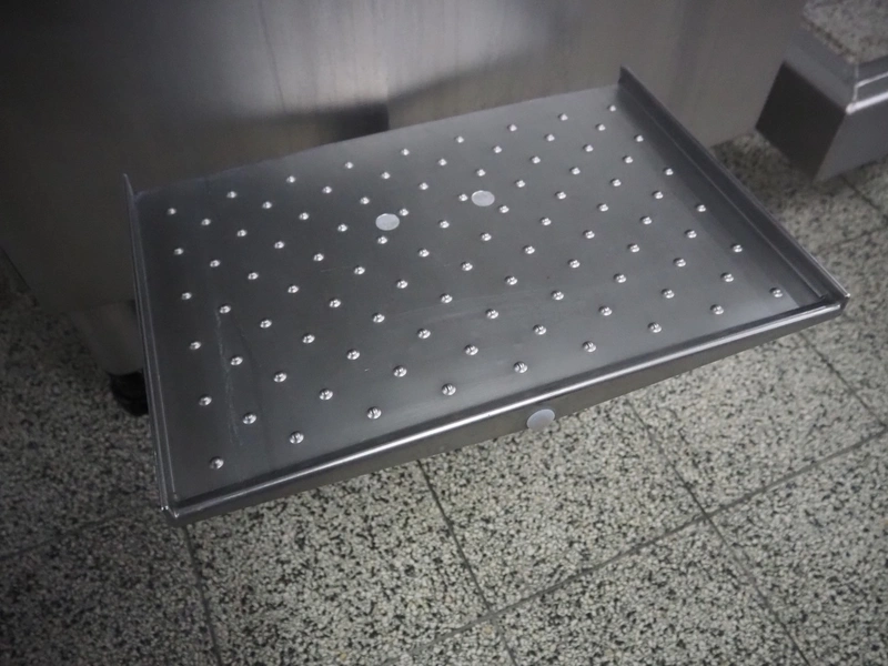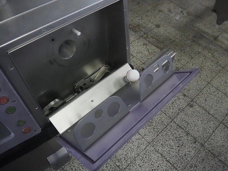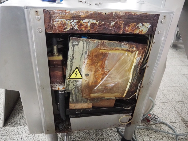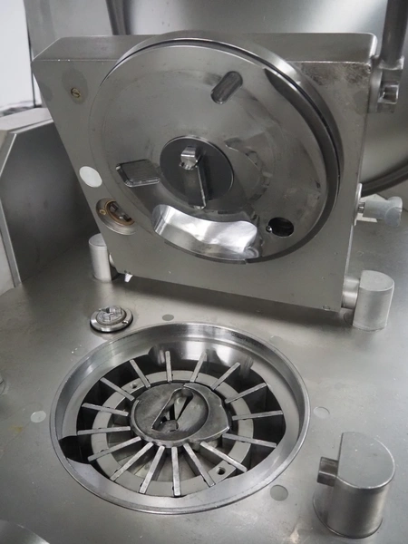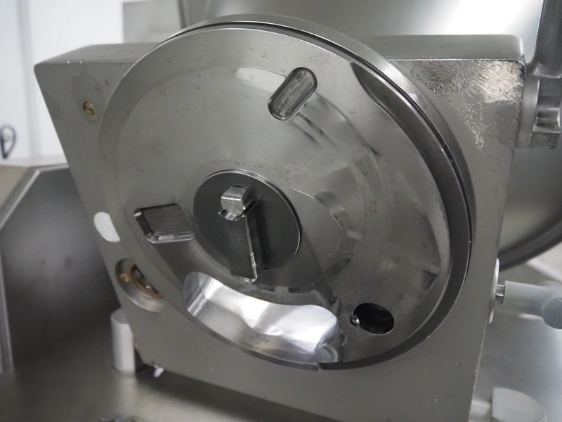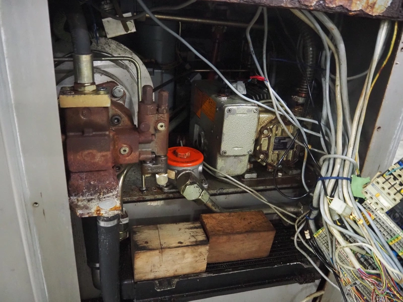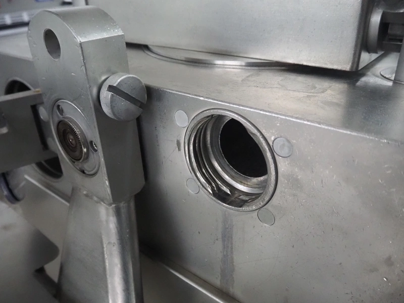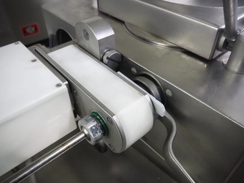 Handtmann vacuum filling machine with lifter for 200 liter meat bins, type: VF 200, 400 V, 50 Hz, 17 A, 6.5 A, with Becker pump, type: U1.16 SA-31, year of construction: 1993, dimensions: 2050 mm x 1400 mm x 2400 mm. Including linking gearbox and case holding device.
