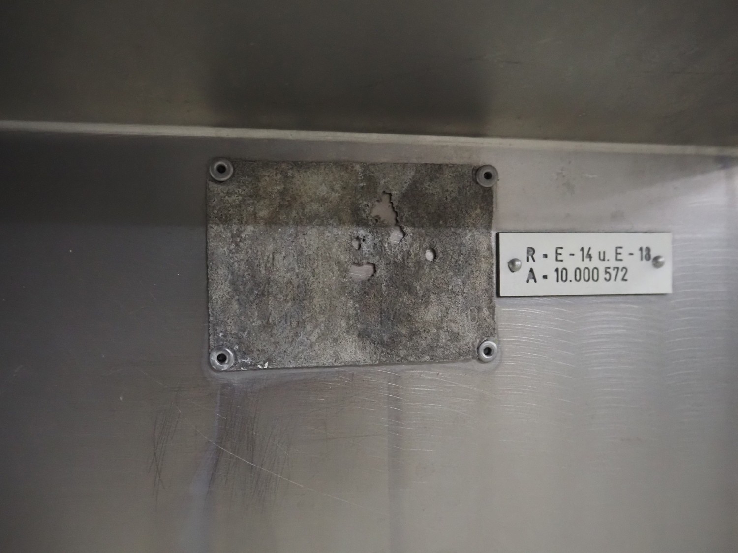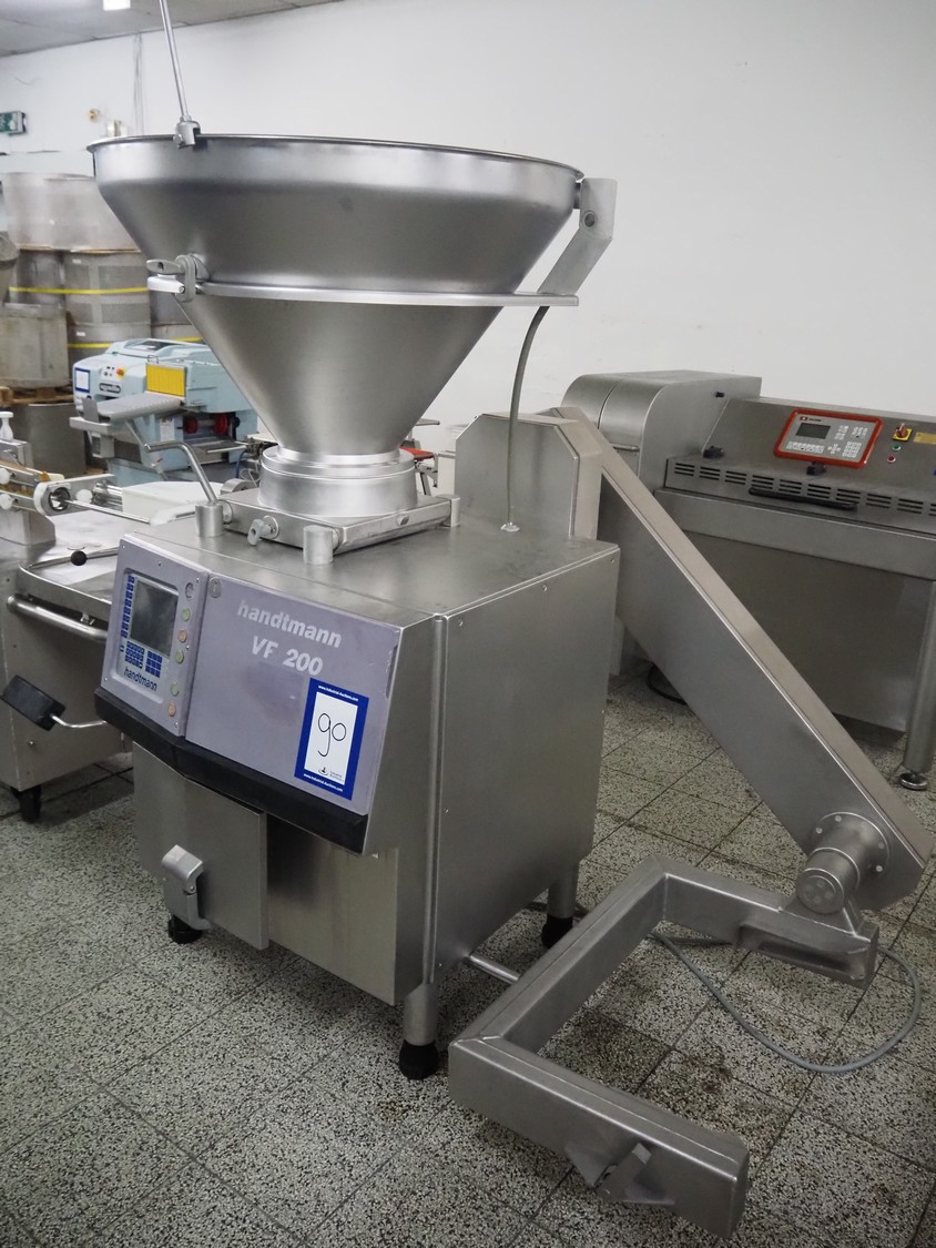Handtmann vacuum filling machine with lifter for 200 liter meat bins, type: VF 200, 400 V, 50 Hz, 17 A, 6.5 A, with Becker pump, type: U1.16 SA-31, year of construction: 1993, dimensions: 2050 mm x 1400 mm x 2400 mm. Including linking gearbox and case holding device.