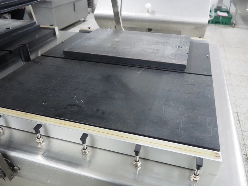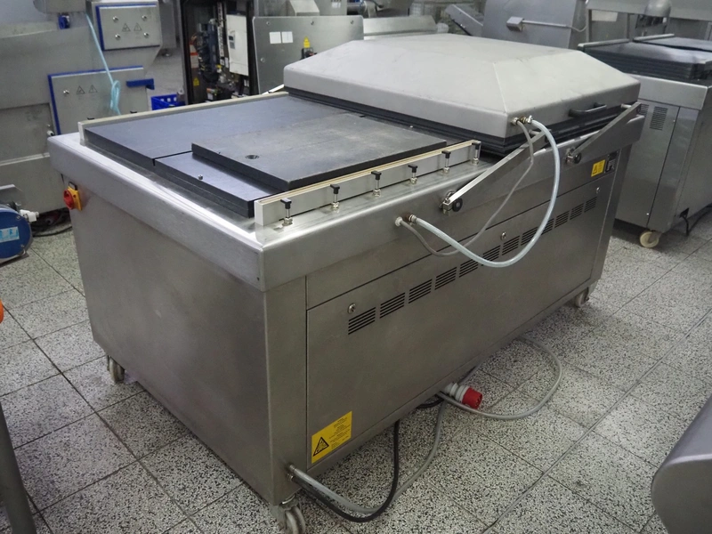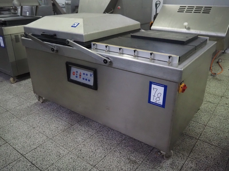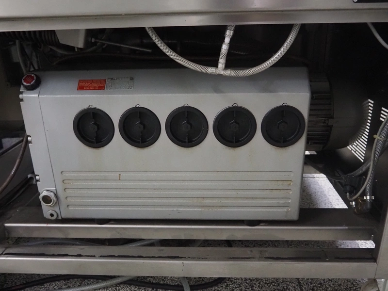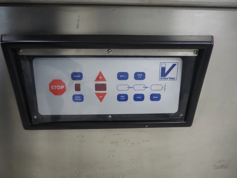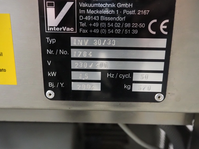 Intervac vacuumtechnik GmbH mobile double chamber vacuum machine with gas flush, type: INV 30/30, serial number: 1764, year of construction: 2004, 230/400 V, 50 Hz, 7.5 kW, weight: 570 kg, chamber dimensions: (2x) 870 mm x 820 mm, seal width: (4x) 815 mm, Gardner Denver vacuum pump, type: V-VC 303 (20), capacity: 300.0/360.0 m³/h, total dimensions: 2000 mm x 1200 mm x 1150 mm.