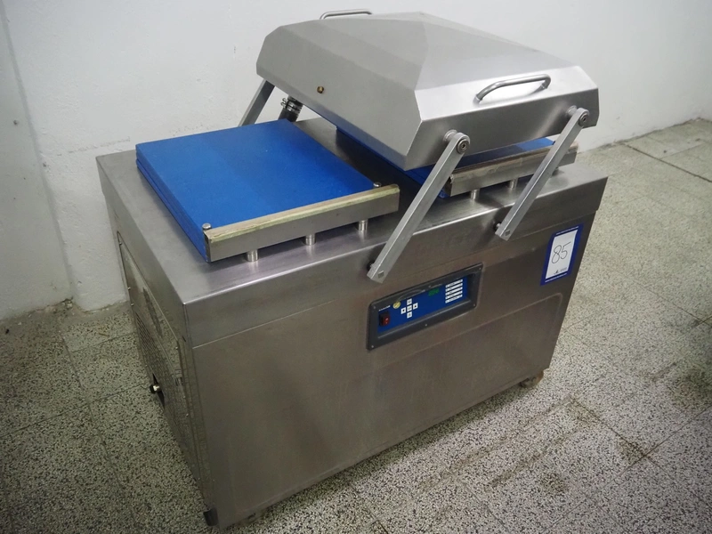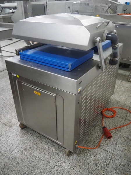 Komet Maschinenfabrik GmbH mobile double chamber vacuum machine, seal length: (2x) 480 mm, dimensions chamber: (2x) 600 mm x 480 mm, Busch vacuum pump, type: RA 0100 E 5Z1, number: 99012428, capacity: 100 m³ per hour, total dimensions: 1300 mm x 900 mm x 1100 mm.