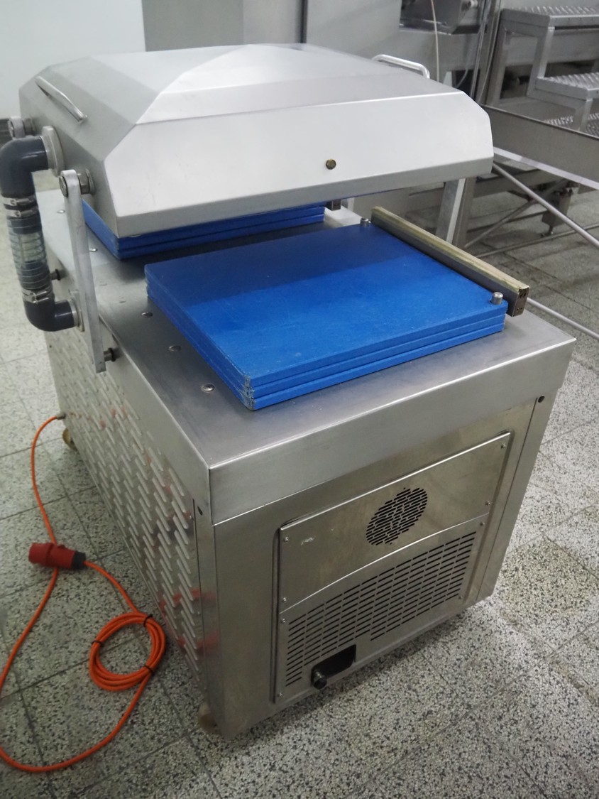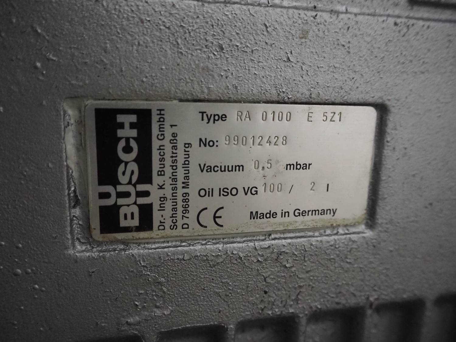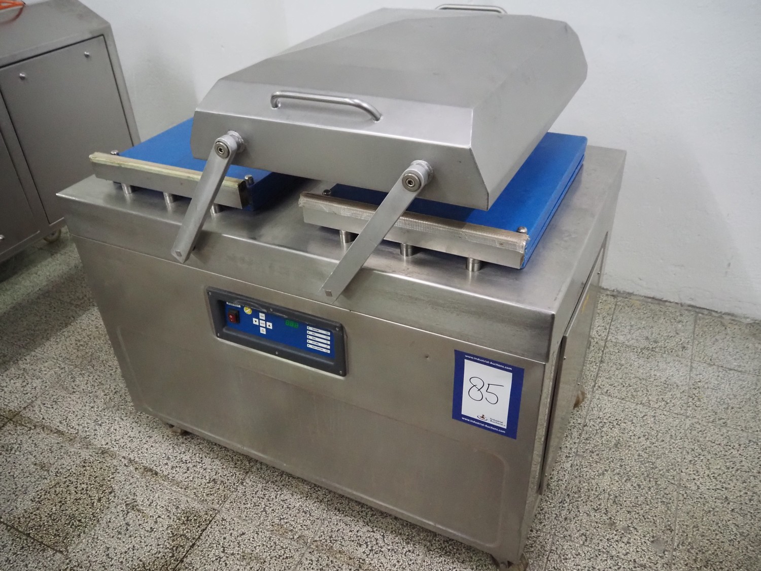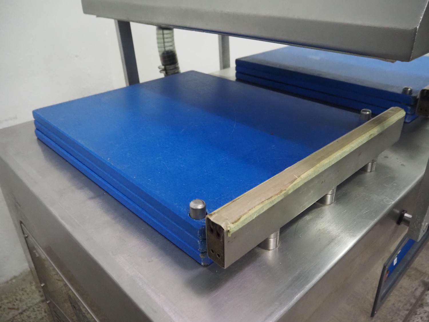 Komet Maschinenfabrik GmbH mobile double chamber vacuum machine, seal length: (2x) 480 mm, dimensions chamber: (2x) 600 mm x 480 mm, Busch vacuum pump, type: RA 0100 E 5Z1, number: 99012428, capacity: 100 m³ per hour, total dimensions: 1300 mm x 900 mm x 1100 mm.