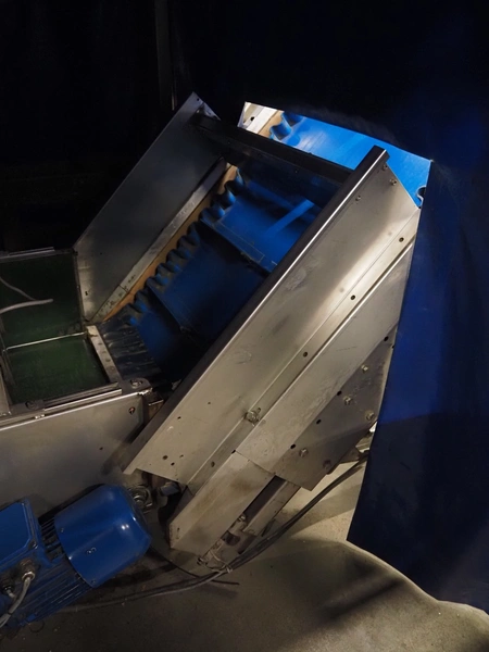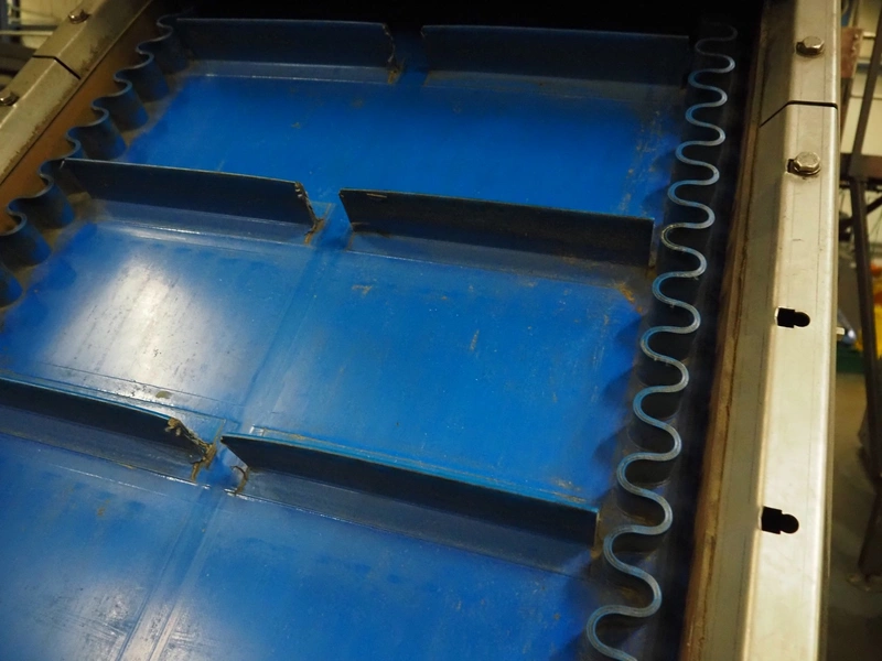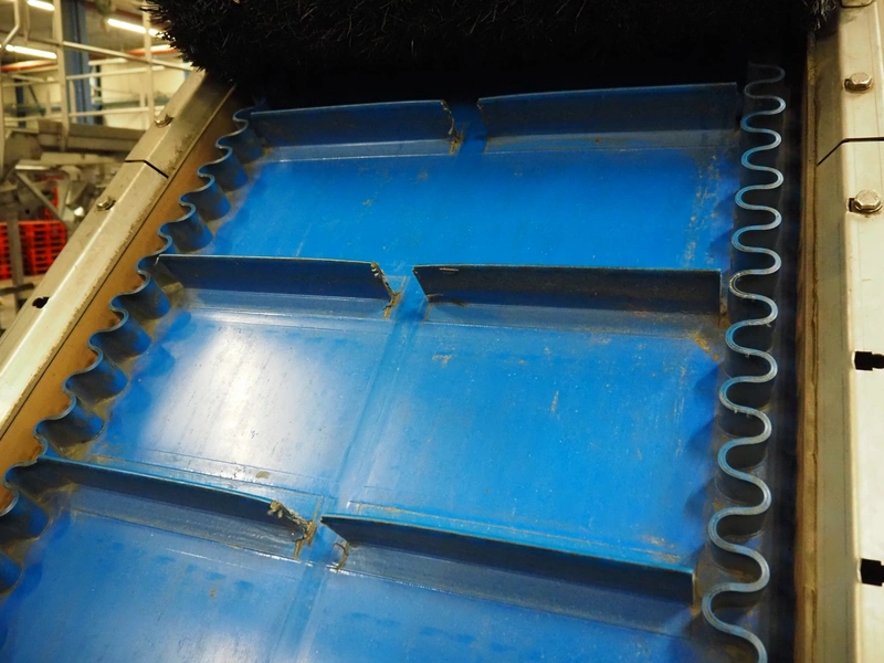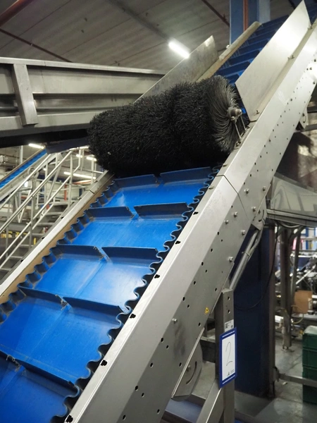 Burg's Machinefabriek elevating belt with brush, s/s frame, plastic belt and dividers, belt width: 620 mm, distance between dividers: 250 mm, divider height: 60 mm, elevating height: 4000 mm, brush width: 750 mm, total dimensions: 5400 mm x 1150 mm x 4300 mm.