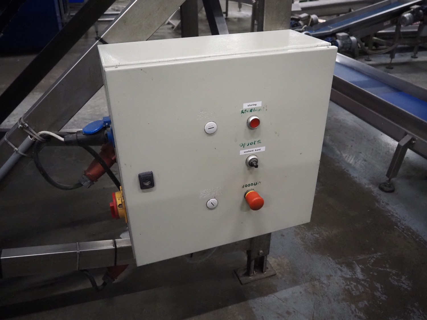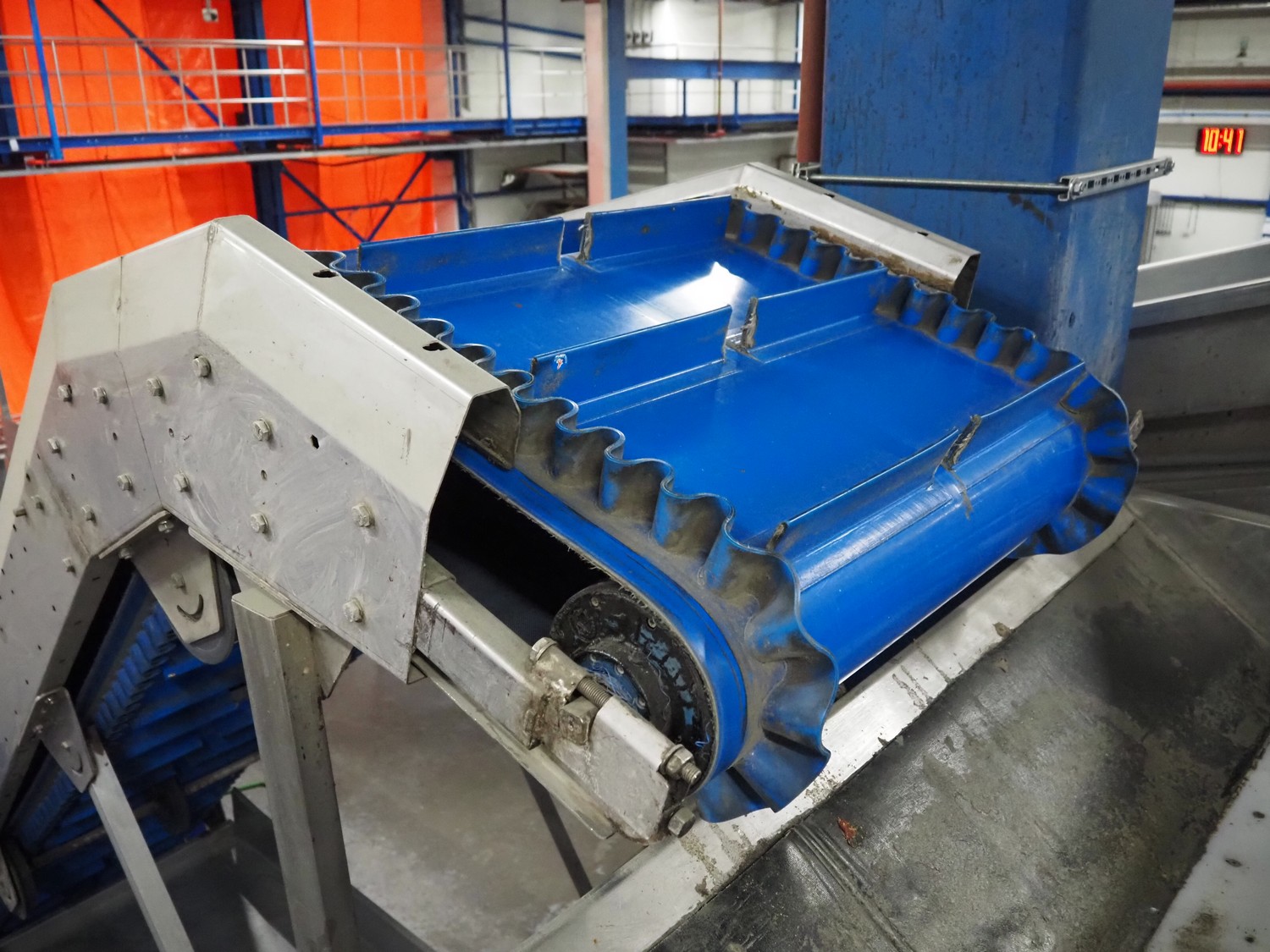 Burg's Machinefabriek elevating belt with brush, s/s frame, plastic belt and dividers, belt width: 620 mm, distance between dividers: 250 mm, divider height: 60 mm, elevating height: 4000 mm, brush width: 750 mm, total dimensions: 5400 mm x 1150 mm x 4300 mm.