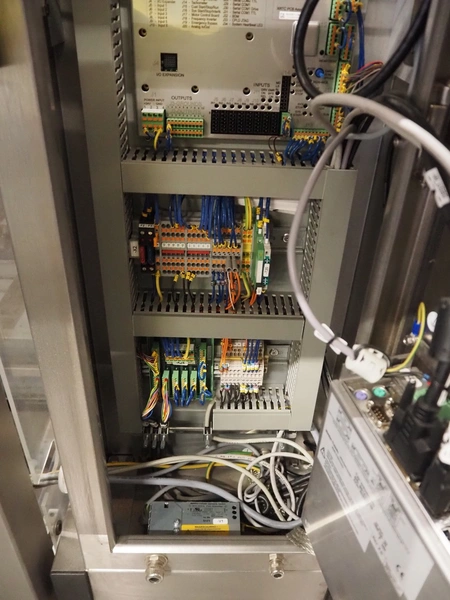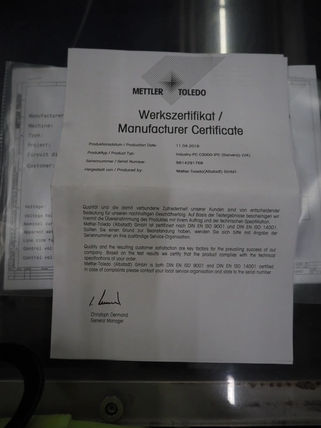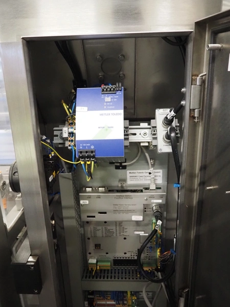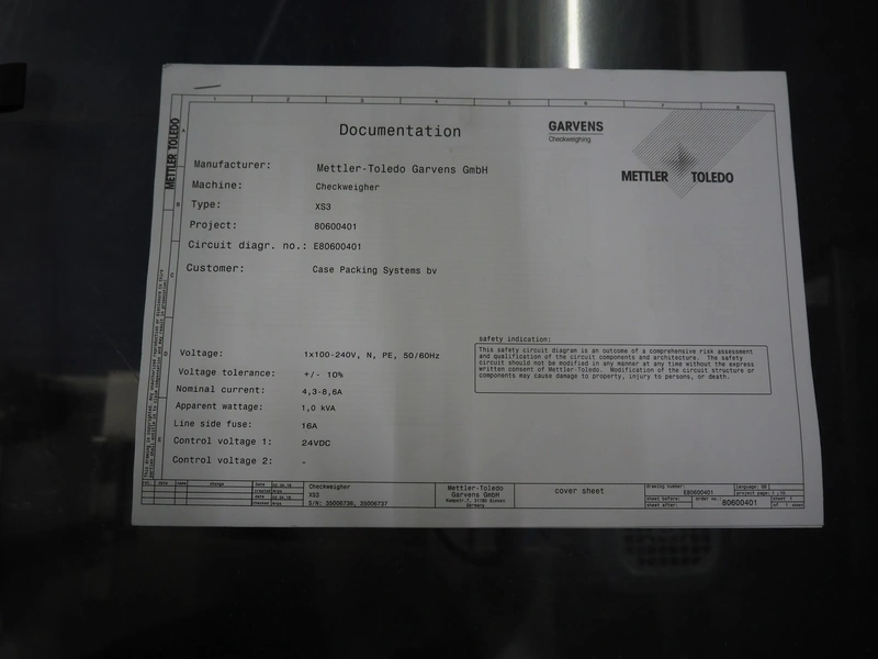 Mettler-Toledo Garvens GmbH check weigher, type: XS 3, number: 35006736 year of construction: 2016, 100-240 V, 50-60 Hz, maximum: 6000 gram, minimum: 0 gram, d= 1 gram, T= -5400 gram, plastic belt, belt width: (2x) 380 mm, total dimensions: 1100 mm x 930 mm x 1800 mm.