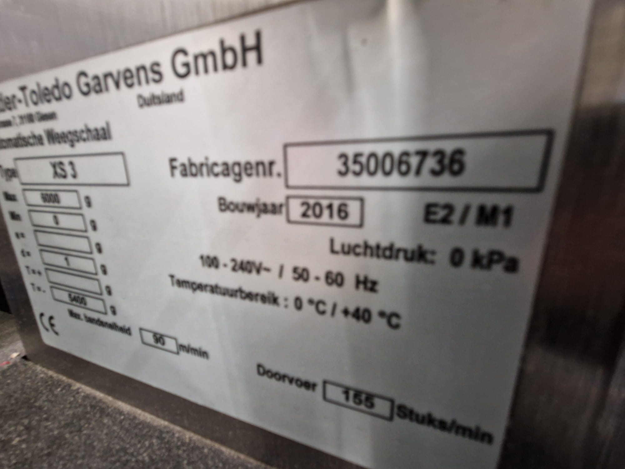 Mettler-Toledo Garvens GmbH check weigher, type: XS 3, number: 35006736 year of construction: 2016, 100-240 V, 50-60 Hz, maximum: 6000 gram, minimum: 0 gram, d= 1 gram, T= -5400 gram, plastic belt, belt width: (2x) 380 mm, total dimensions: 1100 mm x 930 mm x 1800 mm.
