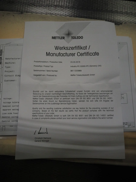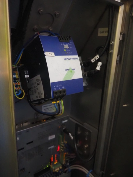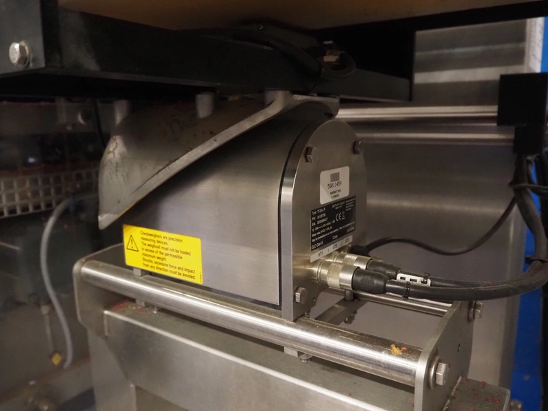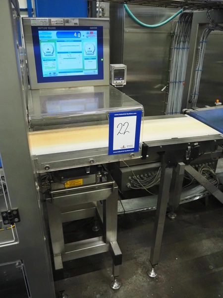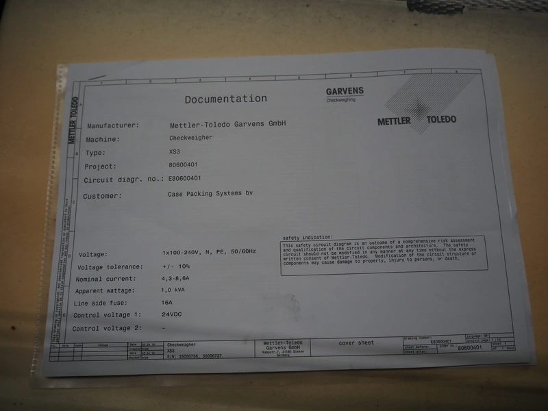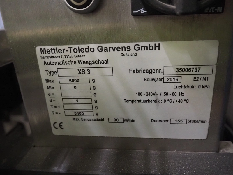 Mettler-Toledo Garvens GmbH check weigher, type: XS 3, number: 35006737 year of construction: 2016, 100-240 V, 50-60 Hz, maximum: 6000 gram, minimum: 0 gram, d= 1 gram, T= -5400 gram, plastic belt, belt width: (2x) 380 mm, total dimensions: 1100 mm x 930 mm x 1800 mm.