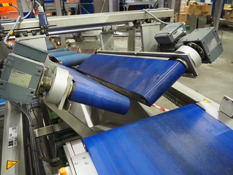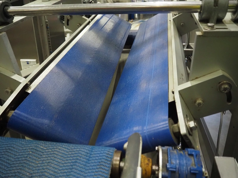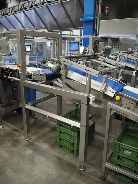 CPS Case Packing Systems buffer belt, number: 42321, year of construction: 06-2016, plastic belt, belt width: (2x) 200 mm and 450 mm, total dimensions: 1550 mm x 980 mm x 1840 mm.