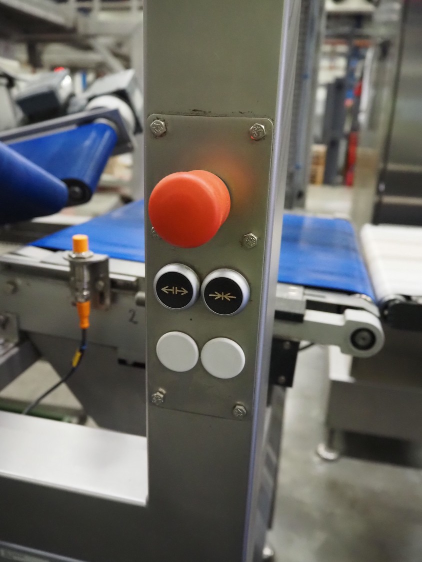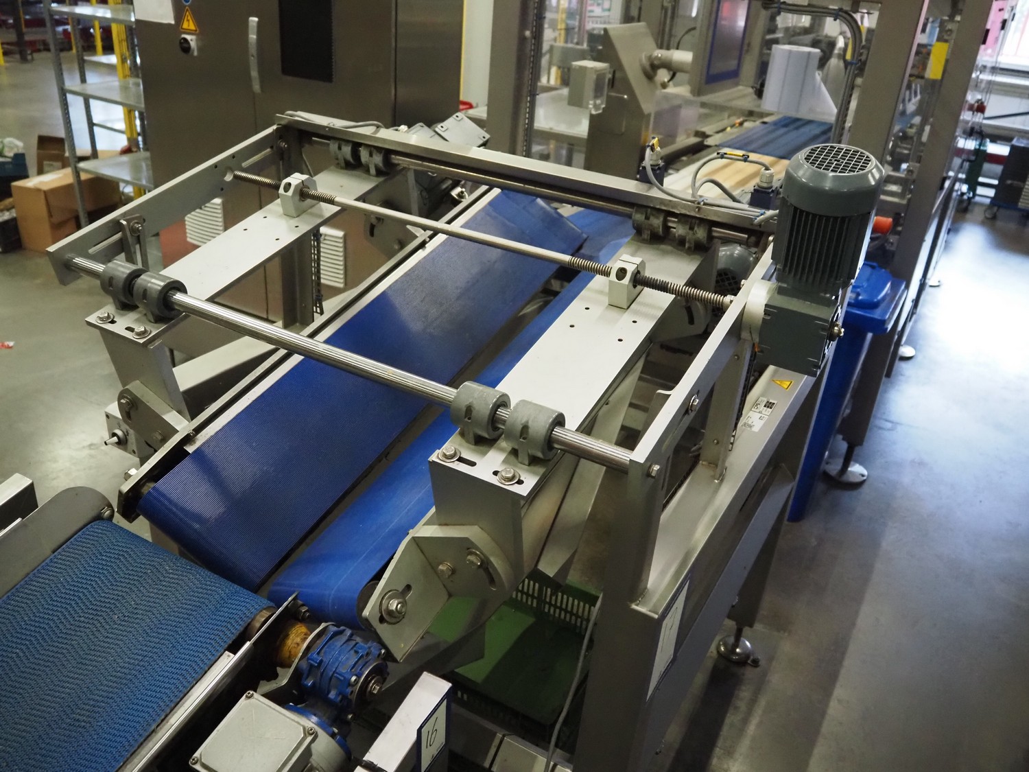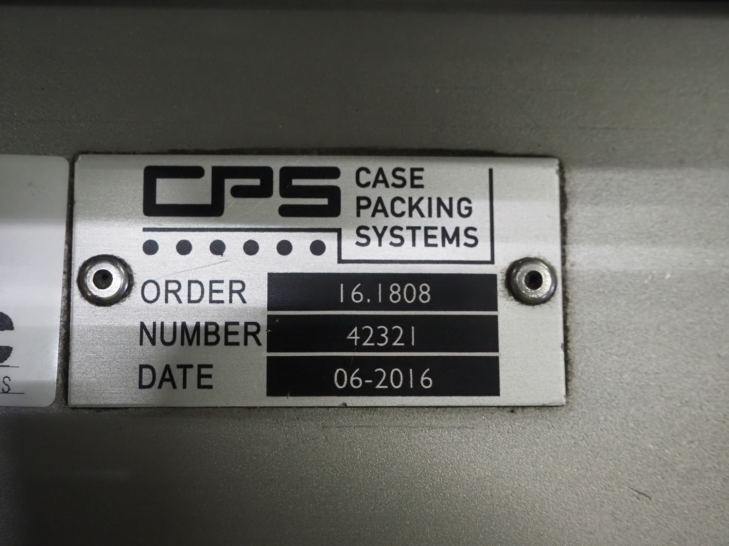 CPS Case Packing Systems buffer belt, number: 42321, year of construction: 06-2016, plastic belt, belt width: (2x) 200 mm and 450 mm, total dimensions: 1550 mm x 980 mm x 1840 mm.