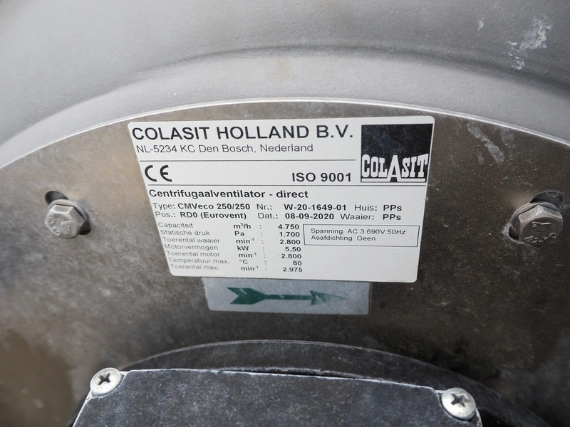 Colasit Holland B.V. blowers, type: CMVeco 250/250, number: W-20-1649-01, capacity: 4750 m³ per hour, dimensions: 800 mm x 700 mm x 810 mm.