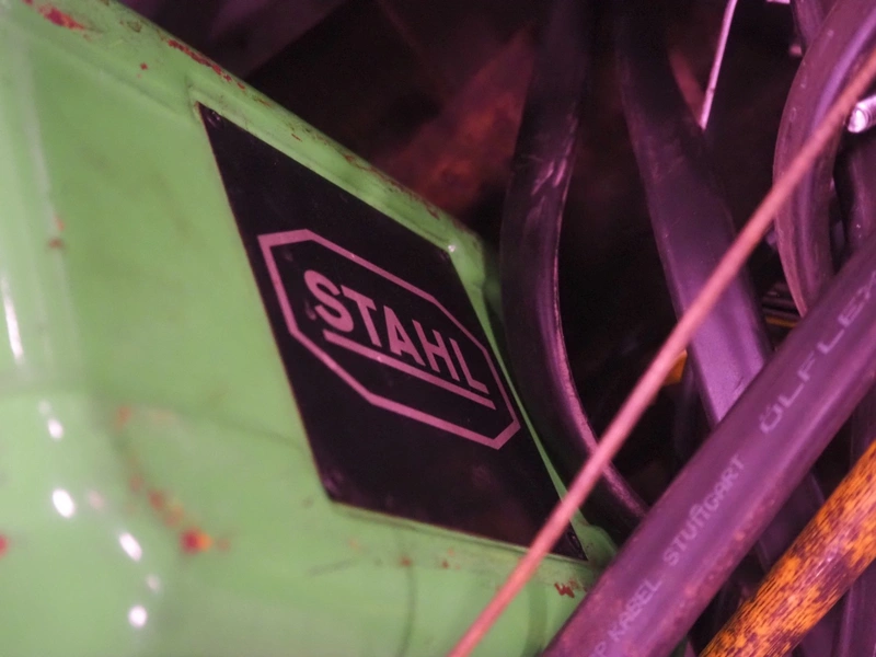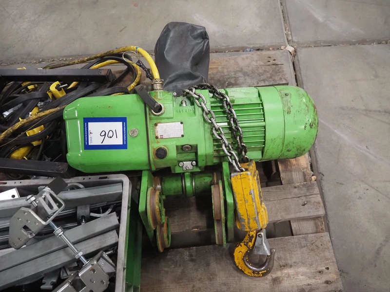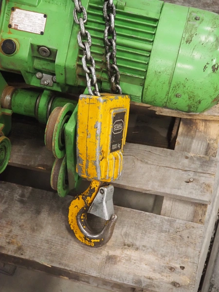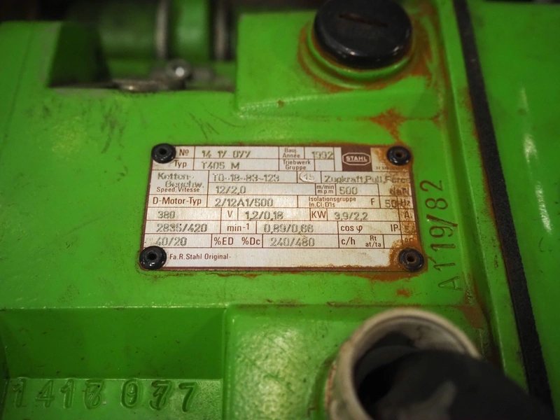 Stahl electrical chain hoist, type: T405M, number: 1417077, year of construction: 1992, 380 V, 50 Hz, 3.9/2.2 A, 1.2/0.18 kW, dimensions: 650 mm x 500 mm x 300 mm.