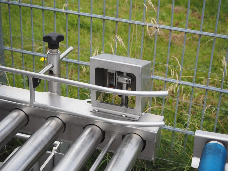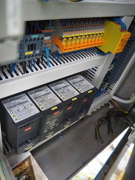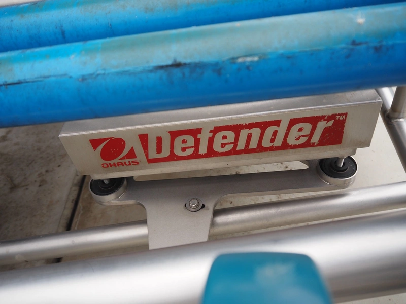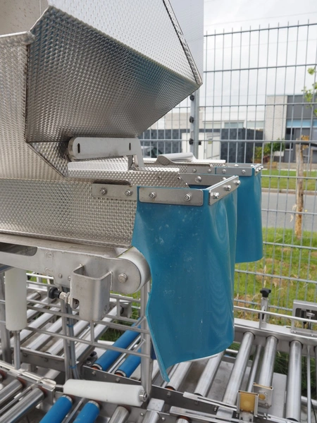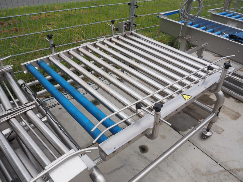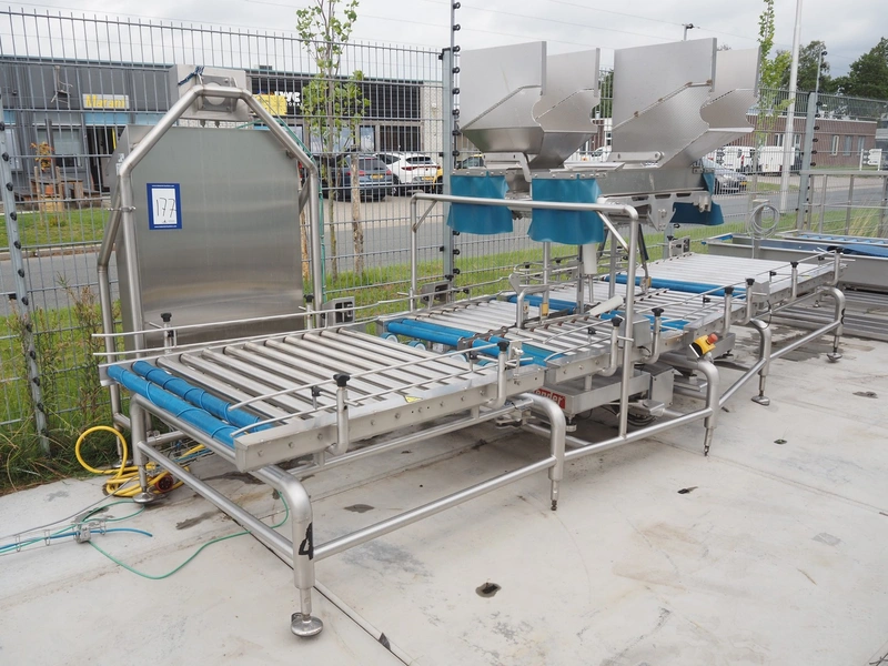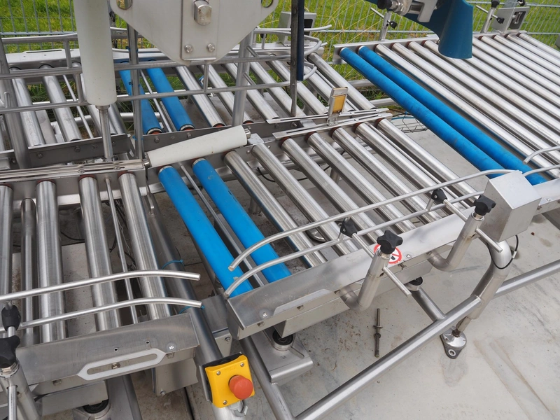 Lumacon automatic crate filling line, type: YC-3, serial number: 21-00054-021, year of construction: 2021, 380 V, 4 Ohaus weighing scales, s/s and plastic rollers, roller width: 500 mm, plastic belt, belt width: 300 mm, total dimensions: 4650 mm x 2000 mm x 2000 mm.