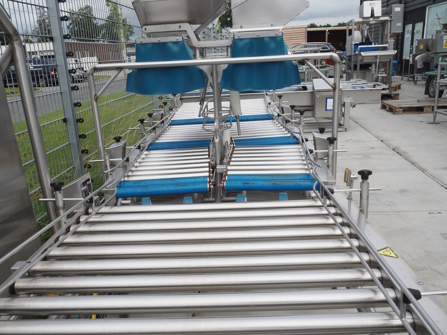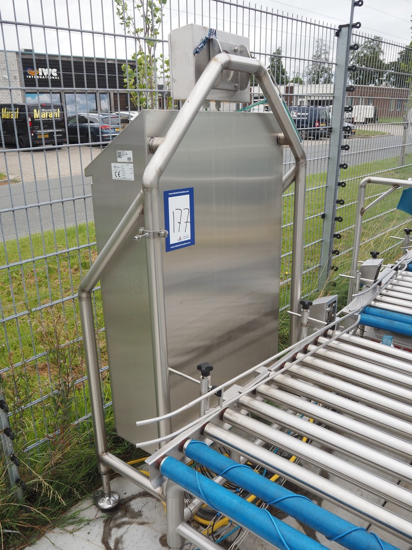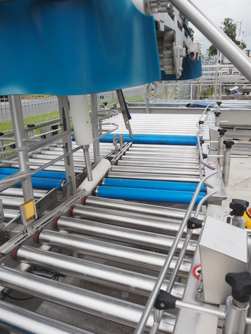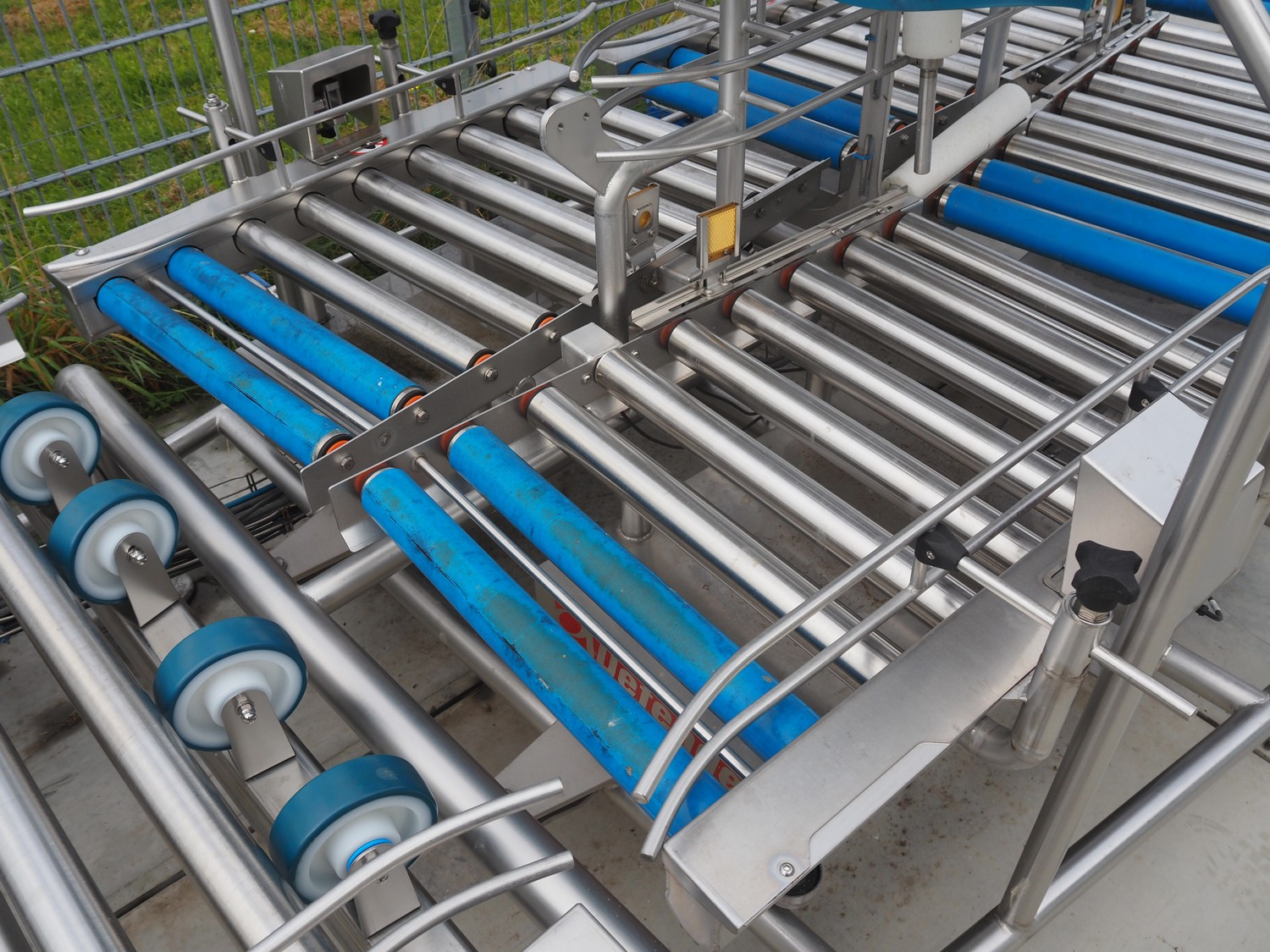 Lumacon automatic crate filling line, type: YC-3, serial number: 21-00054-021, year of construction: 2021, 380 V, 4 Ohaus weighing scales, s/s and plastic rollers, roller width: 500 mm, plastic belt, belt width: 300 mm, total dimensions: 4650 mm x 2000 mm x 2000 mm.