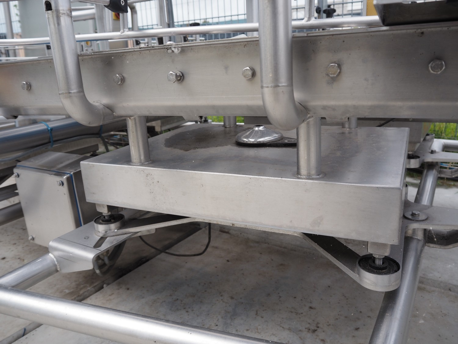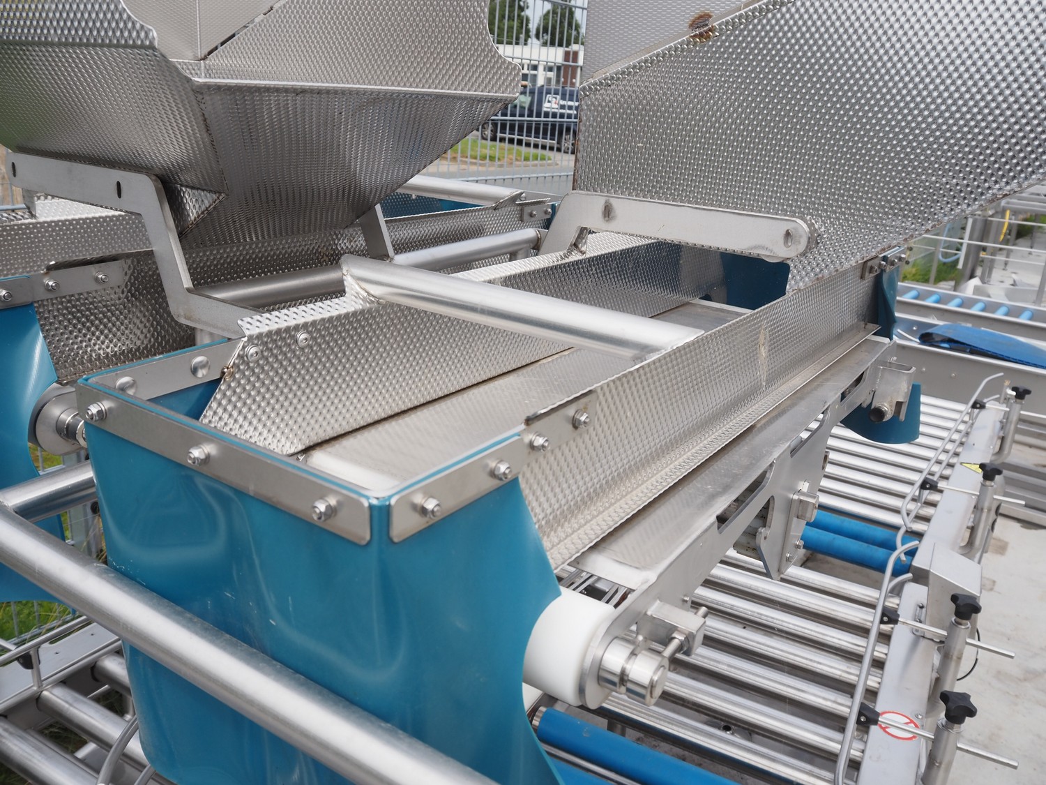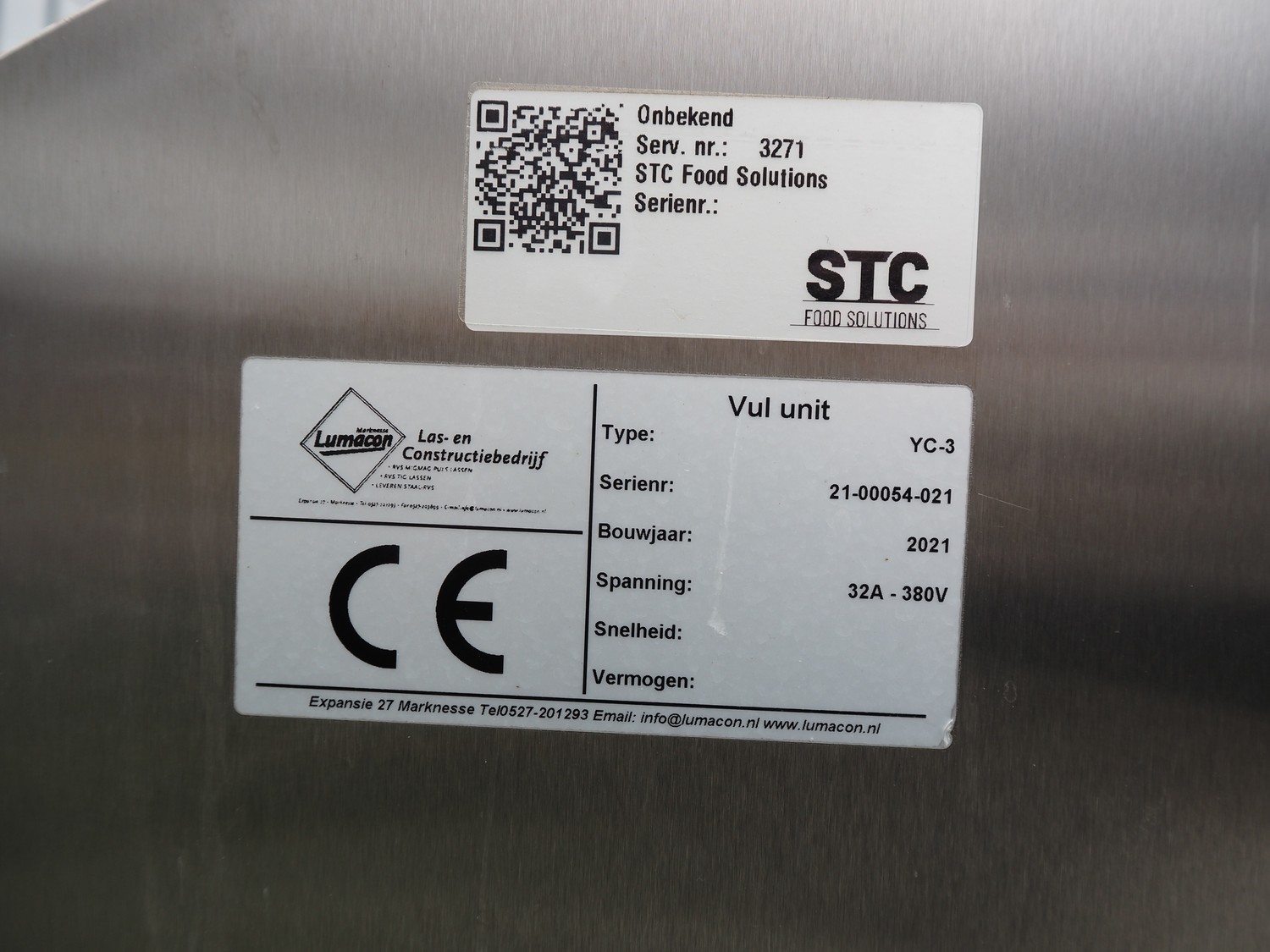 Lumacon automatic crate filling line, type: YC-3, serial number: 21-00054-021, year of construction: 2021, 380 V, 4 Ohaus weighing scales, s/s and plastic rollers, roller width: 500 mm, plastic belt, belt width: 300 mm, total dimensions: 4650 mm x 2000 mm x 2000 mm.
