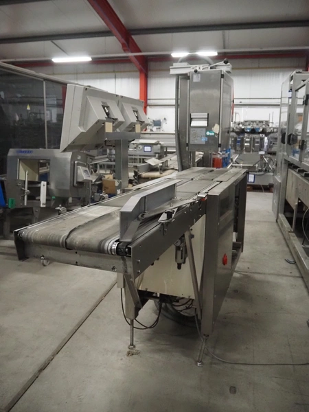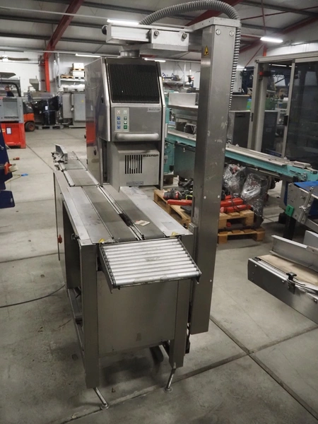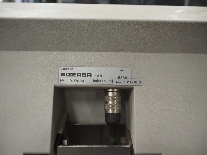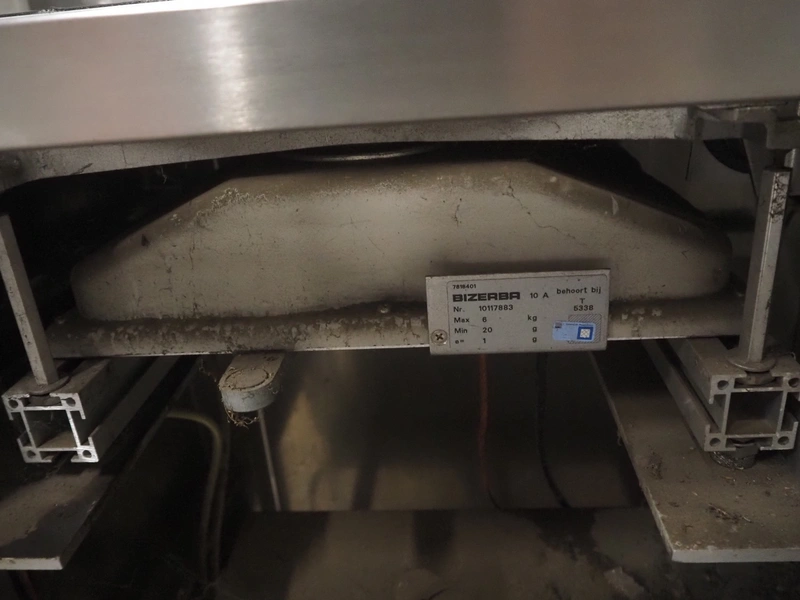 Bizerba weighing and labelling machine, model: GS, number: 10117883, 230 V, 50 Hz, 2.4 A, maximum: 6 kg, minimum: 20 gram, e = 1 gram, plastic belt, belt width: (2x) 135 mm, (2x) 90 mm, total dimensions: 2620 mm x 630 mm x 1090 mm.