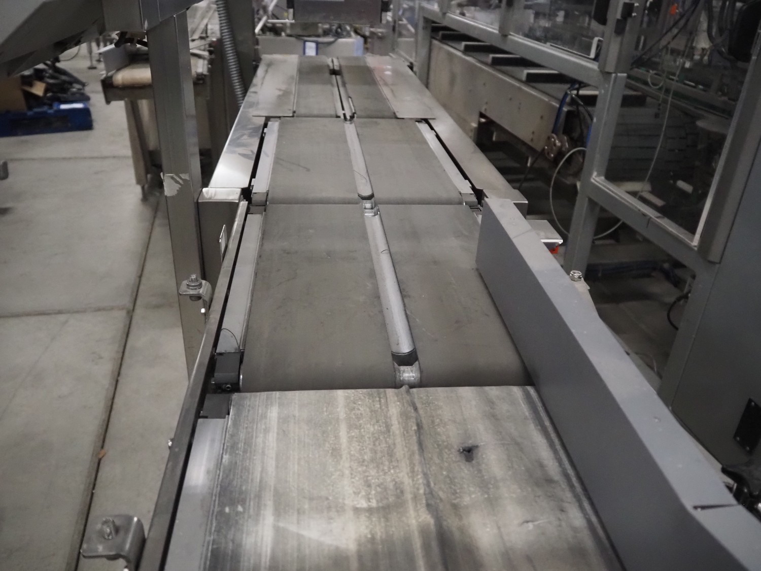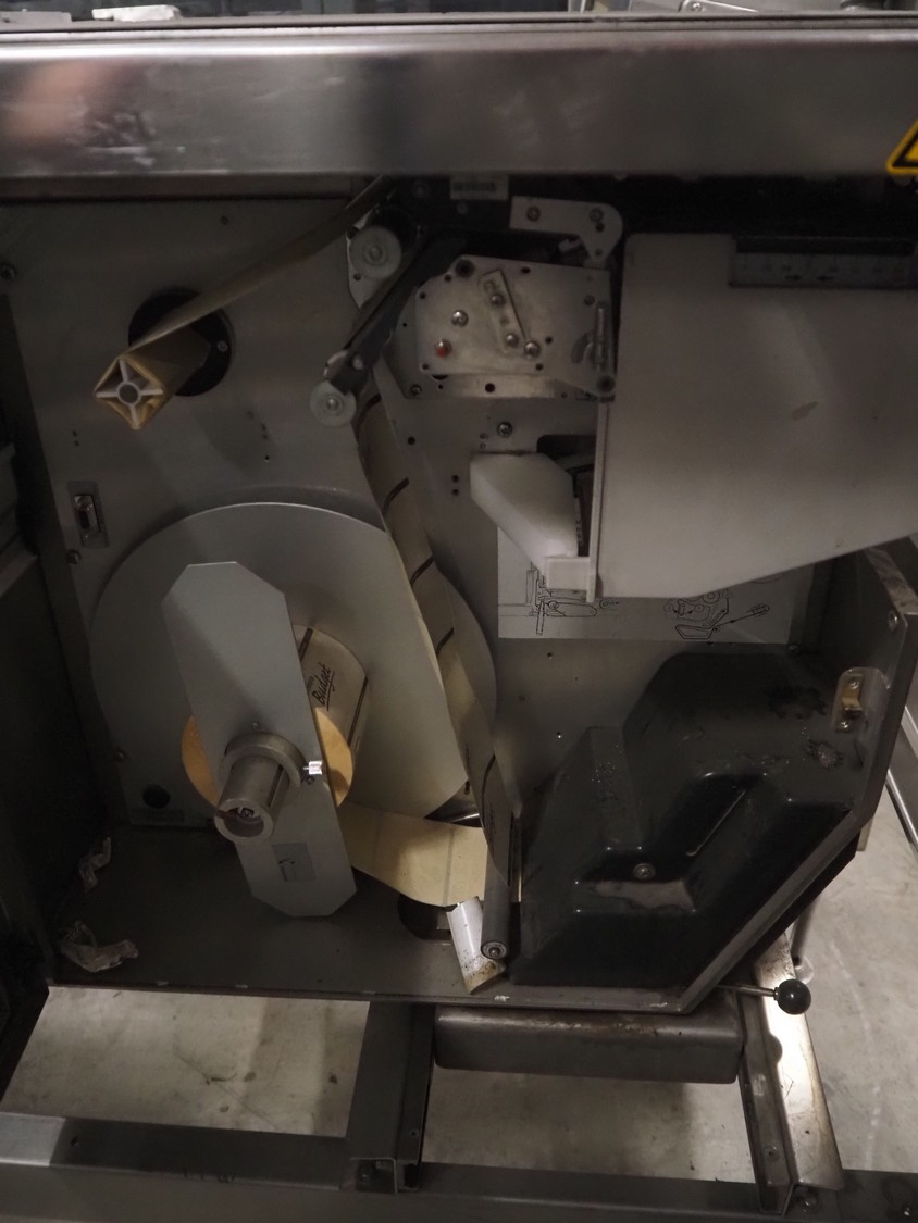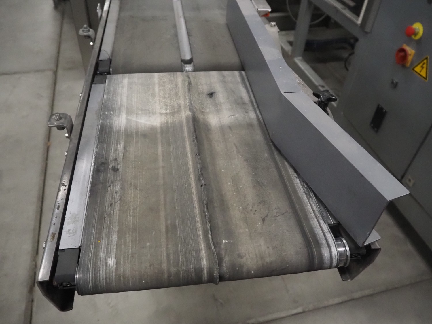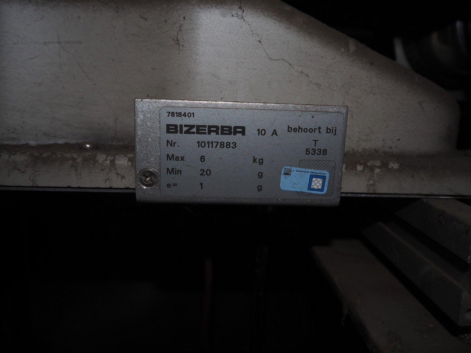Bizerba weighing and labelling machine, model: GS, number: 10117883, 230 V, 50 Hz, 2.4 A, maximum: 6 kg, minimum: 20 gram, e = 1 gram, plastic belt, belt width: (2x) 135 mm, (2x) 90 mm, total dimensions: 2620 mm x 630 mm x 1090 mm.
