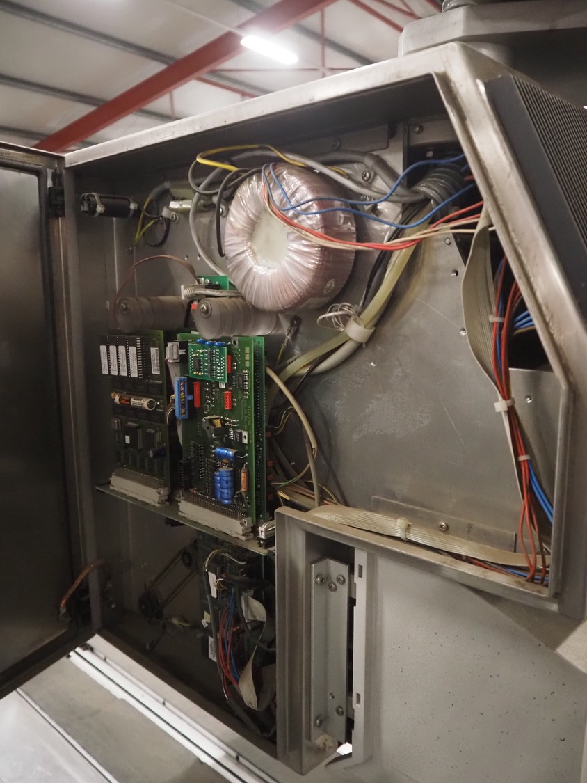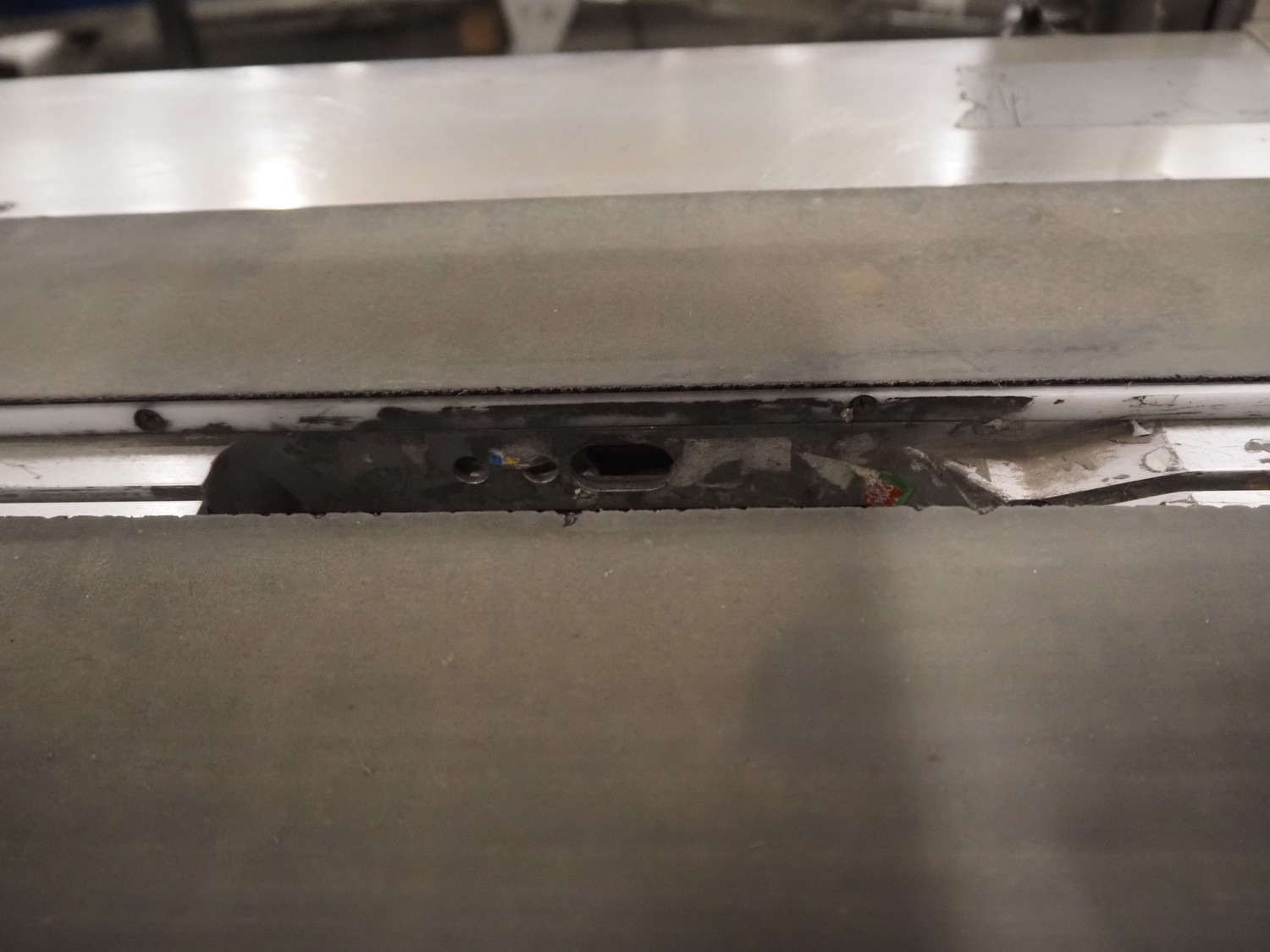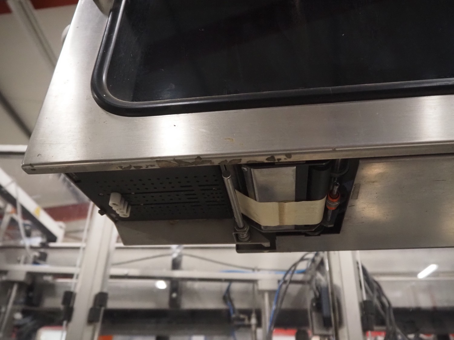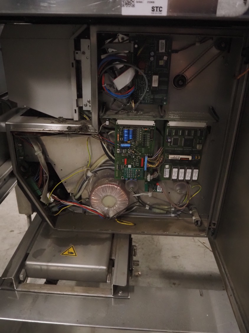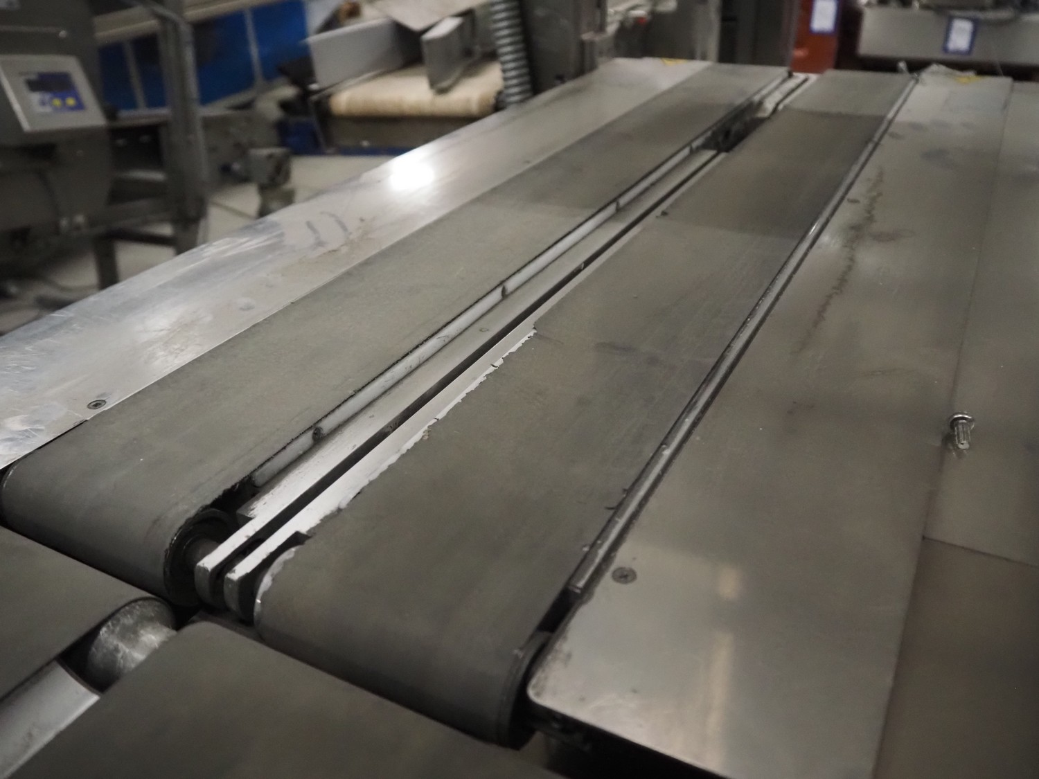 Bizerba weighing and labelling machine, model: GS, number: 10117883, 230 V, 50 Hz, 2.4 A, maximum: 6 kg, minimum: 20 gram, e = 1 gram, plastic belt, belt width: (2x) 135 mm, (2x) 90 mm, total dimensions: 2620 mm x 630 mm x 1090 mm.