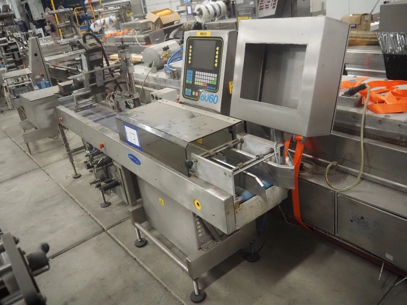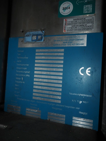 AEW Delford checkweighing and labelling machine, type: 8060, fabrication number: 86229, year of construction: 2006, 230 V, 50 Hz, maximum weight: 4000 gram, minimum weight: 40 gram, e=: 2 gram, T= -1000 gram, capacity: 100 pieces per minute, top and bottom labeller, plastic belt, belt width: (2x) 90 mm and (1x) 195 mm, total dimensions: 1200 mm x 700 mm x 1600 mm and 1500 mm x 680 mm x 2000 mm. Missing screen.
