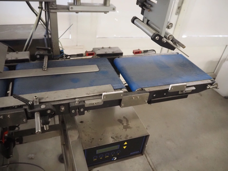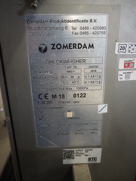 Zomerdam checkweighing and labelling machine with 3 top labellers and 1 bottom labeller, type checkweigher: DCW- 0.5/1, fabrication number: 3682-1, year of construction: 2018, 230 V, 50 Hz, maximum weight: 0.125 - 1.2 kg, minimum weight: 40 gram, d = e = 0.5 / 1 gram, belt width: 200 mm, total dimensions: 4520 mm x 1150 mm x 2000 mm.