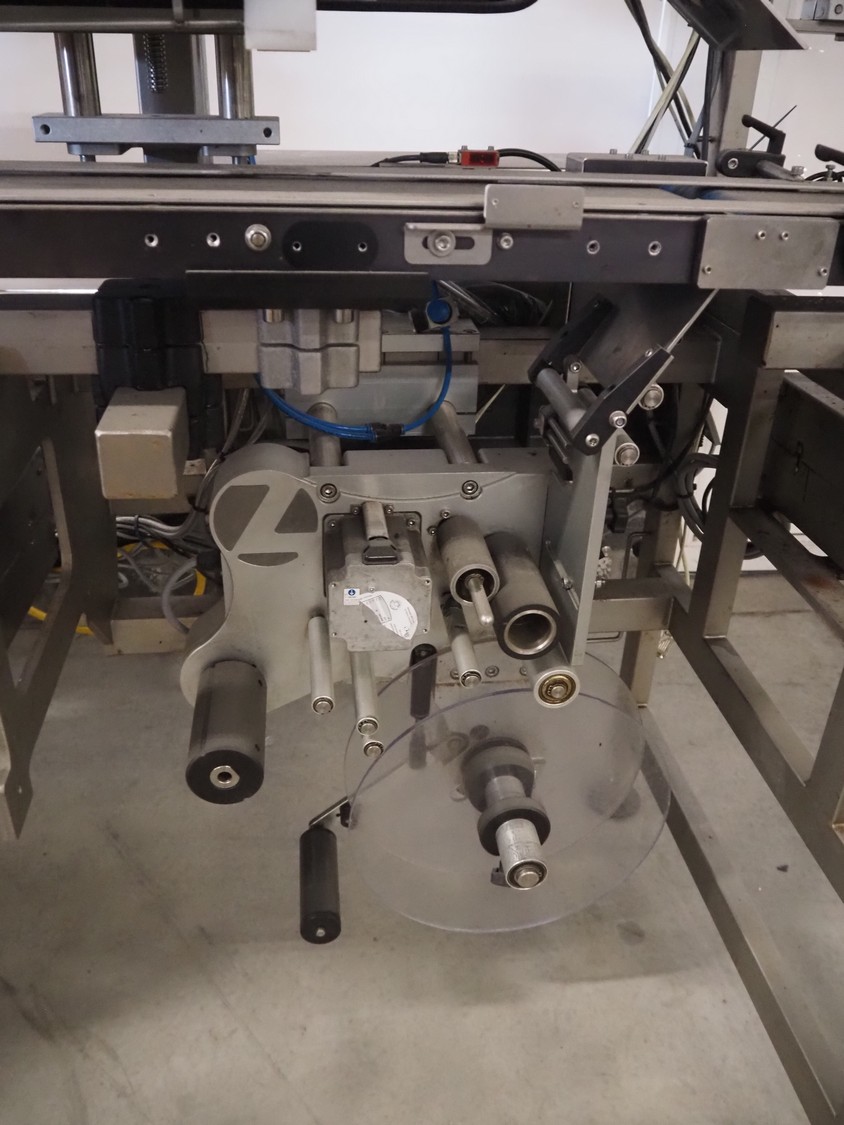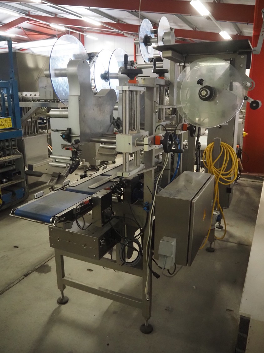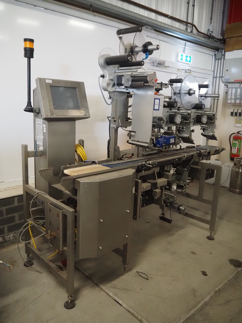 Zomerdam checkweighing and labelling machine with 3 top labellers and 1 bottom labeller, type checkweigher: DCW- 0.5/1, fabrication number: 3682-1, year of construction: 2018, 230 V, 50 Hz, maximum weight: 0.125 - 1.2 kg, minimum weight: 40 gram, d = e = 0.5 / 1 gram, belt width: 200 mm, total dimensions: 4520 mm x 1150 mm x 2000 mm.