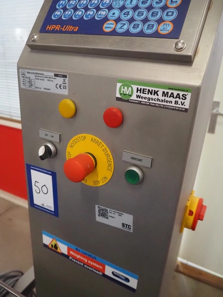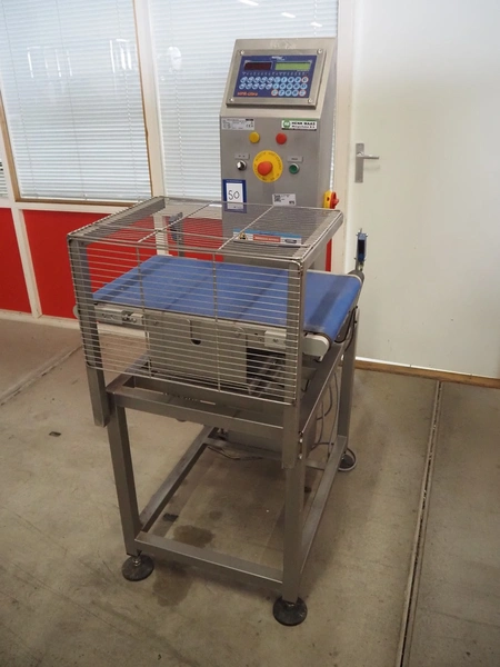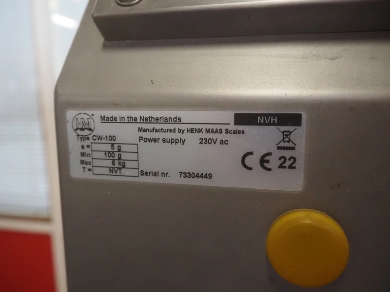 HENK MAAS Scales checkweigher, type: CW-100, serial number: 73304449, 230 V, maximum: 6 kg, minimum: 100 gram, e - 5 gram, total dimensions: 820 mm x 650 mm x 1510 mm.