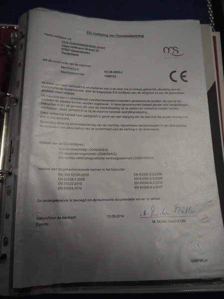 OCS checkweigher, type: HC, serial number: 1006720, year of construction: 2014, 230 V, 50 Hz, e = 0.5 g, d = 0.5 g, minimum weight: 20 g, maximum weight: 3750 g, capacity: 100 pcs/min, plastic belt, belt width: 300 mm, total dimensions: 1550 mm x 750 mm x 1520 mm.